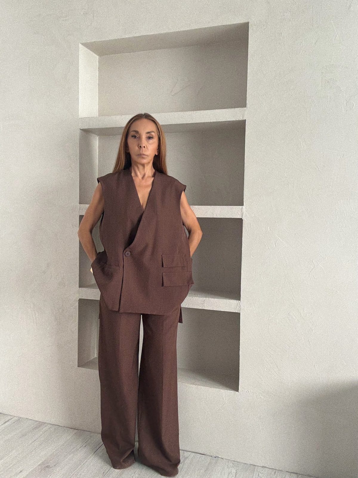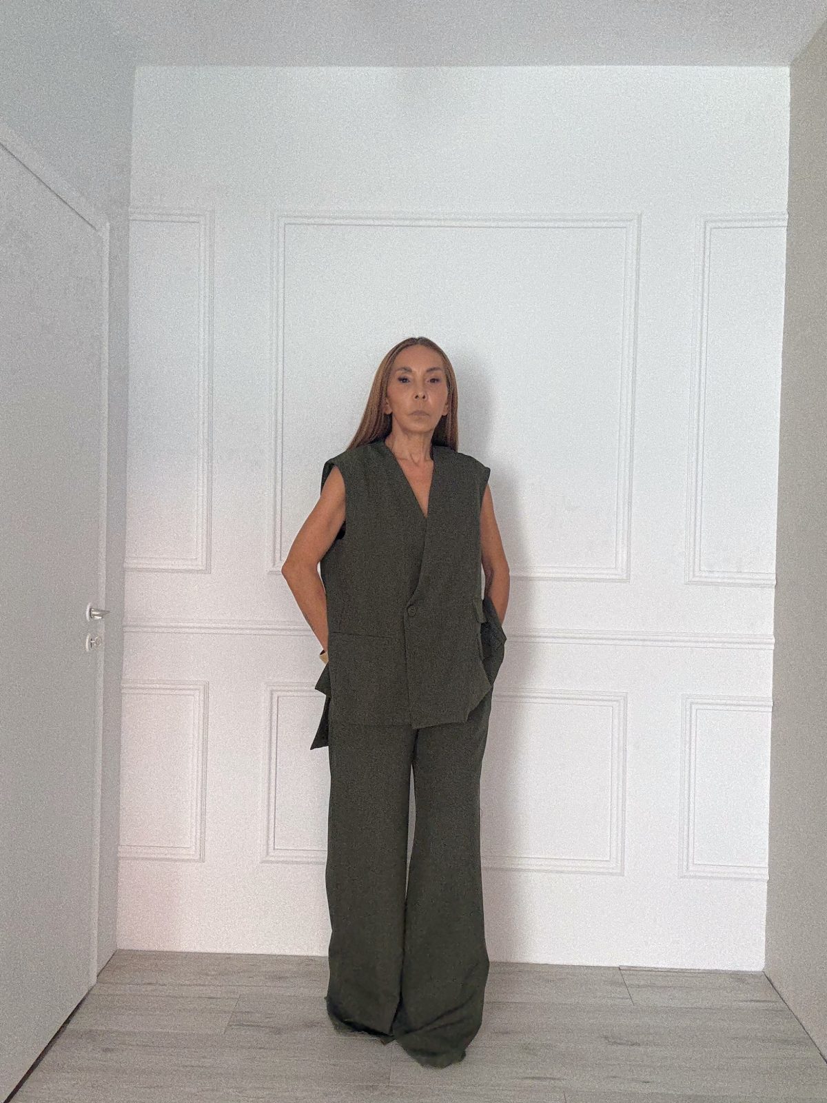 Ένα minimal ανδρόγυνο look με oversized γιλέκο και ίσιο παντελόνι, σε αποχρώσεις που κινούνται ανάμεσα στο χακί και το καφέ. Η καθαρή γεωμετρική γραμμή και η χαλαρή σιλουέτα προσφέρουν άνεση και κομψότητα, ενώ το ουδέτερο χρώμα λειτουργεί σαν καμβάς για αξεσουάρ ή πιο έντονα παπούτσια.