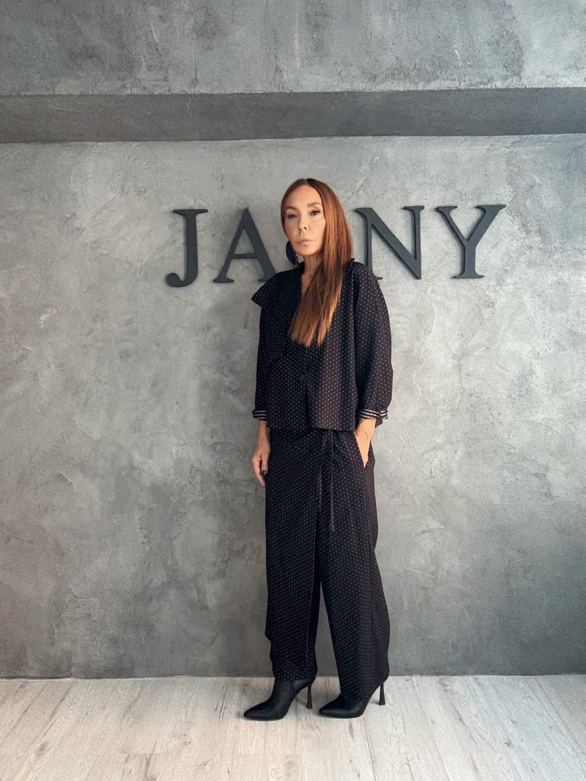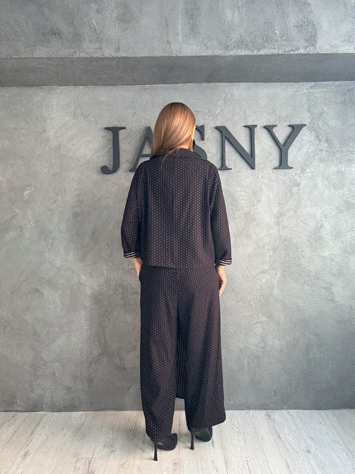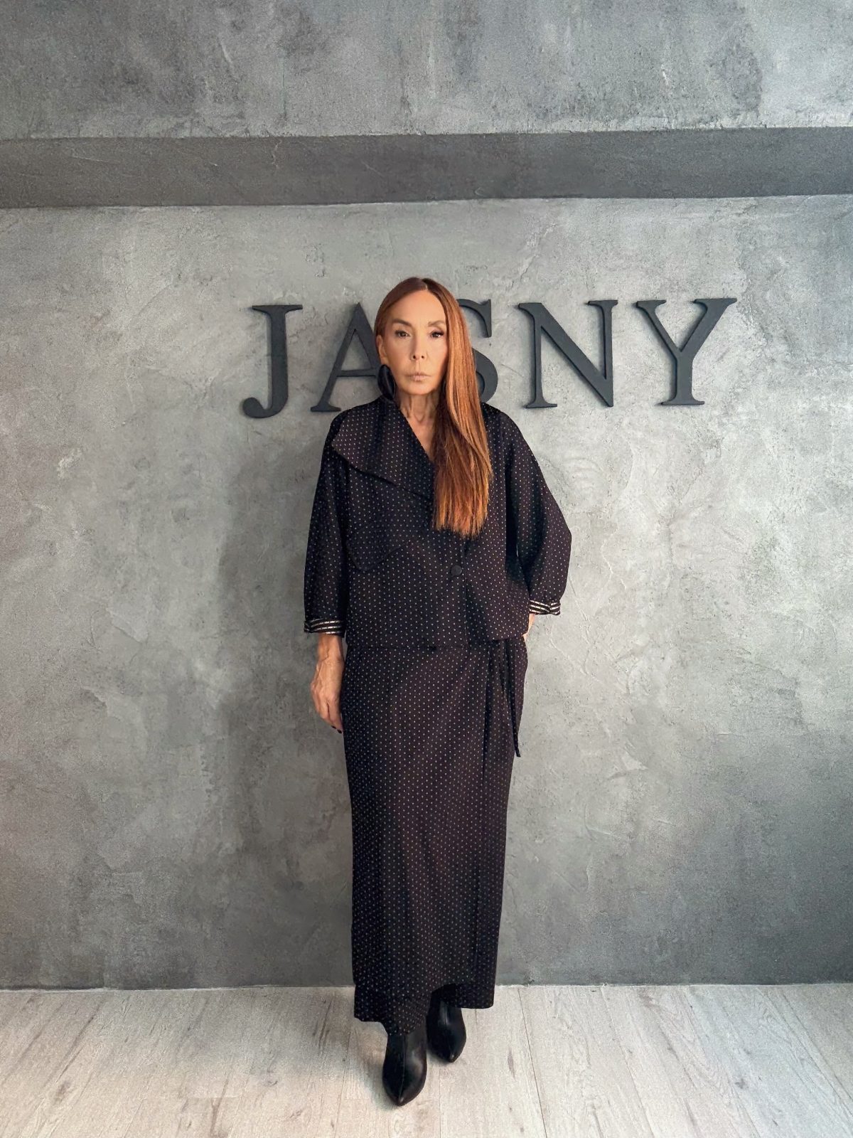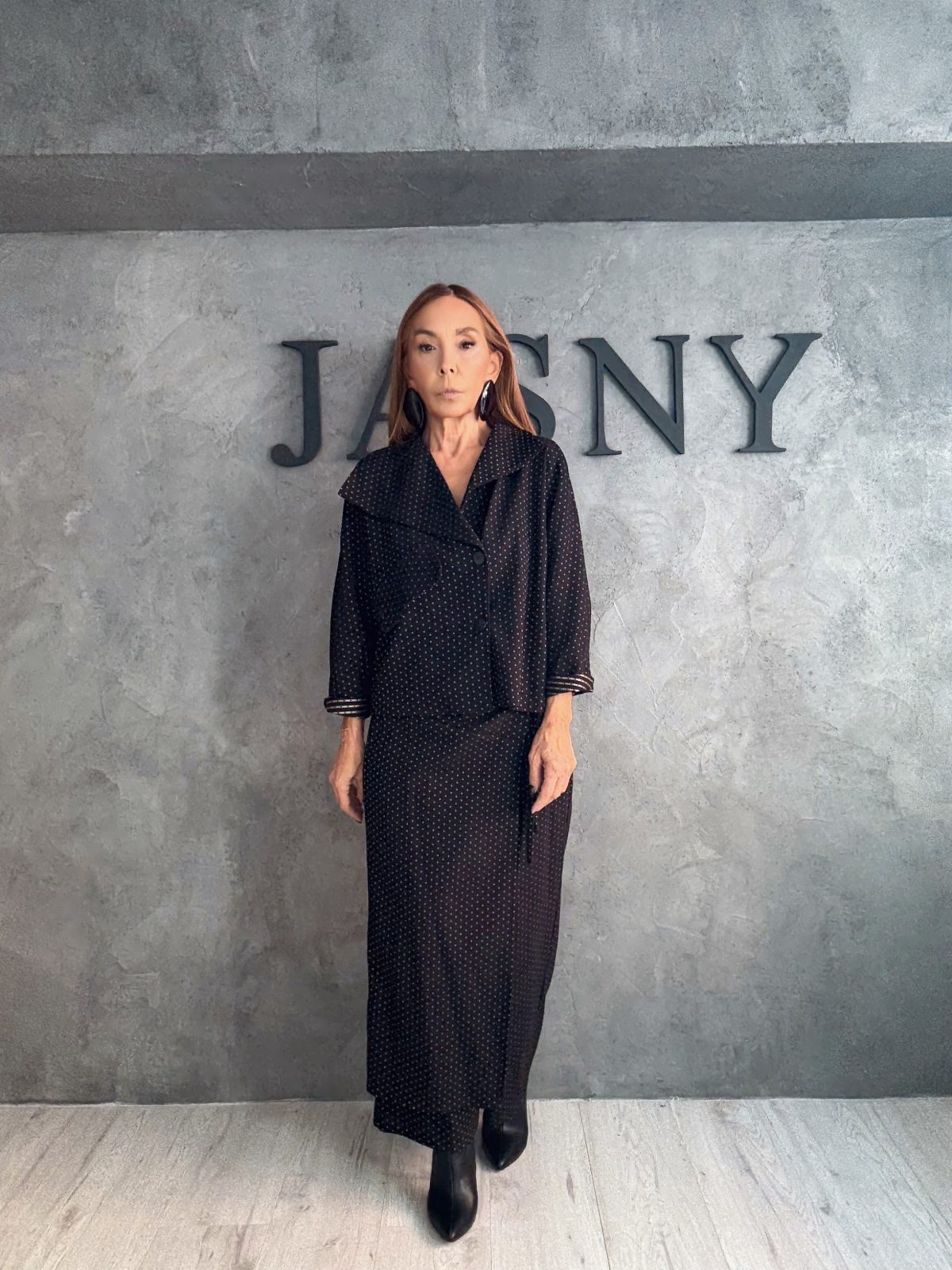 Ένα total look που συνδυάζει το διακριτικό micro–polka dot μοτίβο με τη ρευστή κομψότητα του μαύρου. Το χαλαρό τοπ με τον γιακά και η ίσια maxi παντελονόφουστα δημιουργούν μια αίσθηση ισορροπίας και διακριτικής φινέτσας, ενώ τα μαύρα ankle boots προσθέτουν μια urban δυναμική. Ένα look ιδανικό για γυναίκες που αγαπούν τον συνδυασμό minimal αισθητικής με διαχρονική κομψότητα.
