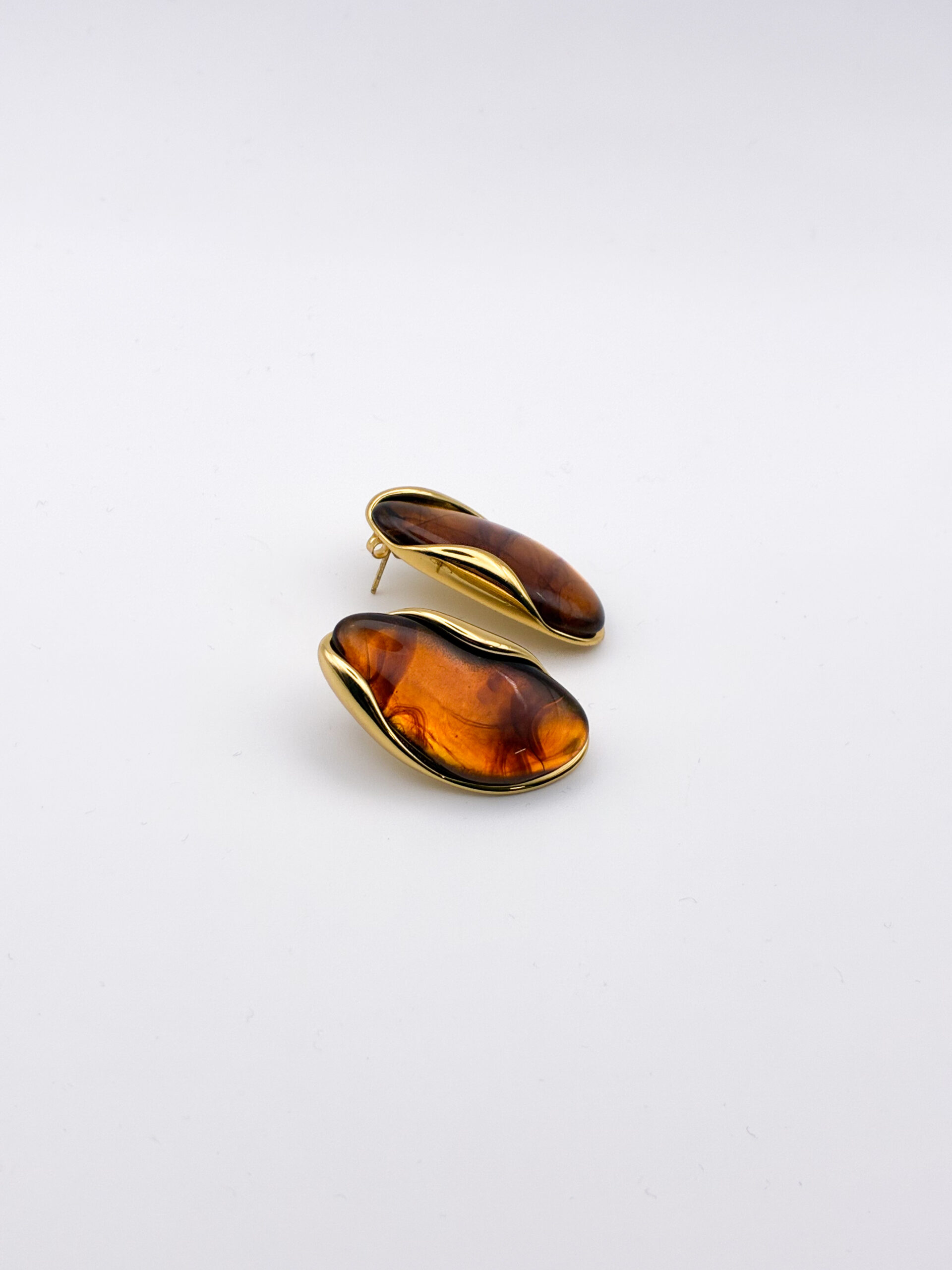 Minimal σκουλαρίκια σε οβάλ φόρμα με μελί–κεχριμπαρένια απόχρωση και γυαλιστερό φινίρισμα, πλαισιωμένα από λεπτό χρυσό περίγραμμα. Οι φυσικές νεράδες του υλικού δημιουργούν βάθος και ζεστασιά, χαρίζοντας στο κόσμημα έναν διαχρονικό αλλά σύγχρονο χαρακτήρα που φοριέται εύκολα από το πρωί έως το βράδυ.