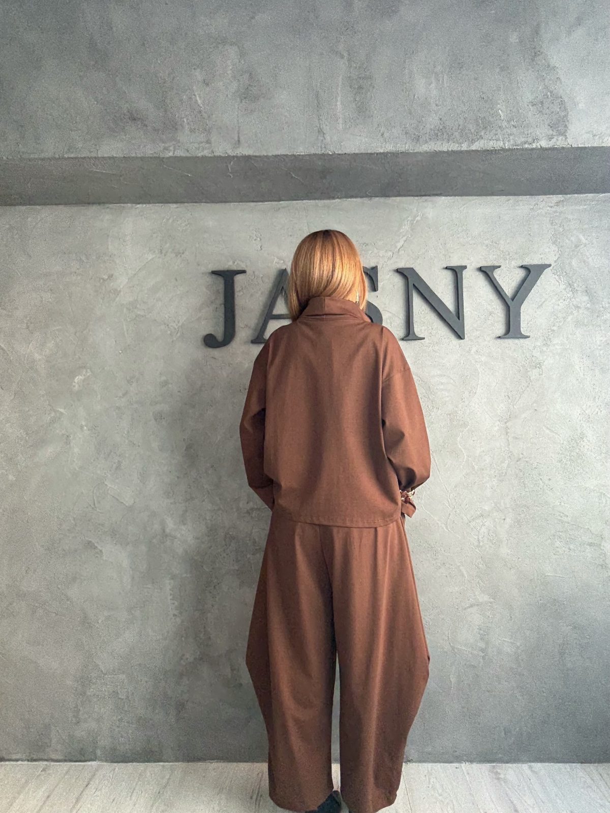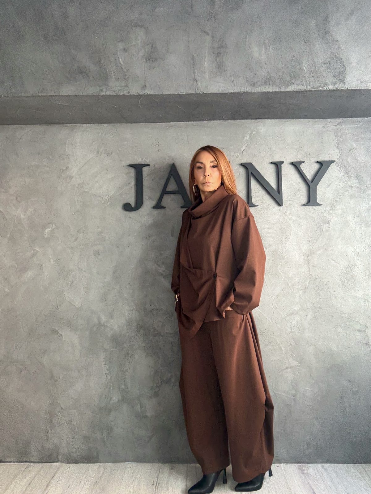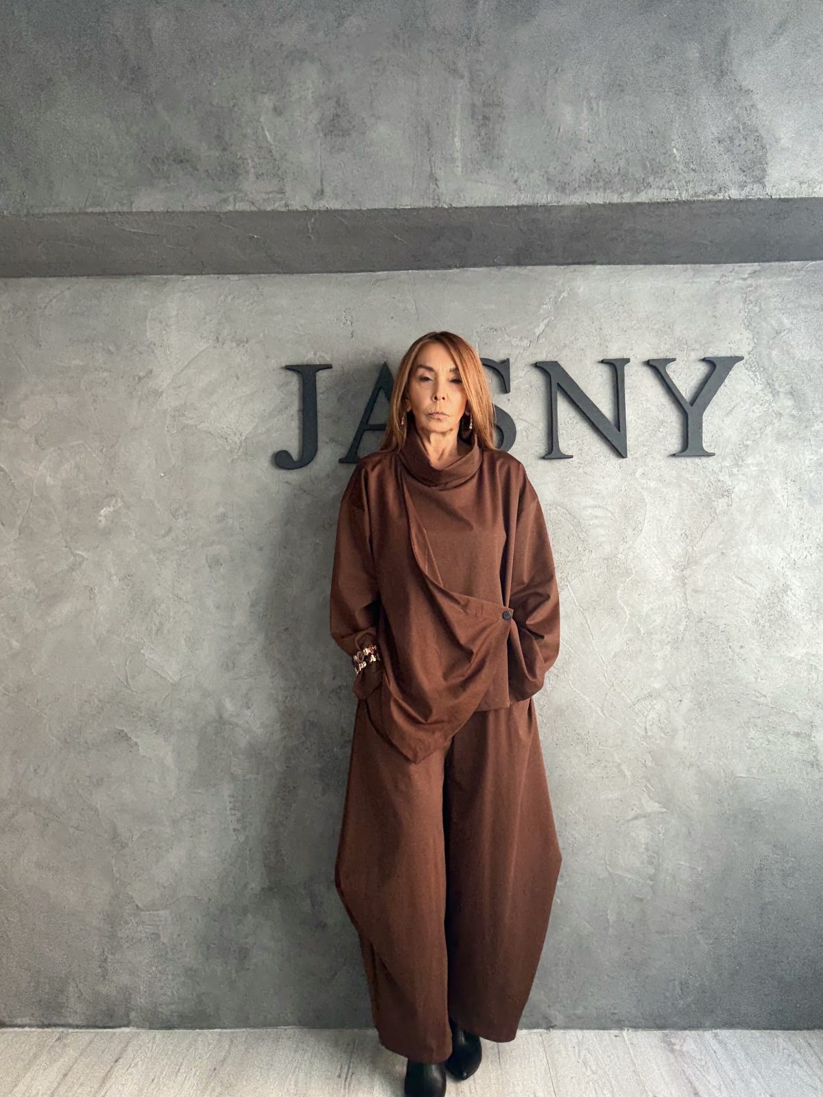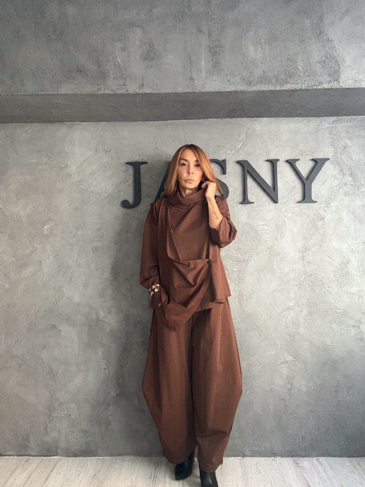 Ένα total look σε γήινες καφέ αποχρώσεις που συνδυάζει minimal αισθητική με αρχιτεκτονική έμπνευση. Το ασύμμετρο top με ιδιαίτερες πιέτες και το balloon παντελόνι δημιουργούν sculptural σιλουέτα, προσφέροντας μια σύγχρονη ερμηνεία της χαλαρής κομψότητας. Το αποτέλεσμα είναι μοντέρνο, αβίαστα καλλιτεχνικό και ταυτόχρονα πρακτικό για πολλές περιστάσεις.