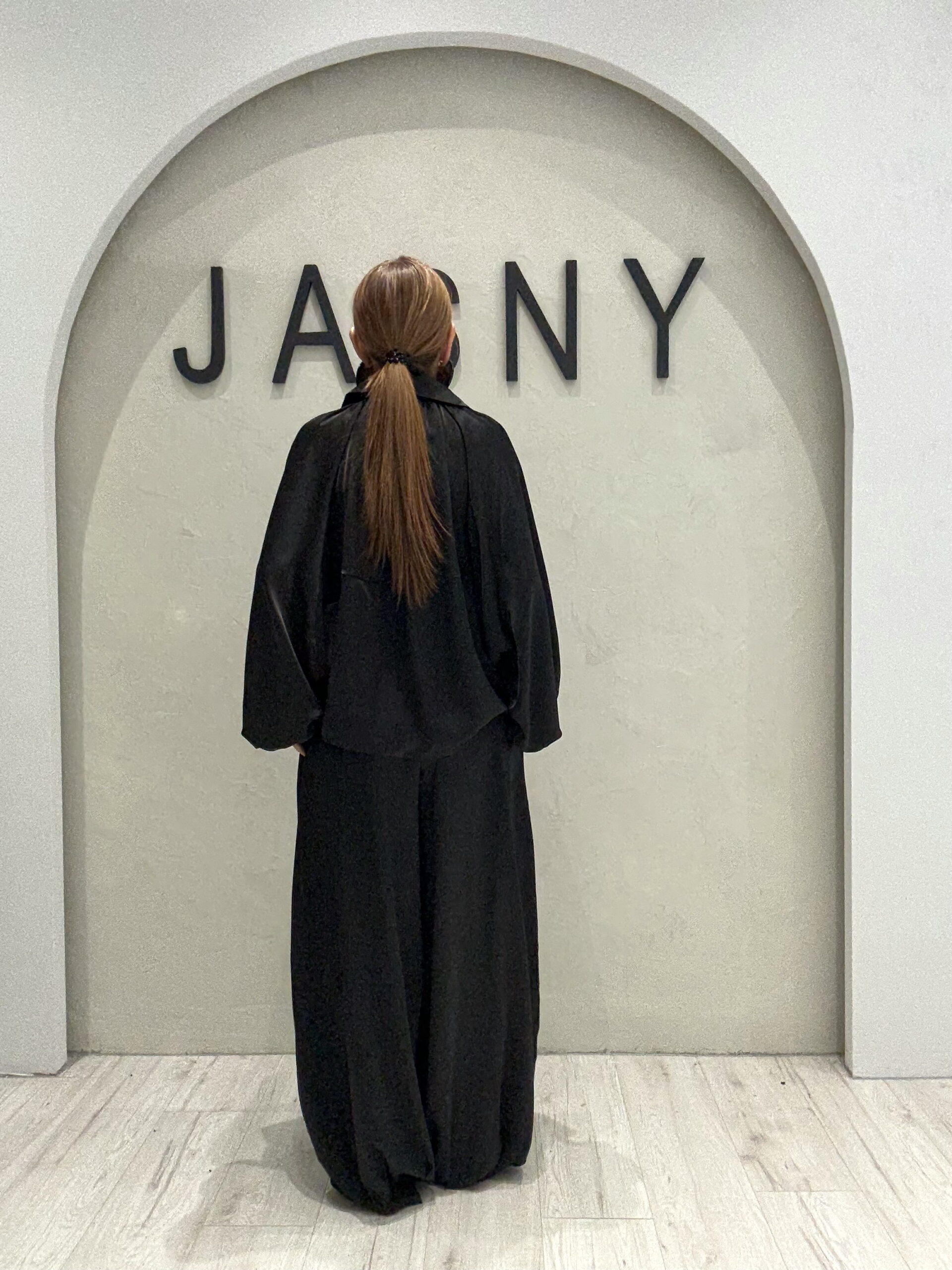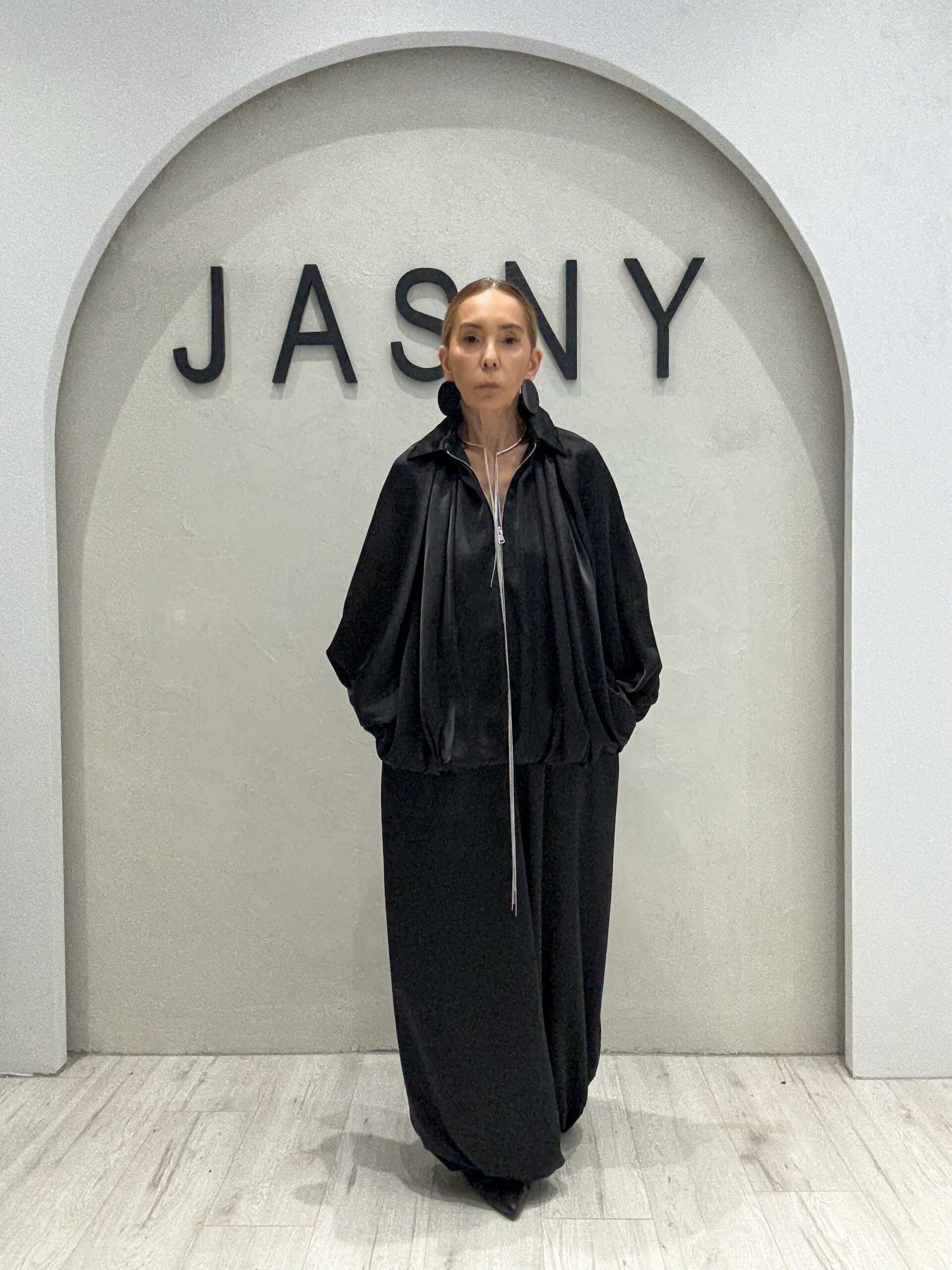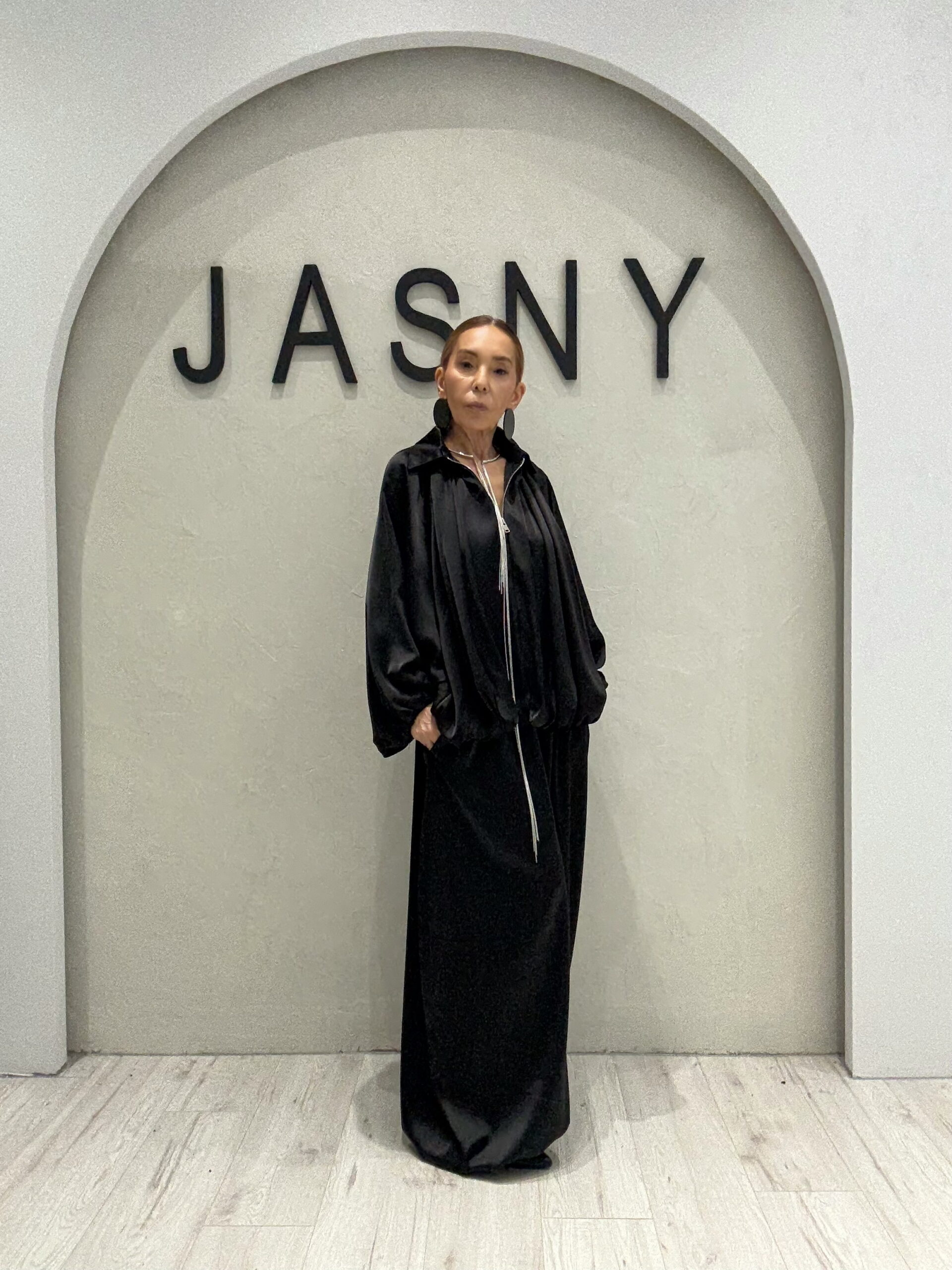 Μαύρο σατέν κομμάτι με έντονο όγκο και δραματική κίνηση, σχεδιασμένο για να δημιουργεί αίσθηση παρουσίας με τον πιο ήσυχο τρόπο. Το ύφασμα «δουλεύει» με το φως, δίνοντας διακριτικά λάμψη και βάθος σε κάθε κίνηση, ενώ η φαρδιά, αέρινη φόρμα του προσδίδει sculptural χαρακτήρα.