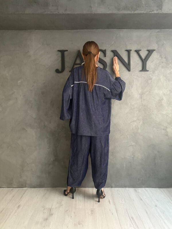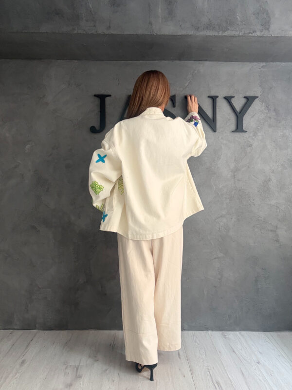 Ένα εντυπωσιακό black & ivory look που συνδυάζει ρομαντική θηλυκότητα με σύγχρονη minimal αισθητική. Το εκρού πουκάμισο με έντονα βολάν στο μπροστινό μέρος δίνει κίνηση και χαρακτήρα, λειτουργώντας ως statement κομμάτι που φωτίζει το σύνολο. Το μαύρο σακάκι σε χαλαρή γραμμή προσθέτει δομή και κομψότητα, ενώ η φαρδιά παντελόνα ολοκληρώνει το look με άνεση και ισορροπία.