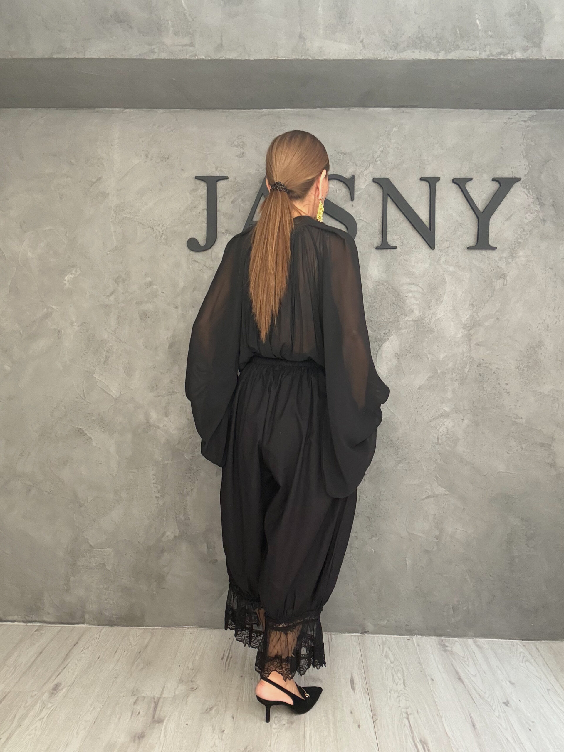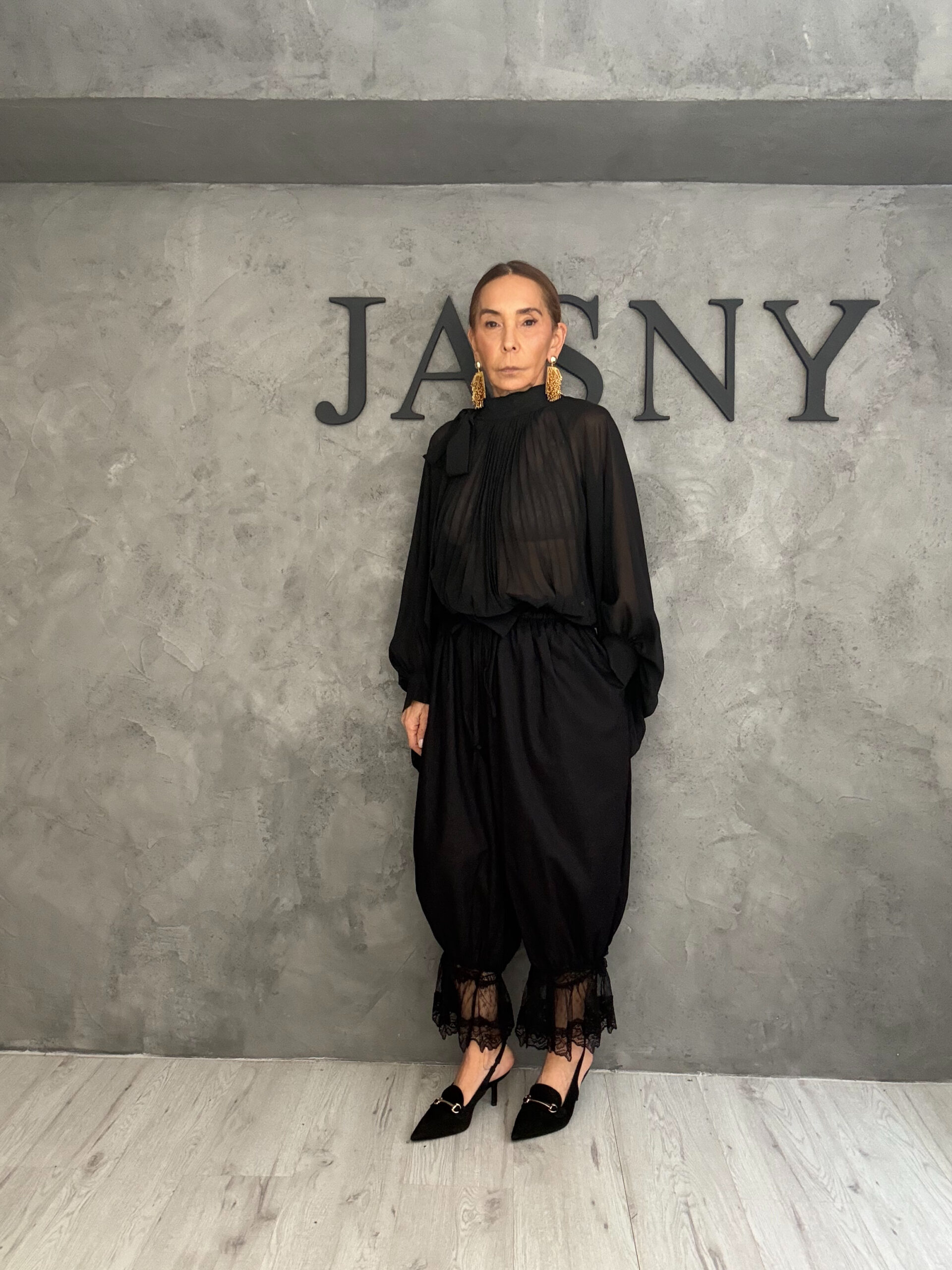 Total black σύνολο με έμφαση λεπτομέρεια. Το επάνω μέρος, με ελαφριά διαφάνεια και καθαρό δέσιμο στον λαιμό, ορίζει το πάνω μέρος του σώματος χωρίς να το βαραίνει. Η χαλαρή εφαρμογή δημιουργεί κίνηση με ελεγχόμενο τρόπο, ενώ το κάτω μέρος διατηρεί δομή και σταθερότητα, ολοκληρώνοντας μια σιλουέτα συγκρατημένη και σύγχρονη.