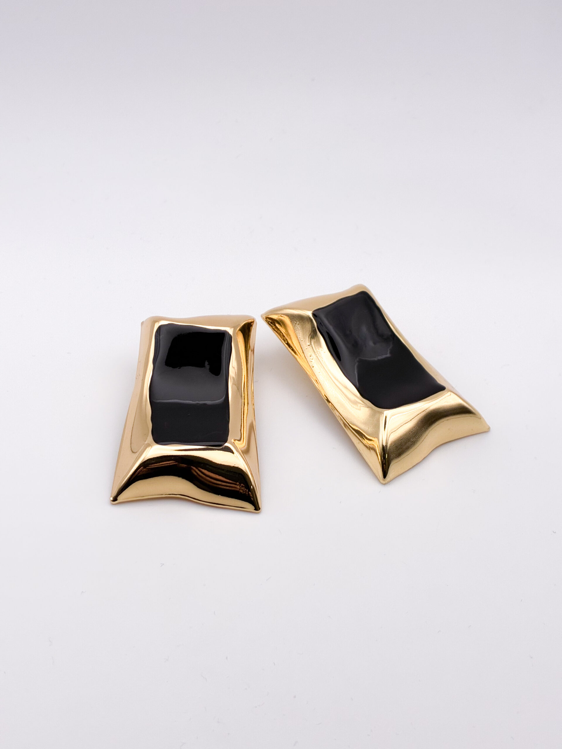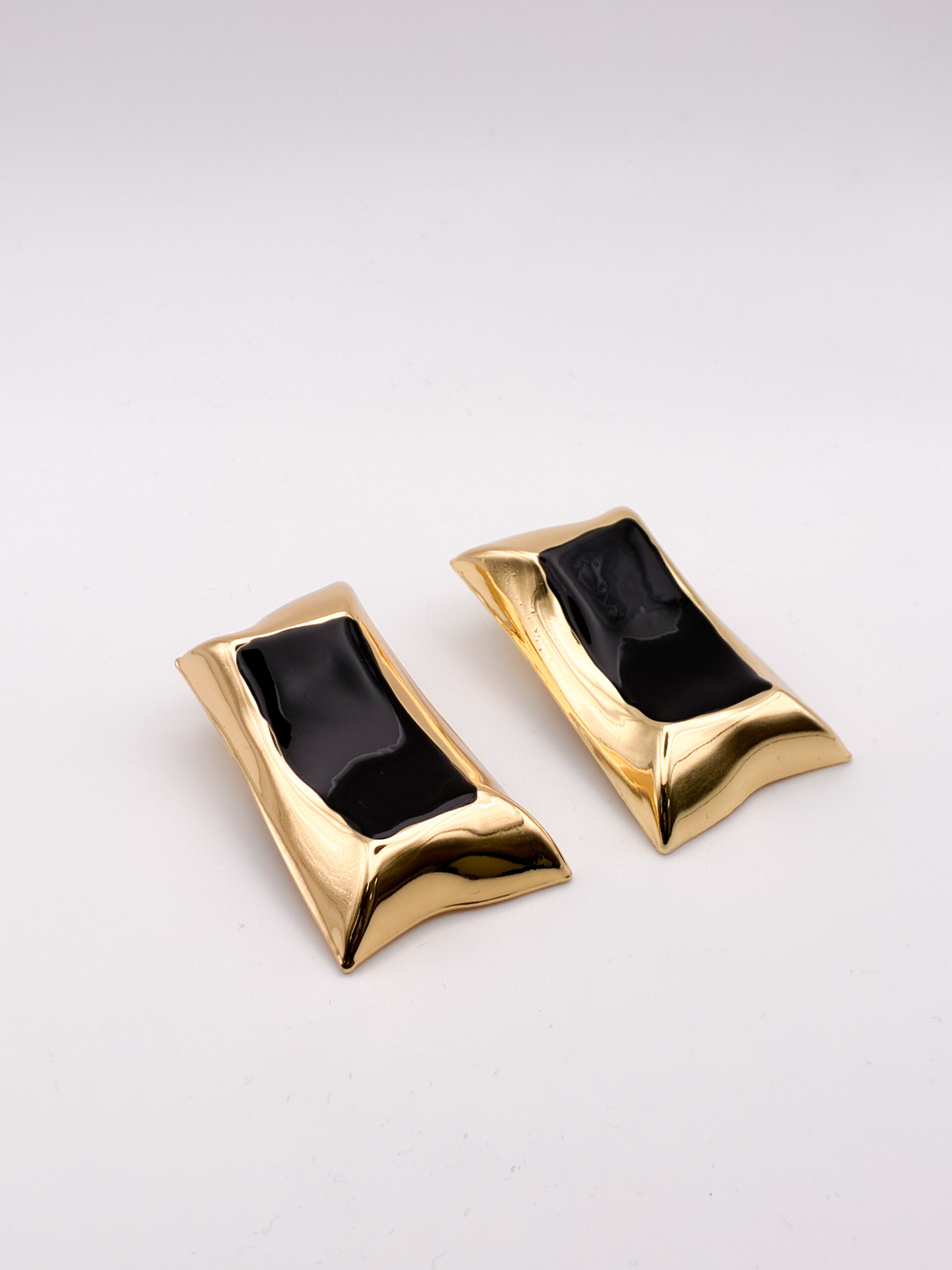 Γλυπτικά σκουλαρίκια με έντονη αρχιτεκτονική φόρμα, όπου το βαθύ μαύρο συναντά το θερμό χρυσό σε μια ισορροπία δύναμης και κομψότητας. Η γυαλιστερή, σχεδόν υγρή επιφάνεια στο κέντρο δημιουργεί βάθος, ενώ το χρυσό περίγραμμα «αγκαλιάζει» τη φόρμα σαν πλαίσιο. Ένα κόσμημα με καθαρό editorial χαρακτήρα, σχεδιασμένο για να λειτουργεί ως statement χωρίς περιττές λεπτομέρειες — δυναμικό, σύγχρονο, απόλυτα JASNY.
