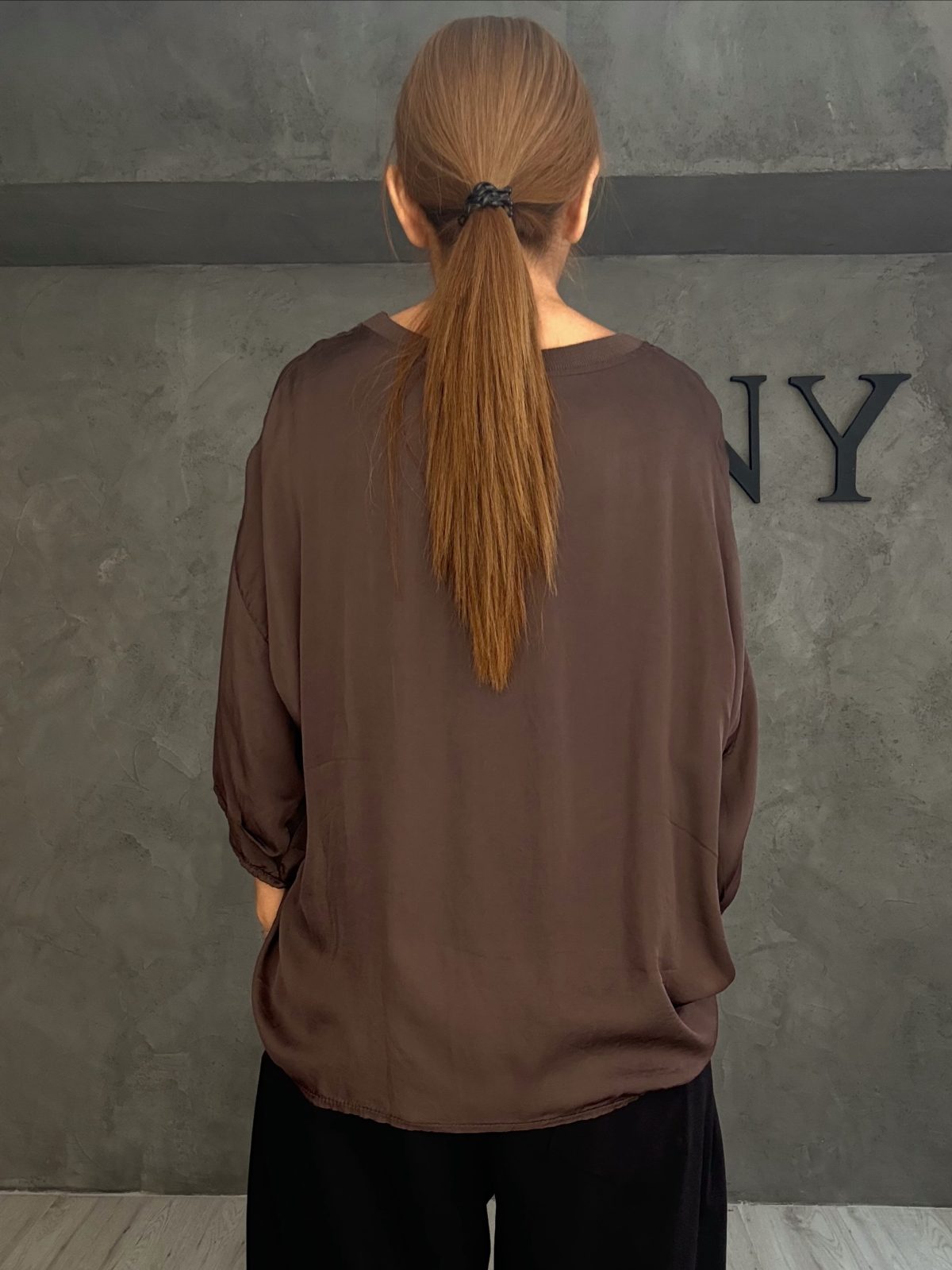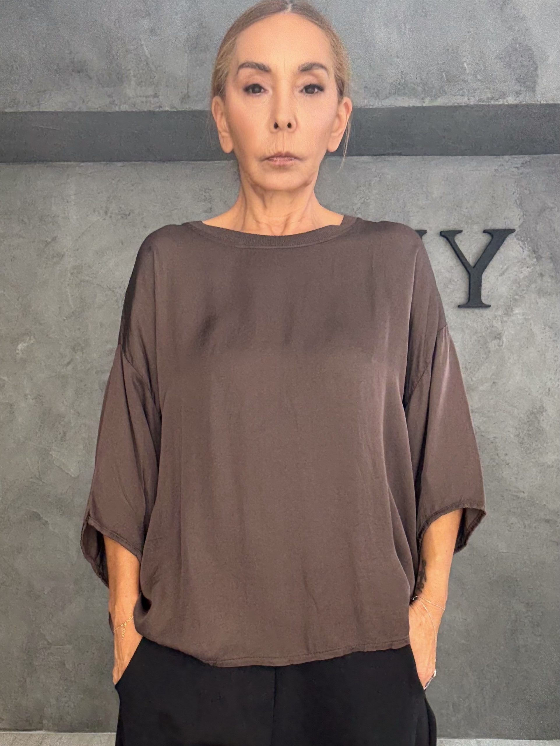 Ένα oversized μπλουζάκι σε σκούρα καφέ απόχρωση, με χαλαρή γραμμή και άνετη εφαρμογή. Διαθέτει χαμηλωμένους ώμους, φαρδιά μανίκια ¾ και στρογγυλή λαιμόκοψη. Το ύφασμα έχει ελαφρώς ματ υφή που προσδίδει μίνιμαλ χαρακτήρα, ιδανικό για καθημερινή αλλά και πιο urban chic εμφάνιση.