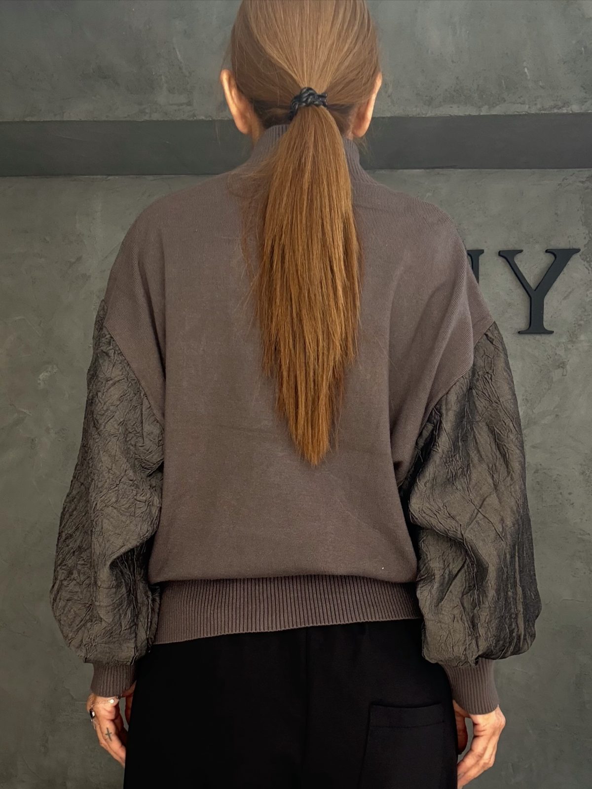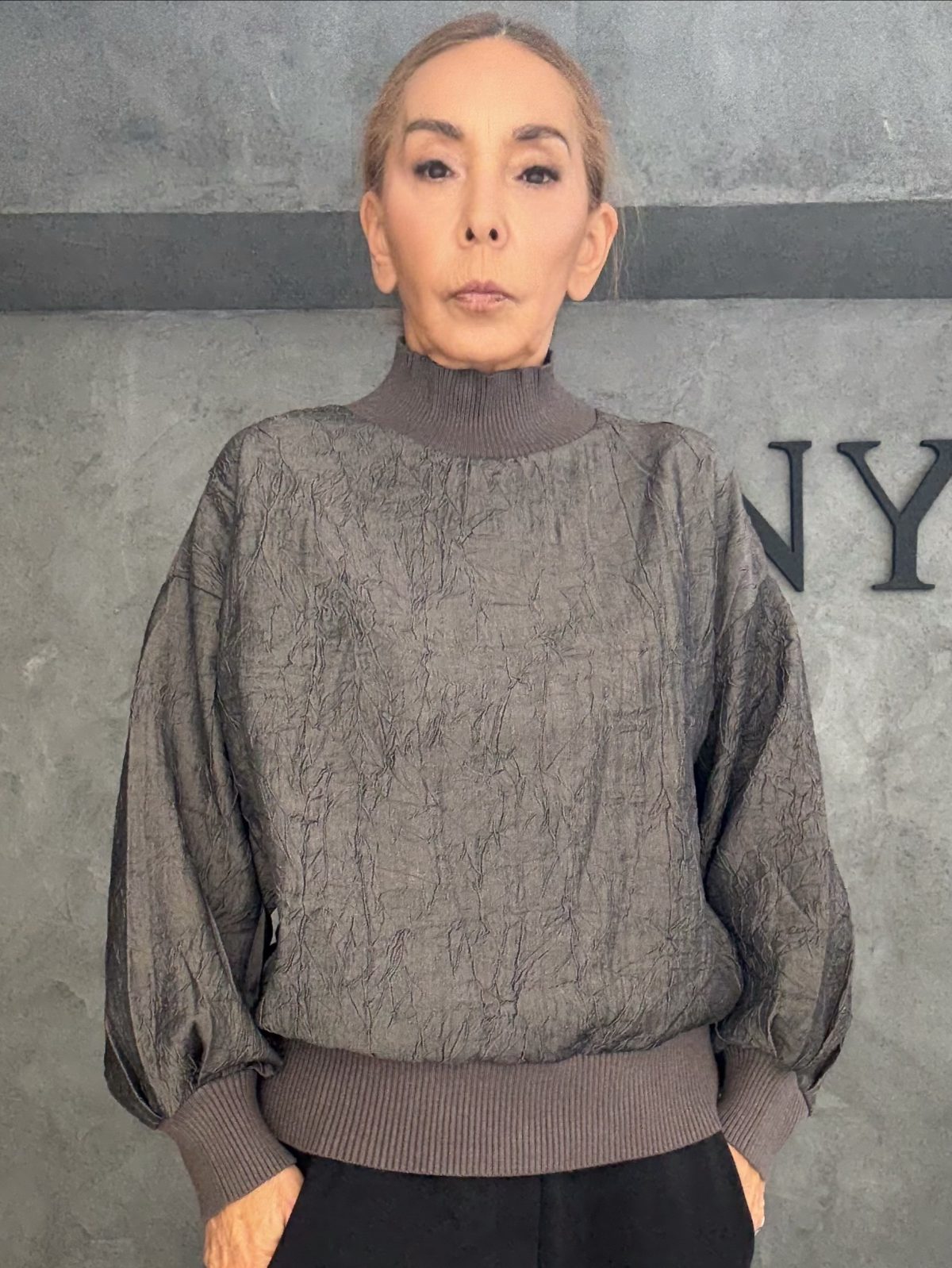 Μπλούζα με ιδιαίτερη τσαλακωμένη υφή σε μεταλλιζέ γκρι απόχρωση, που χαρίζει βάθος και κίνηση στο ύφασμα. Διαθέτει balloon μανίκια με λάστιχο στο τελείωμα και ψηλό rib γιακά, συνδυάζοντας άνεση με statement χαρακτήρα. Ένα κομμάτι που ισορροπεί ανάμεσα στο minimal και το artistic.