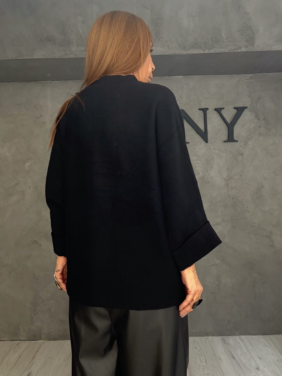 Μαύρη μπλούζα με καθαρή, minimal γραμμή που αποκτά ξεχωριστό χαρακτήρα χάρη στις γεωμετρικές τριγωνικές λεπτομέρειες σε καφέ suede υφή με φερμουάρ. Η ελαφρώς boxy σιλουέτα και τα φαρδιά μανίκια της προσδίδουν αρχιτεκτονικό ύφος, καθιστώντας την ιδανική για statement εμφανίσεις που ξεφεύγουν από τα συνηθισμένα.