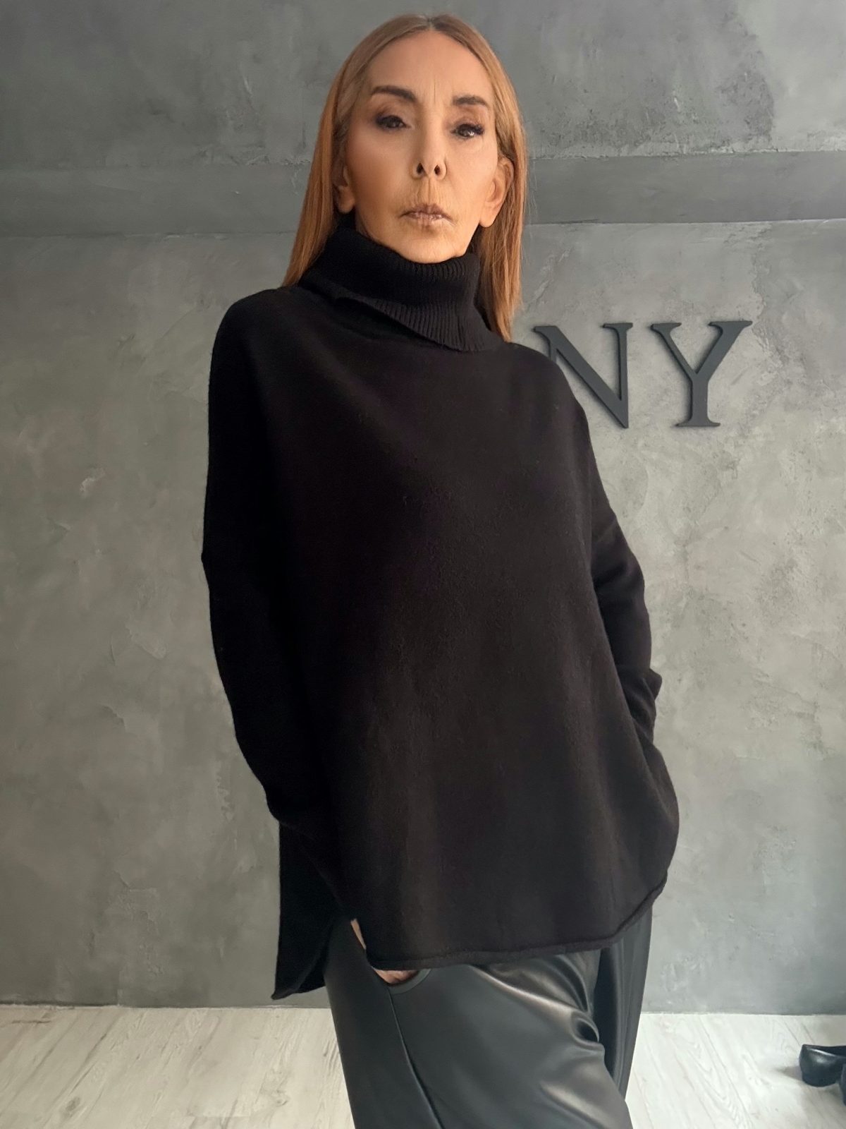 Φόρεσέ το μέσα από wide leather pants ή με structured παντελόνι για μοντέρνα αντίθεση υφών. Για total black editorial αποτέλεσμα, πρόσθεσε chunky μποτάκια ή pointed ankle boots. Αν θέλεις πιο artistic layering, συνδύασέ το με γήινα αξεσουάρ (π.χ. camel κασκόλ ή oversized καρφίτσα). Ιδανικό για minimal winter dressing, από πρωινό city mood μέχρι βραδινό effortless chic.