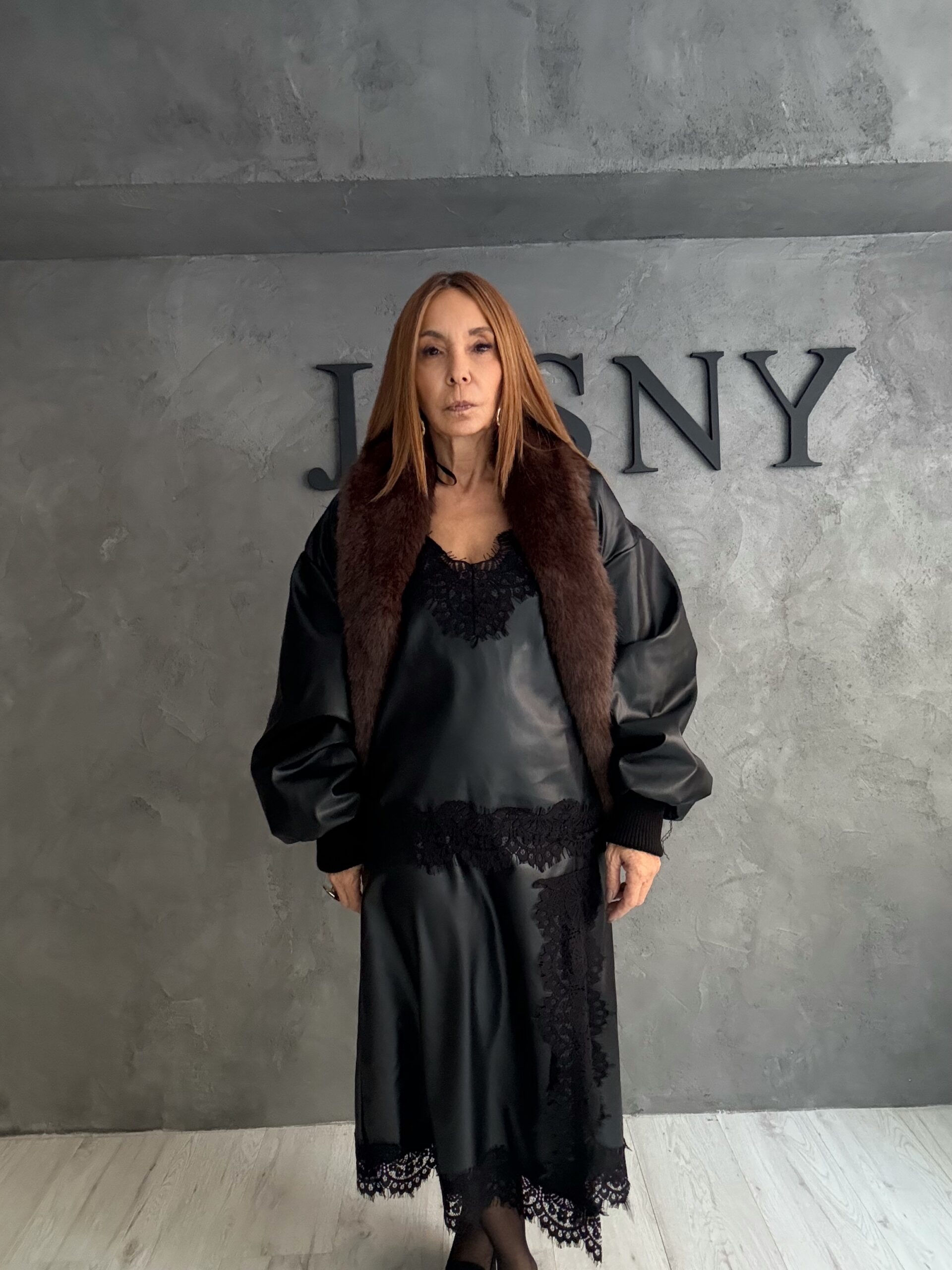 Το oversized δερμάτινο bomber προσφέρει ένταση και δομή στο ντύσιμο, ενώ η πλούσια, απαλή faux fur εσάρπα σε βαθύ καφέ τόνο προσθέτει ζεστασιά και πολυτέλεια.