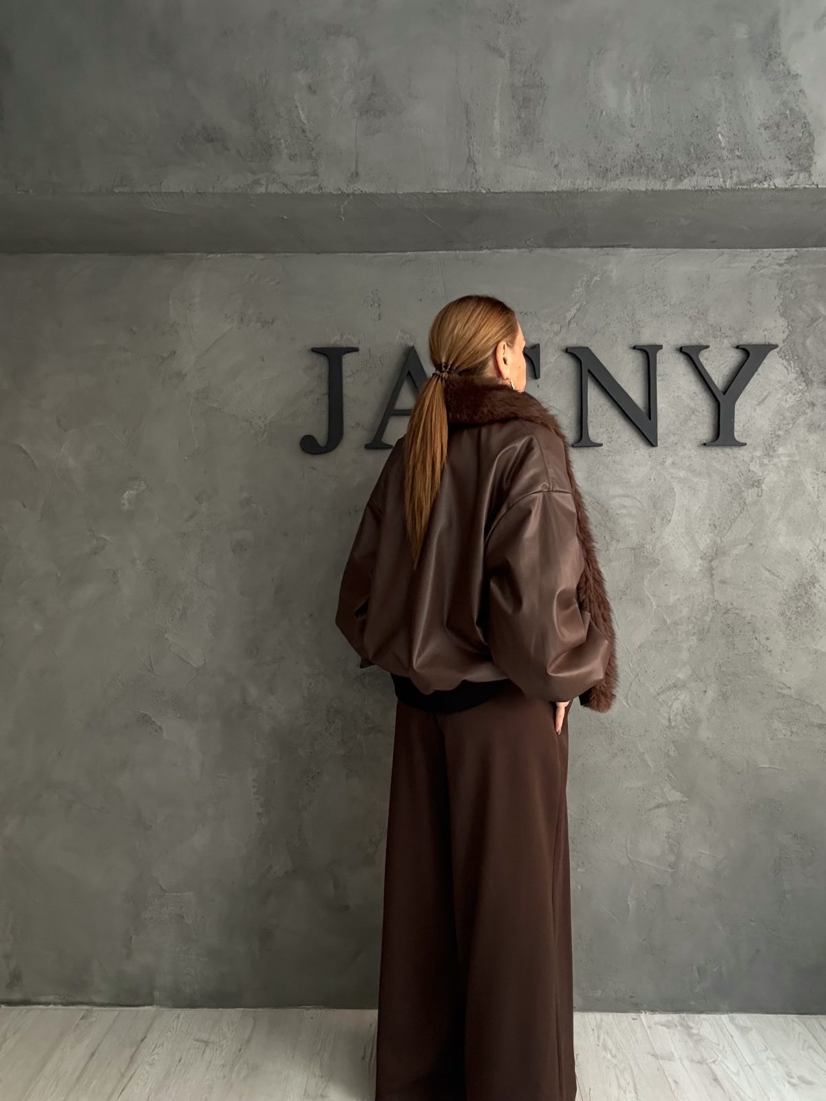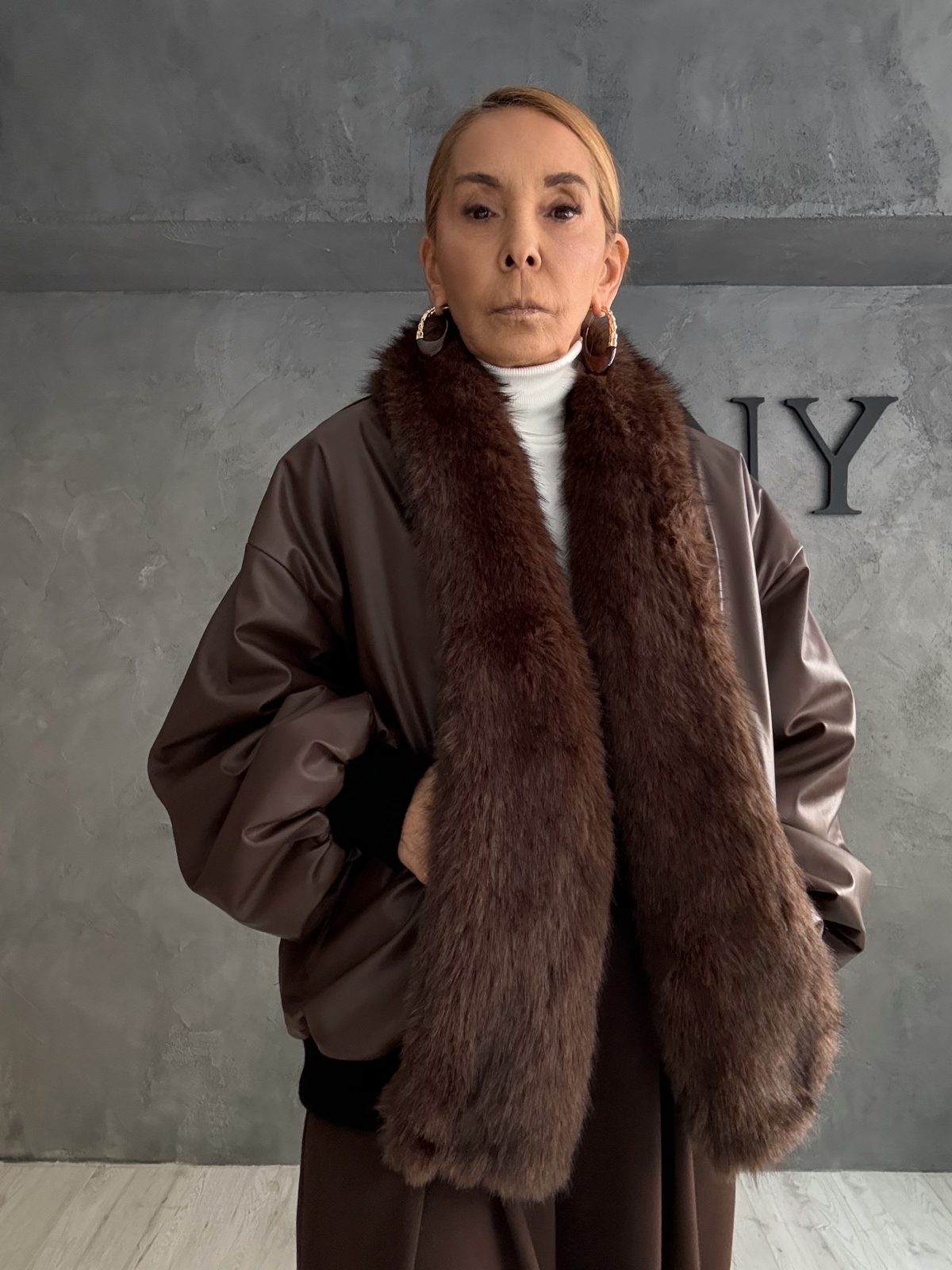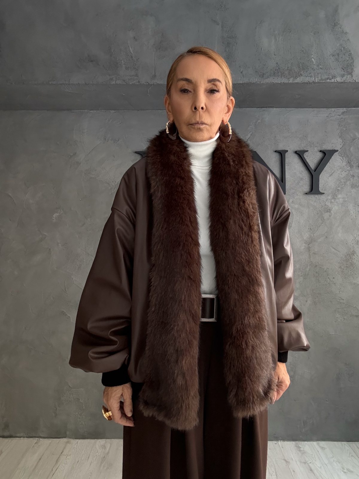 Ανδρόγυνο bomber jacket σε πλούσια σοκολατί απόχρωση με statement γιακά από οικολογική γούνα. Κατασκευασμένο από premium δερματίνη με ελαφριά γυαλάδα, προσφέρει ζεστασιά και πολυτελή εμφάνιση χωρίς να χάνει την άνεση του καθημερινού outerwear. Διαθέτει φαρδύ, oversized κόψιμο, λάστιχα στα μανίκια για μοντέρνα σιλουέτα και εσωτερική φόδρα για extra άνεση.