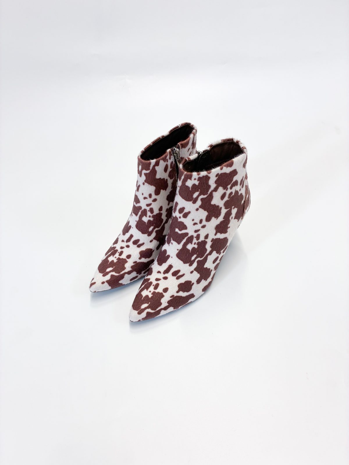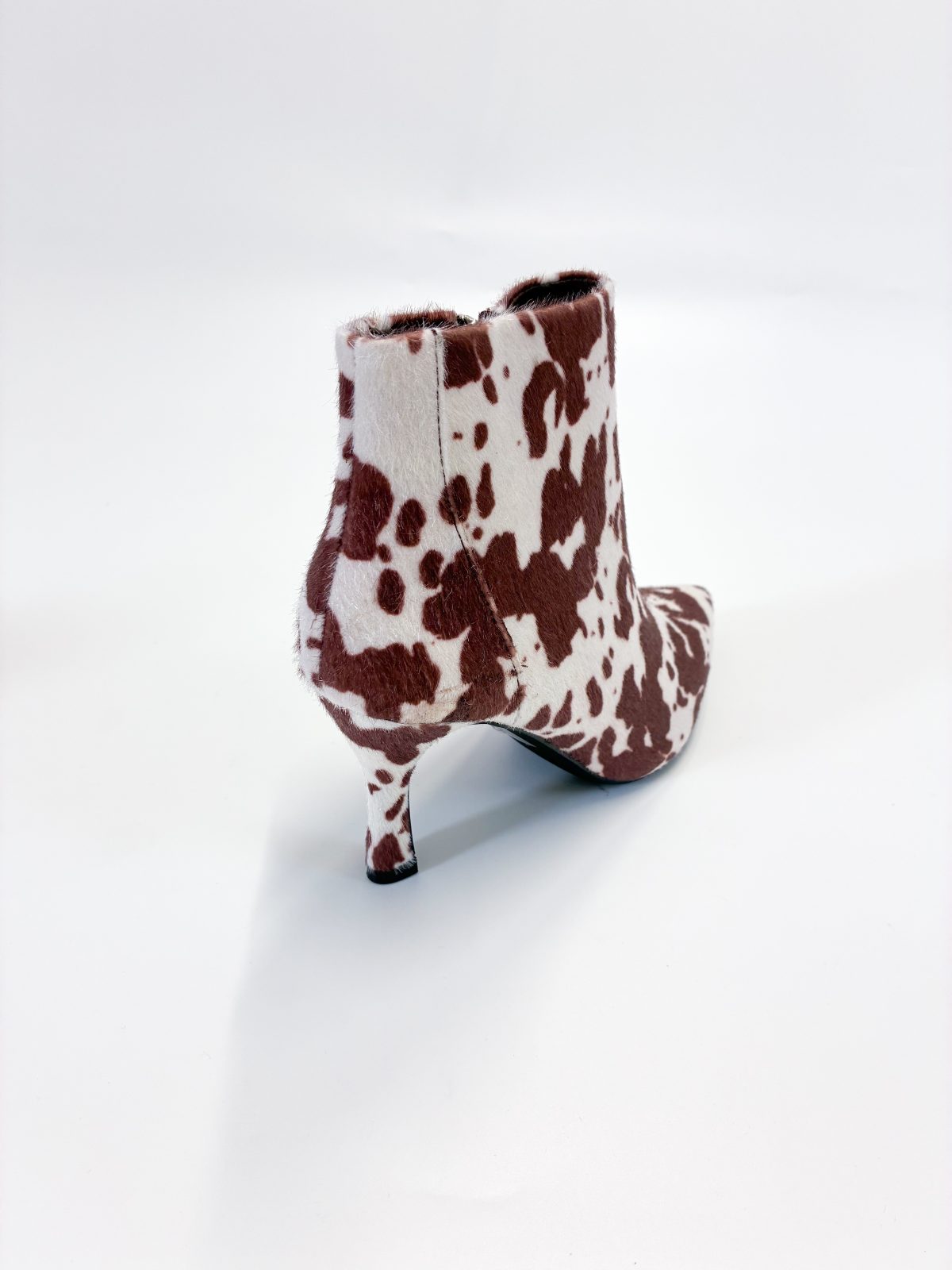 Μυτερά ankle boots με εντυπωσιακό καφέ–λευκό cow print, Pony Hair, εμπνευσμένα από το western στυλ αλλά με fashion–forward αισθητική. Η υφή και το pattern δημιουργούν έντονο χαρακτήρα, καθιστώντας τα το απόλυτο statement κομμάτι για να αναβαθμίσεις κάθε εμφάνιση.