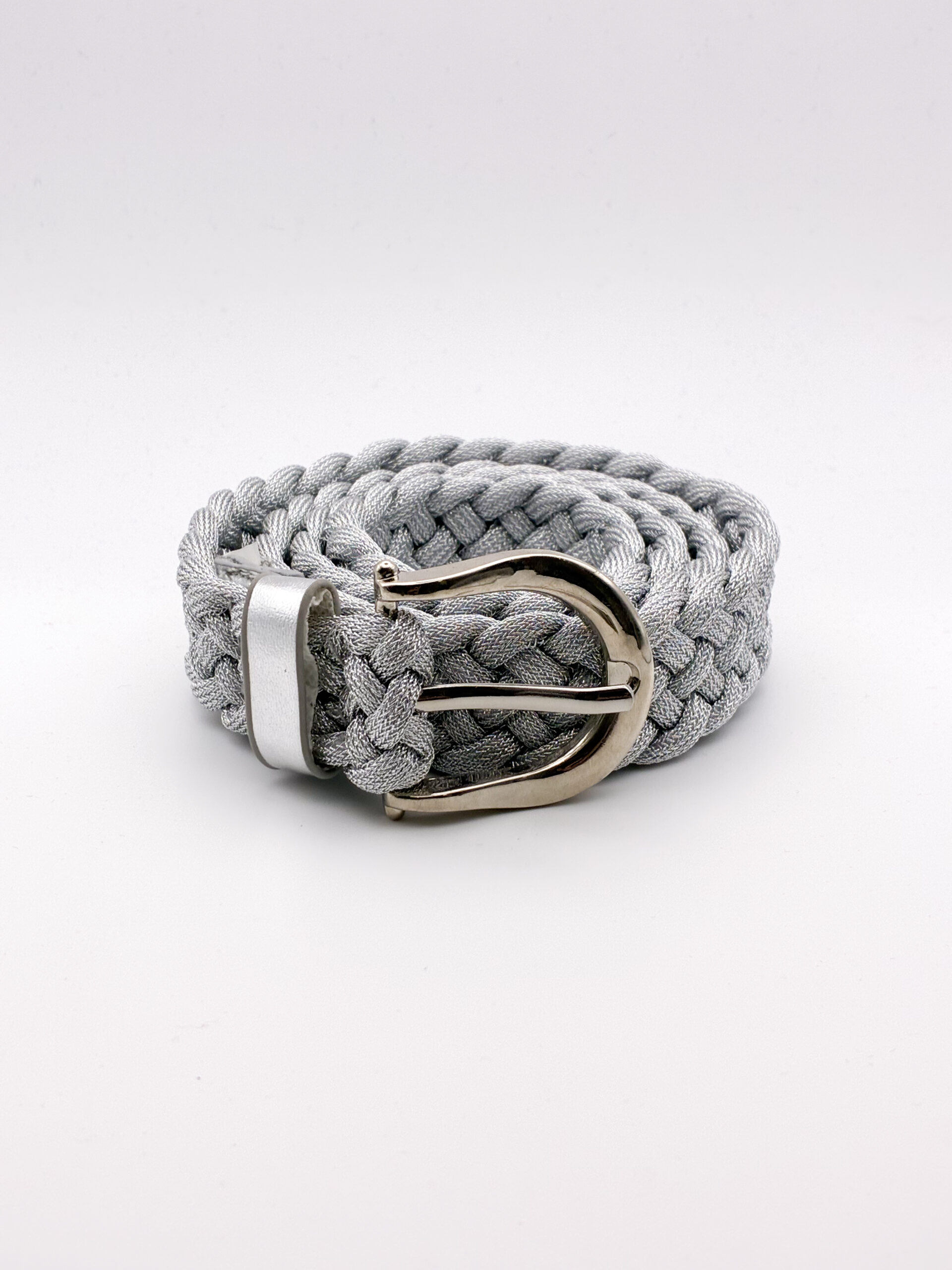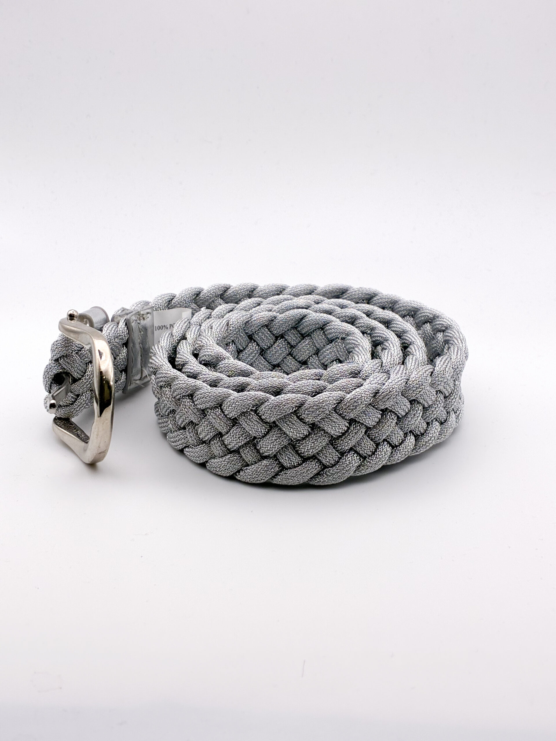 Ζώνη με πλεκτή υφή σε ασημί απόχρωση, που συνδυάζει την artisan αισθητική με διαχρονική κομψότητα. Η μαλακή, εύκαμπτη πλέξη αγκαλιάζει τη μέση άνετα, ενώ η μεταλλική αγκράφα προσθέτει ένα καθαρό, εκλεπτυσμένο τελείωμα. Ένα κομμάτι που ισορροπεί ιδανικά ανάμεσα στο casual luxury και το σύγχρονο minimal.