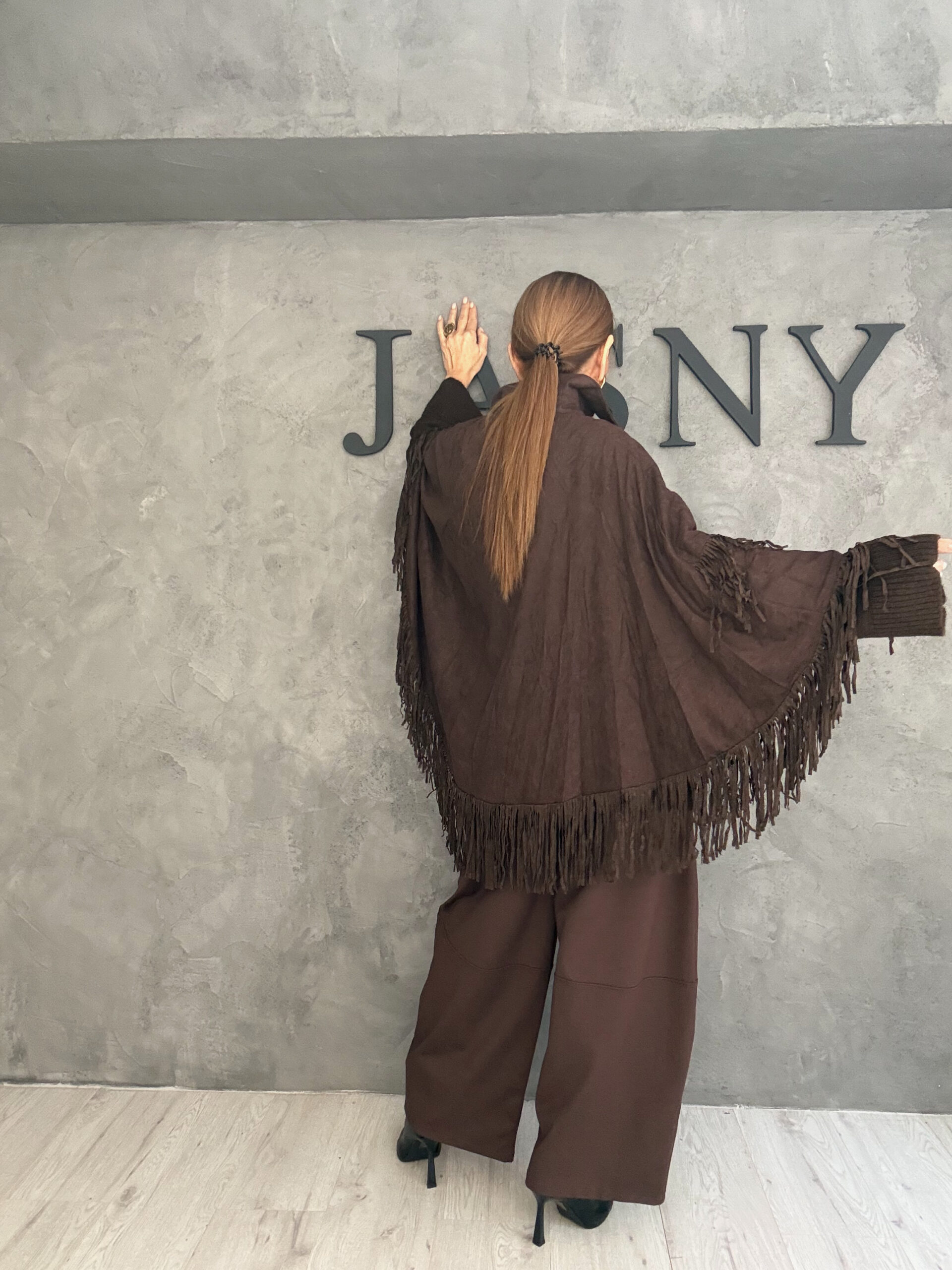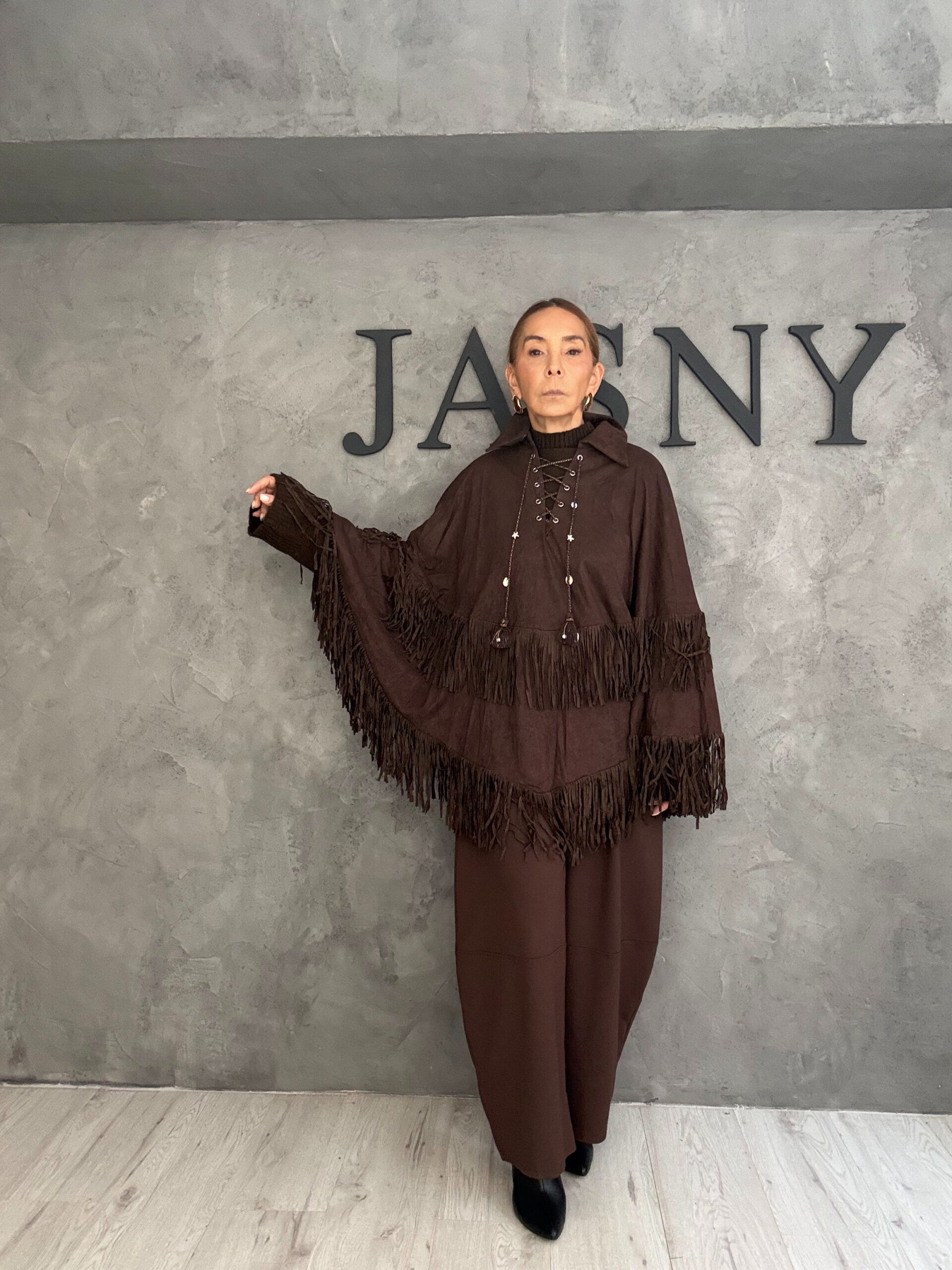 Οι κρόσσια δεν λειτουργούν διακοσμητικά· δημιουργούν ρυθμό και κίνηση, σαν φυσική προέκταση του σώματος. Η χαλαρή γραμμή και η μονοχρωμία κρατούν το σύνολο γειωμένο, ενώ το δέσιμο στον λαιμό προσθέτει ένταση χωρίς να γίνεται επιθετικό.