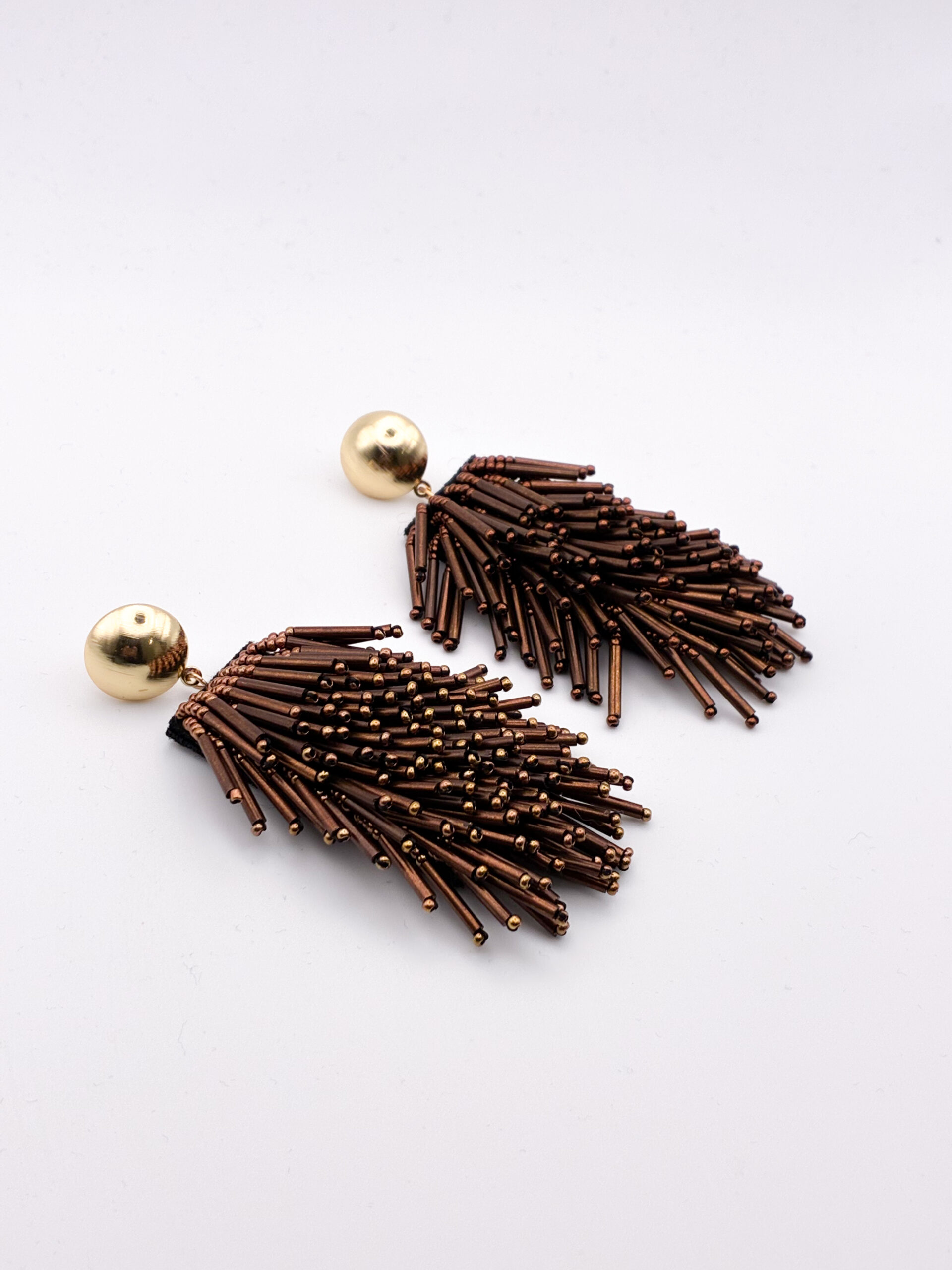 Εντυπωσιακά σκουλαρίκια με μεταλλικό φινίρισμα και πλούσιο κρόσσι από λεπτές χάντρες, που δημιουργούν κίνηση και λάμψη σε κάθε εμφάνιση. Ο συνδυασμός της λείας, γυαλιστερής βάσης με το δυναμικό fringe αποτέλεσμα χαρίζει ένα σύγχρονο αλλά διαχρονικό statement, ιδανικό για ιδιαίτερες εμφανίσεις.