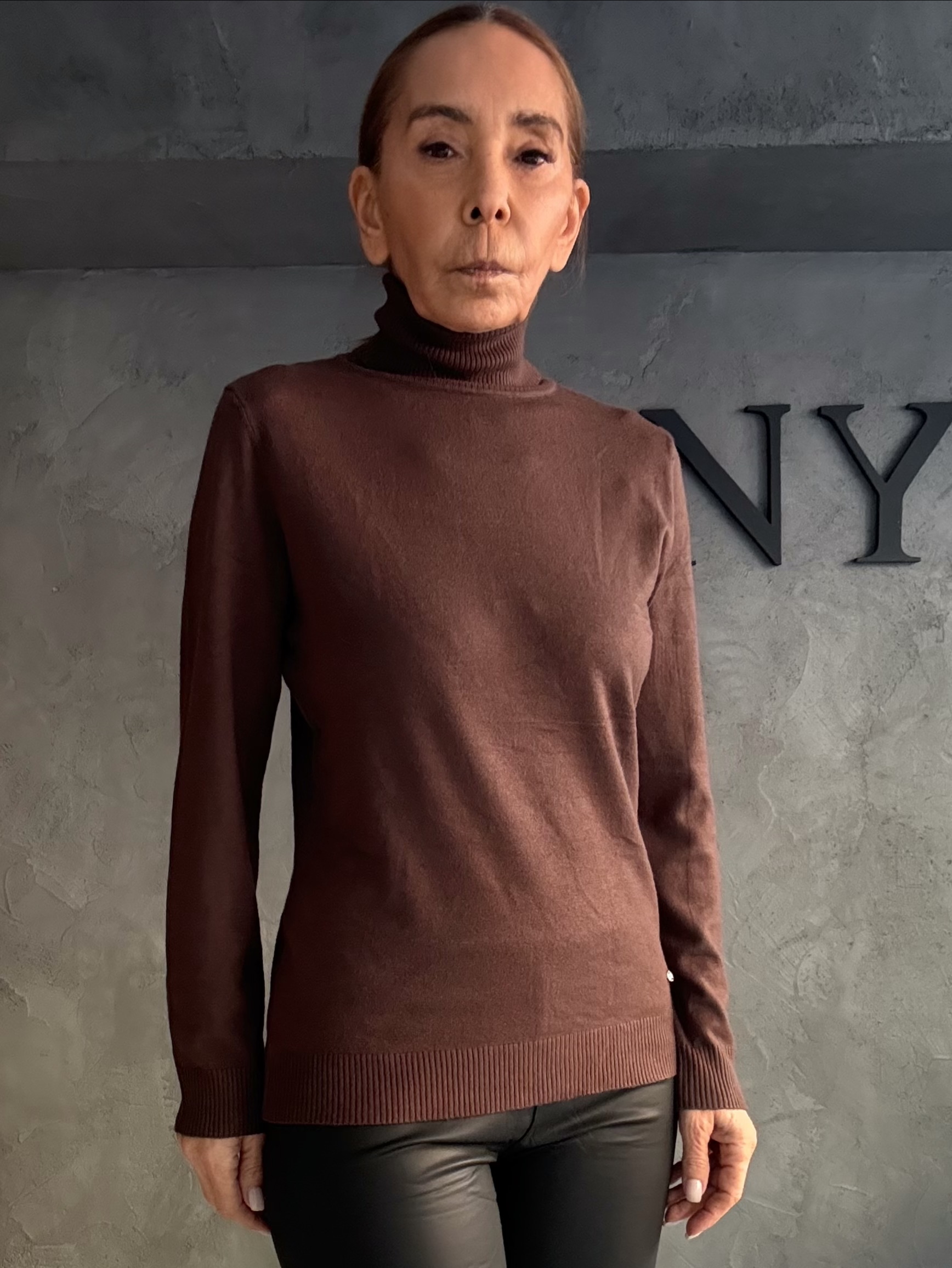 Μπλούζα σε καφέ απόχρωση με ψηλό λαιμό και καθαρή, εφαρμοστή γραμμή, ιδανική για καθημερινή χρήση και εύκολο styling. Ο λιτός σχεδιασμός της αναδεικνύει τη σιλουέτα χωρίς υπερβολές, ενώ τα rib τελειώματα προσφέρουν σωστή εφαρμογή και άνεση.
