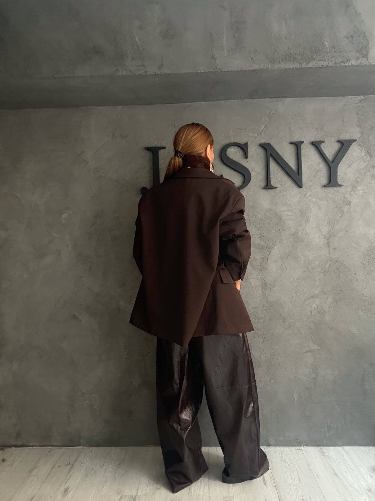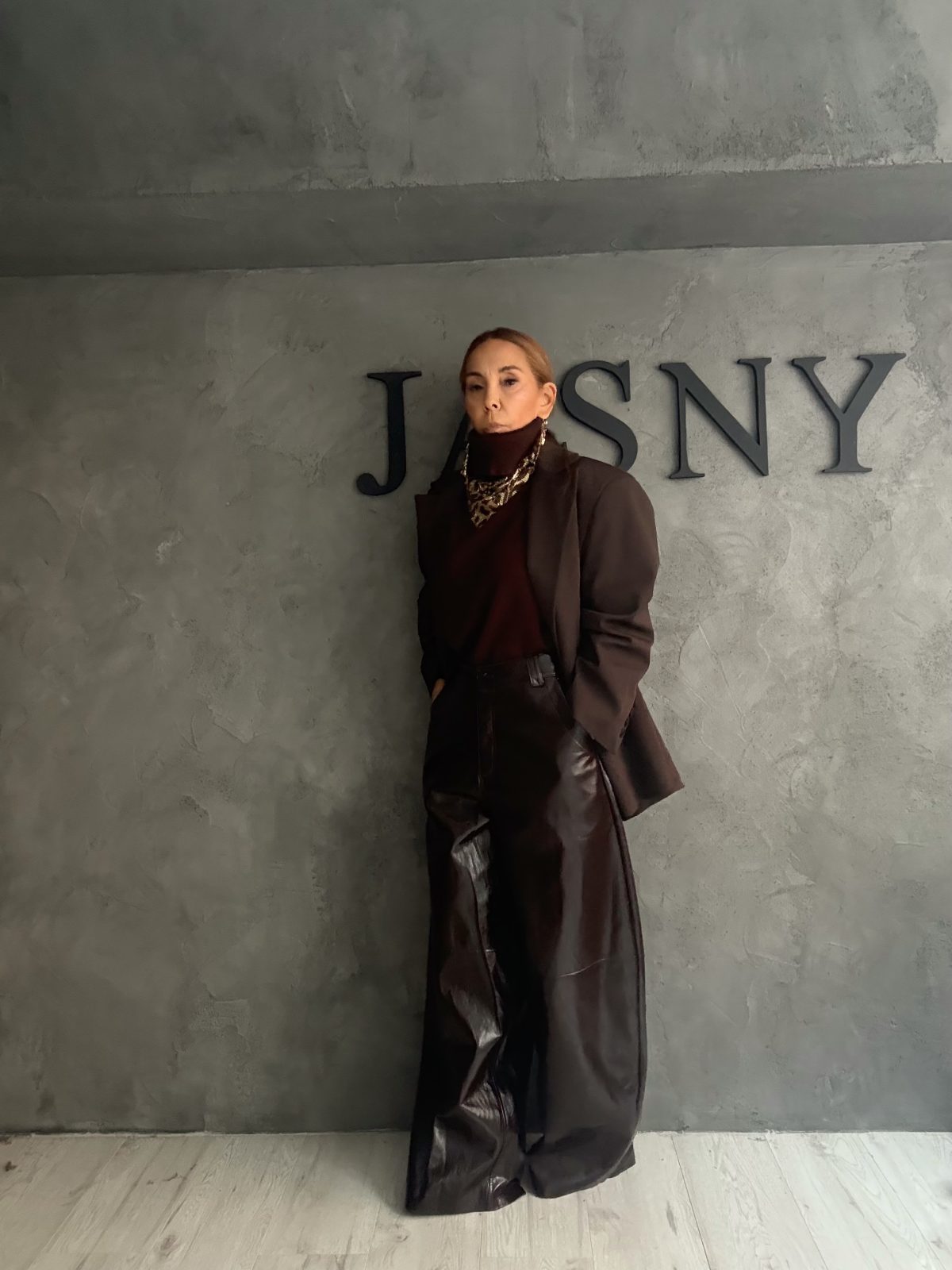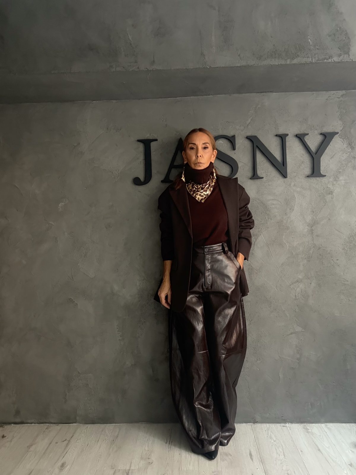 Ένα απόλυτα εκλεπτυσμένο tonal look σε αποχρώσεις mocha και espresso. Η μαλακή ρευστότητα του πλεκτού συνδυάζεται με τη γυαλιστερή υφή της δερμάτινης παντελόνας και την αρχιτεκτονική δομή του σακακιού, δημιουργώντας ένα αρμονικό παιχνίδι φωτός και υλικών. Το αποτέλεσμα είναι ένα look που αποπνέει σιγουριά, ηρεμία και sophisticated δυναμισμό — μια σύγχρονη εκδοχή της διακριτικής πολυτέλειας.