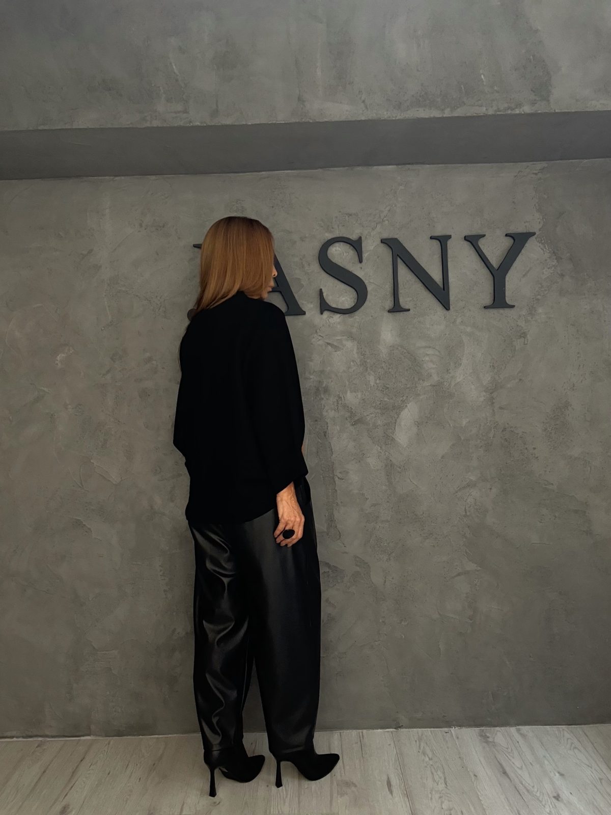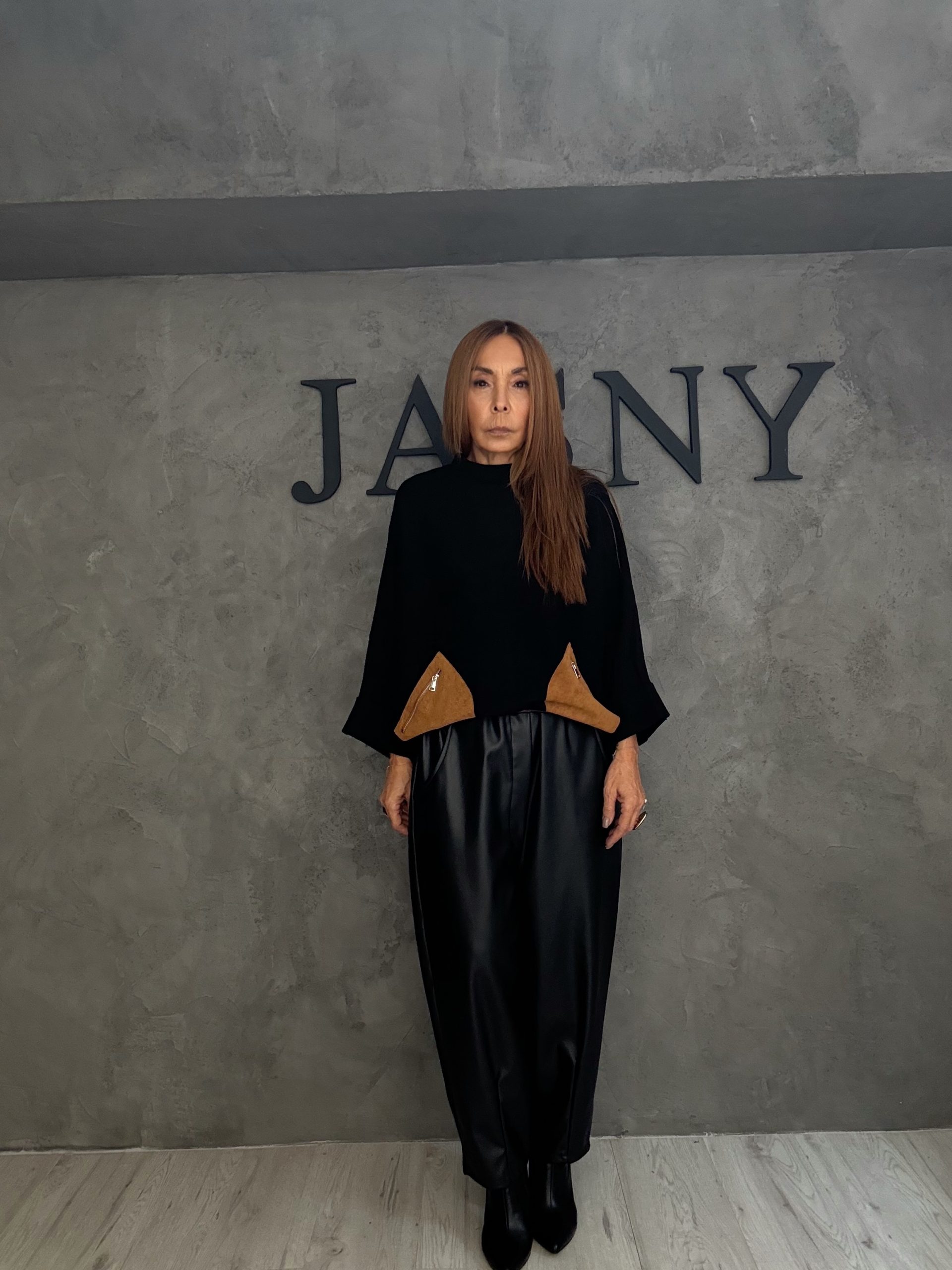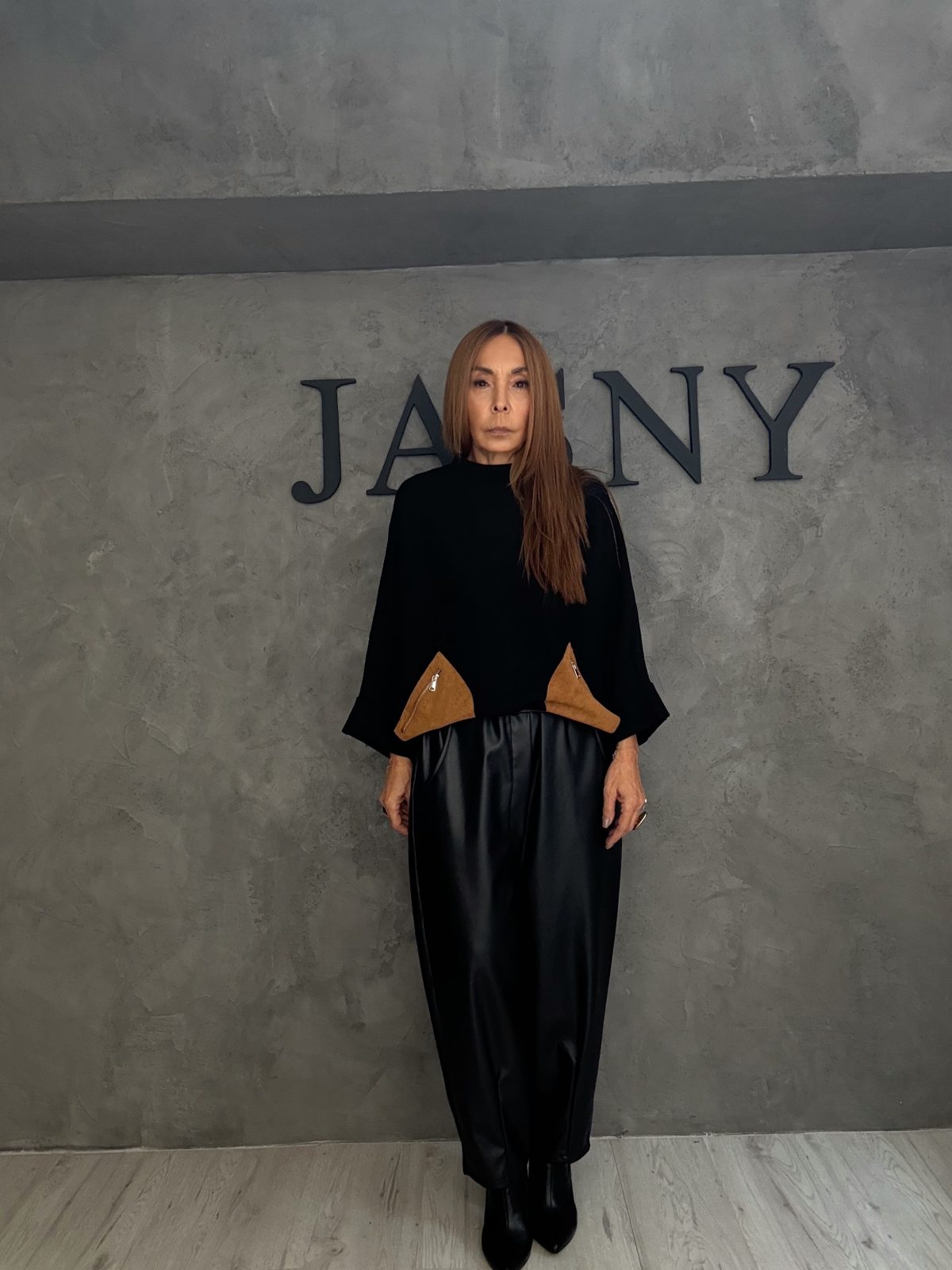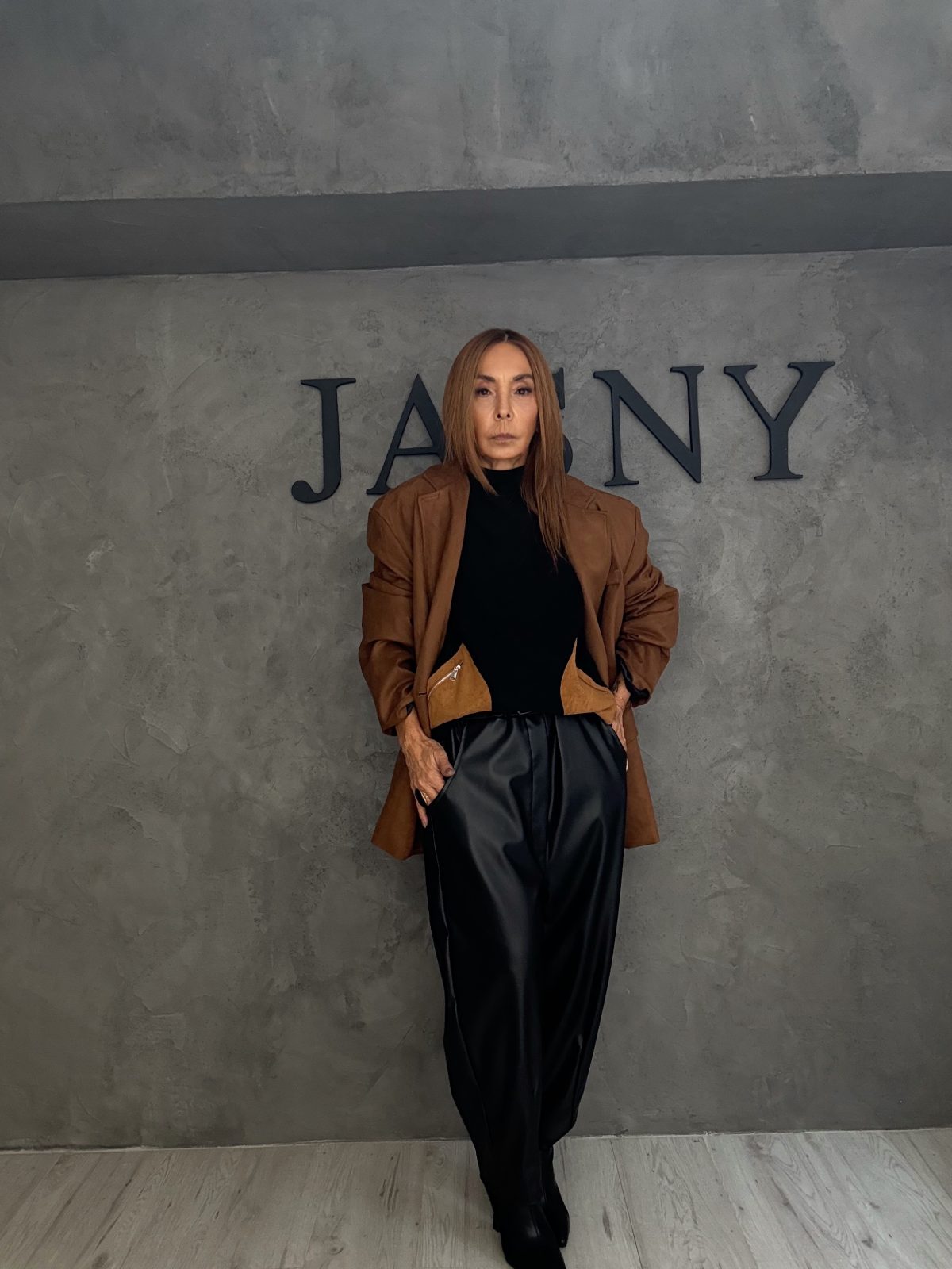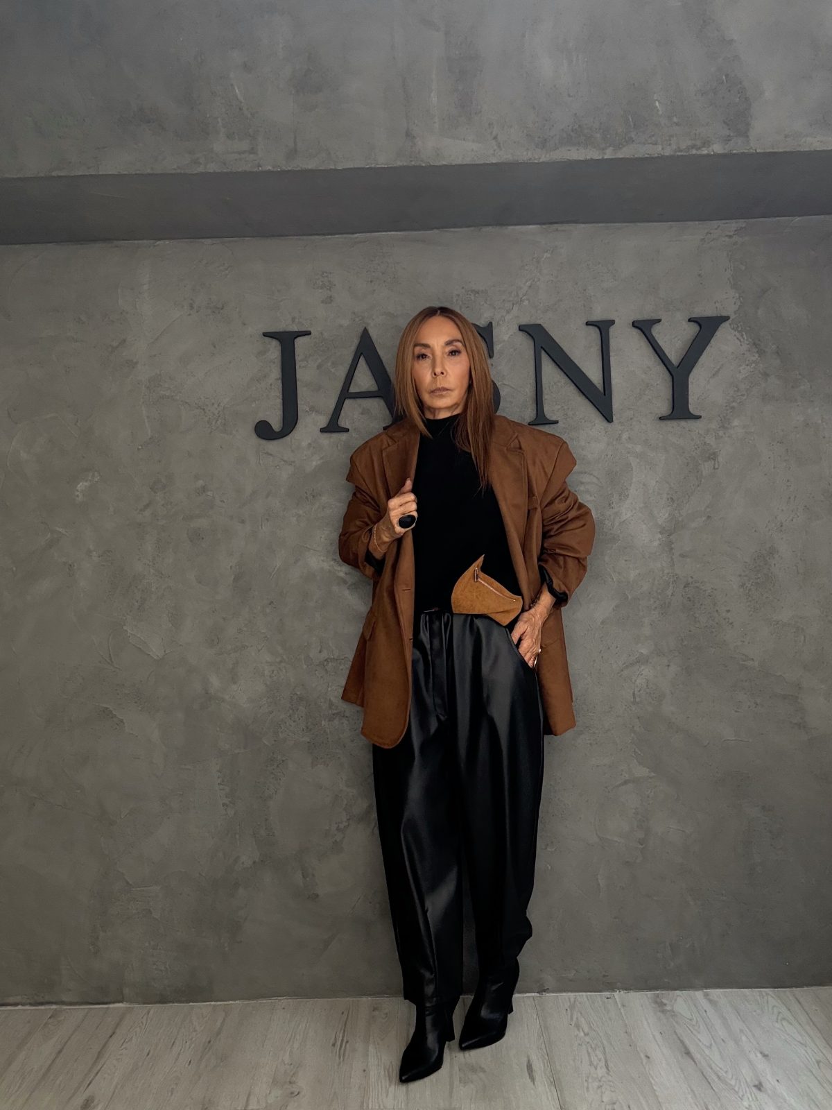 Ένα δυναμικό και εκλεπτυσμένο σύνολο που συνδυάζει το oversized camel σακάκι με την μαύρη μπλούζα με suede λεπτομέρειες και το φαρδύ δερμάτινο παντελόνι. Η αντίθεση της γήινης καφέ απόχρωσης με το μαύρο δημιουργεί μια ισορροπία ανάμεσα στη ζεστασιά και το minimal edge, ενώ η χαλαρή σιλουέτα αποπνέει σύγχρονη αυτοπεποίθηση. Το αποτέλεσμα είναι ένα look που μπορεί να σταθεί από την καθημερινότητα μέχρι και σε fashion-forward βραδινές εμφανίσεις.