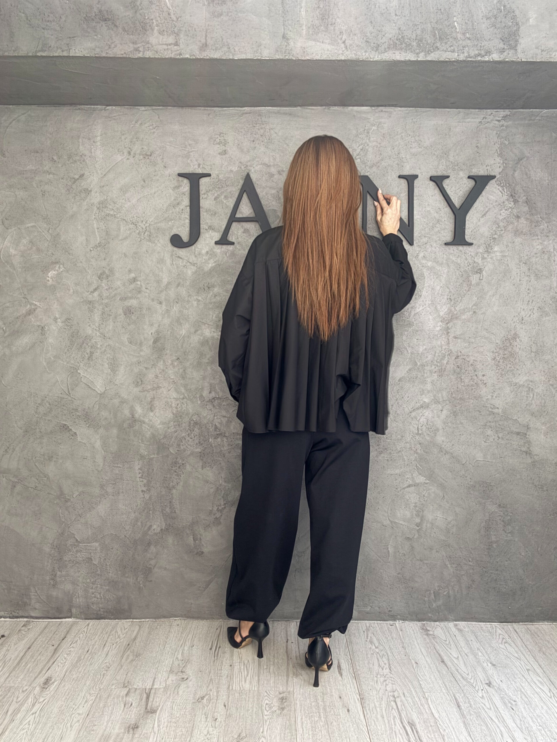 Ένα σύγχρονο total black look με καθαρές γραμμές και δυναμική απλότητα. Το jacket με φερμουάρ και κουκούλα δίνει sport–minimal χαρακτήρα, ενώ το relaxed παντελόνι ολοκληρώνει το σύνολο με άνεση και ισορροπία. Η μονοχρωμία αναδεικνύει τη σιλουέτα και τις υφές, δημιουργώντας ένα outfit που δείχνει σύγχρονο, ήρεμο και δυναμικό ταυτόχρονα.