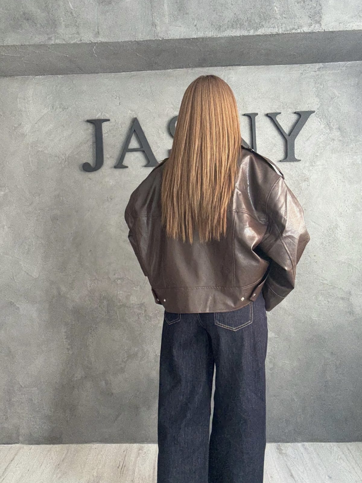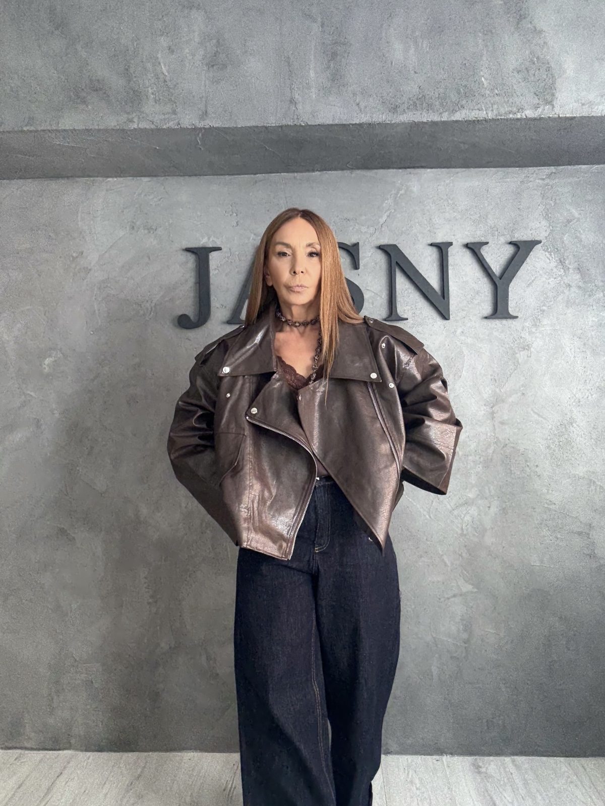 Ένα δυναμικό σύνολο που ισορροπεί ανάμεσα στη θηλυκότητα και τον δυναμισμό. Το σατέν καμισόλ με δαντέλα χαρίζει ρομαντική πινελιά, το σκούρο wide-leg τζιν προσθέτει άνεση και urban χαρακτήρα, ενώ το μεταλλιζέ καφέ δερμάτινο μπουφάν ολοκληρώνει το outfit με rock διάθεση. Ένα look ιδανικό για γυναίκες που αγαπούν να συνδυάζουν την κομψότητα με το edge.