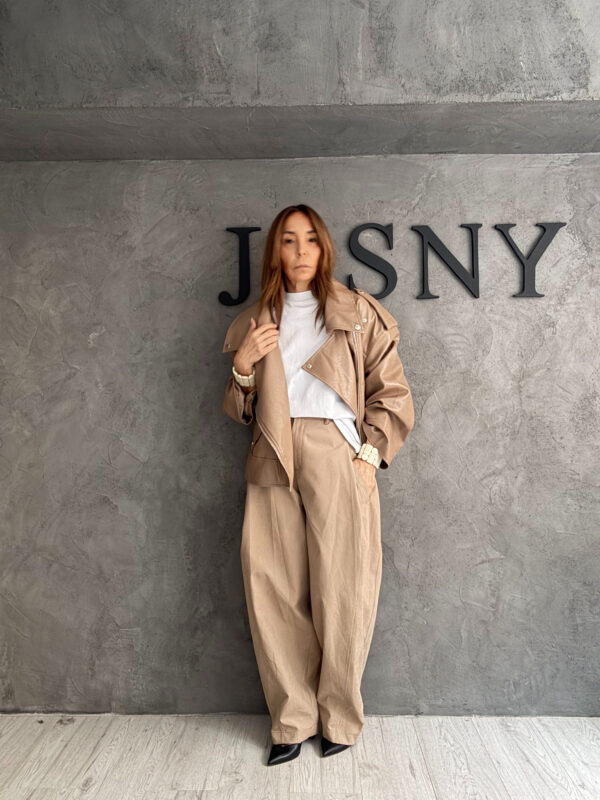 Ένα σύγχρονο tailored σύνολο σε απαλό ivory τόνο που αποπνέει καθαρότητα, δυναμισμό και minimal κομψότητα. Το cropped trench-style jacket με ζώνη και έντονους ώμους δημιουργεί μια αρχιτεκτονική σιλουέτα, ενώ το παντελόνι με χαλαρή γραμμή ισορροπεί το look με άνεση και σύγχρονη αισθητική. Οι ουδέτερες αποχρώσεις αναδεικνύουν την καθαρότητα της φόρμας και κάνουν το σύνολο εξαιρετικά ευέλικτο: φοριέται από το πρωί μέχρι το βράδυ και προσαρμόζεται εύκολα σε διαφορετικές περιστάσεις. Ένα outfit που συνδυάζει δυναμισμό και φινέτσα, με fashion-forward χαρακτήρα και ήσυχη πολυτέλεια.