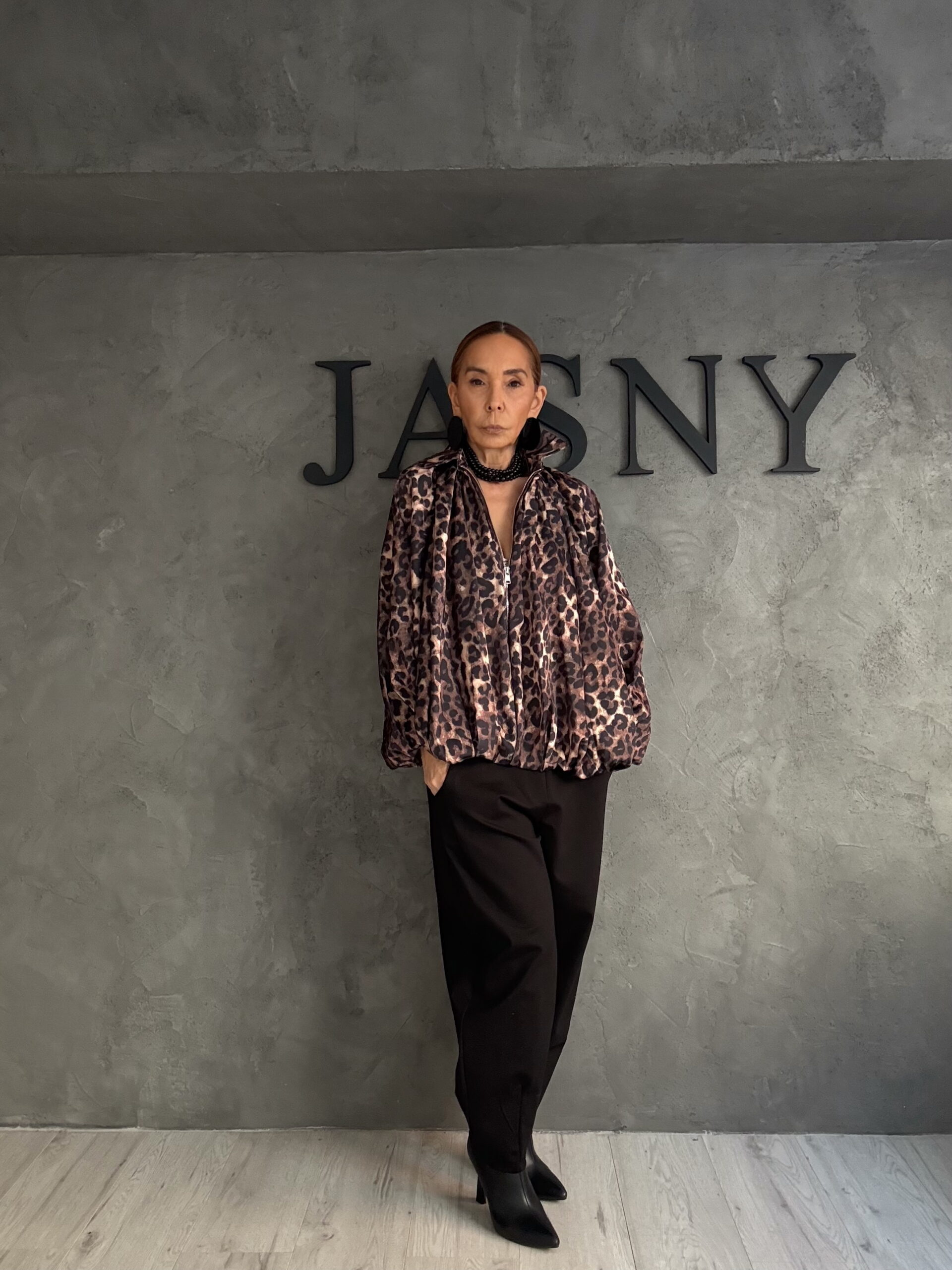Ένα refined look που αναδεικνύει το animal print με ήρεμο και κομψό τρόπο. Η λεοπάρ μπλούζα διαθέτει χαλαρή, αέρινη γραμμή που πέφτει φυσικά στο σώμα, δημιουργώντας κίνηση και άνεση χωρίς να χάνει σε κομψότητα. Το μοτίβο λειτουργεί εδώ ως statement, αλλά ισορροπεί χάρη στη μαλακή υφή και τη σωστή φόρμα του ρούχου. Συνδυάζεται με μαύρο παντελόνι που «γείωνει» το print και κρατά το σύνολο σοφιστικέ και σύγχρονο. Ένα look που αποπνέει αυτοπεποίθηση, θηλυκότητα και διαχρονικό στιλ, χωρίς υπερβολές.