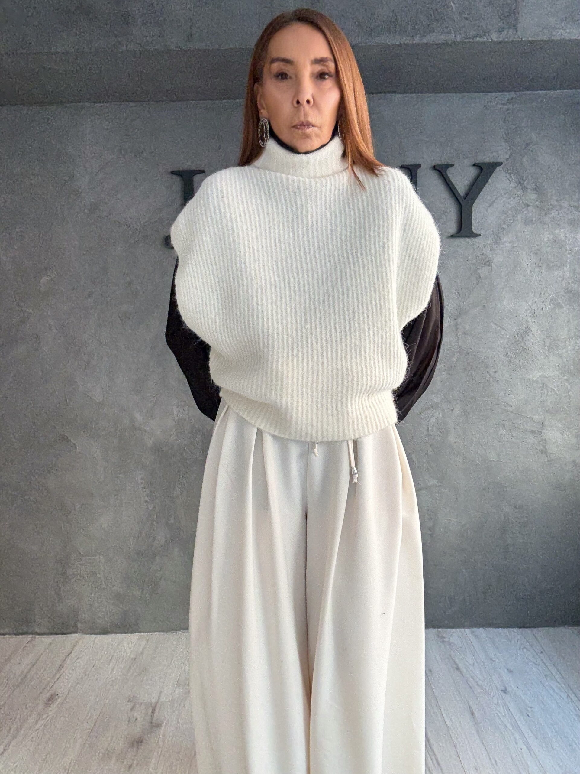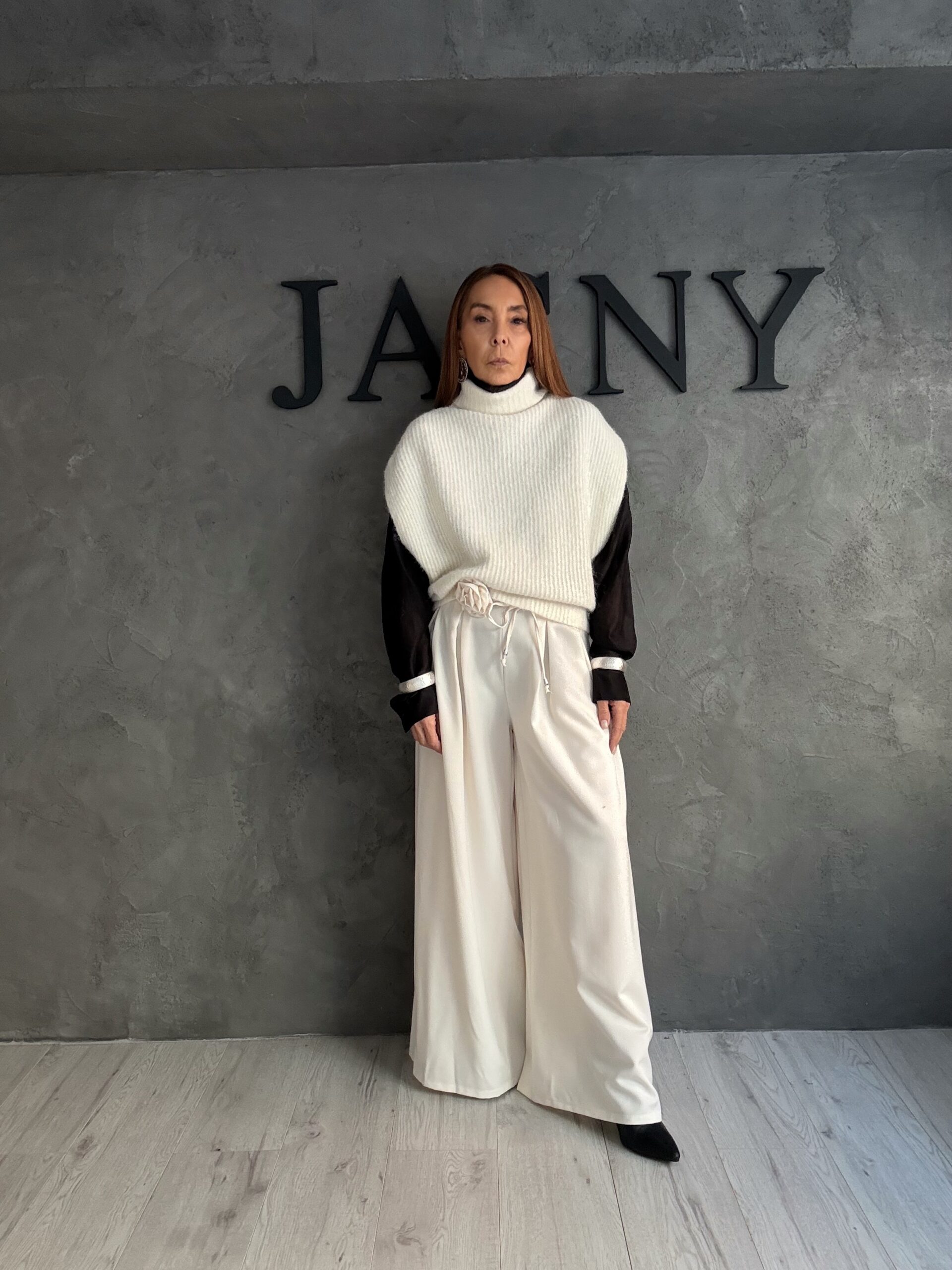 Το παντελόνι σε φωτεινή απόχρωση ολοκληρώνει την εικόνα με κομψότητα και αίσθηση ελευθερίας στην κίνηση, δημιουργώντας μια σύγχρονη σιλουέτα που παραμένει διαχρονική. Το styling βασίζεται στη λιτότητα, αφήνοντας τις γραμμές και τις υφές να πρωταγωνιστήσουν, χωρίς περιττές λεπτομέρειες.