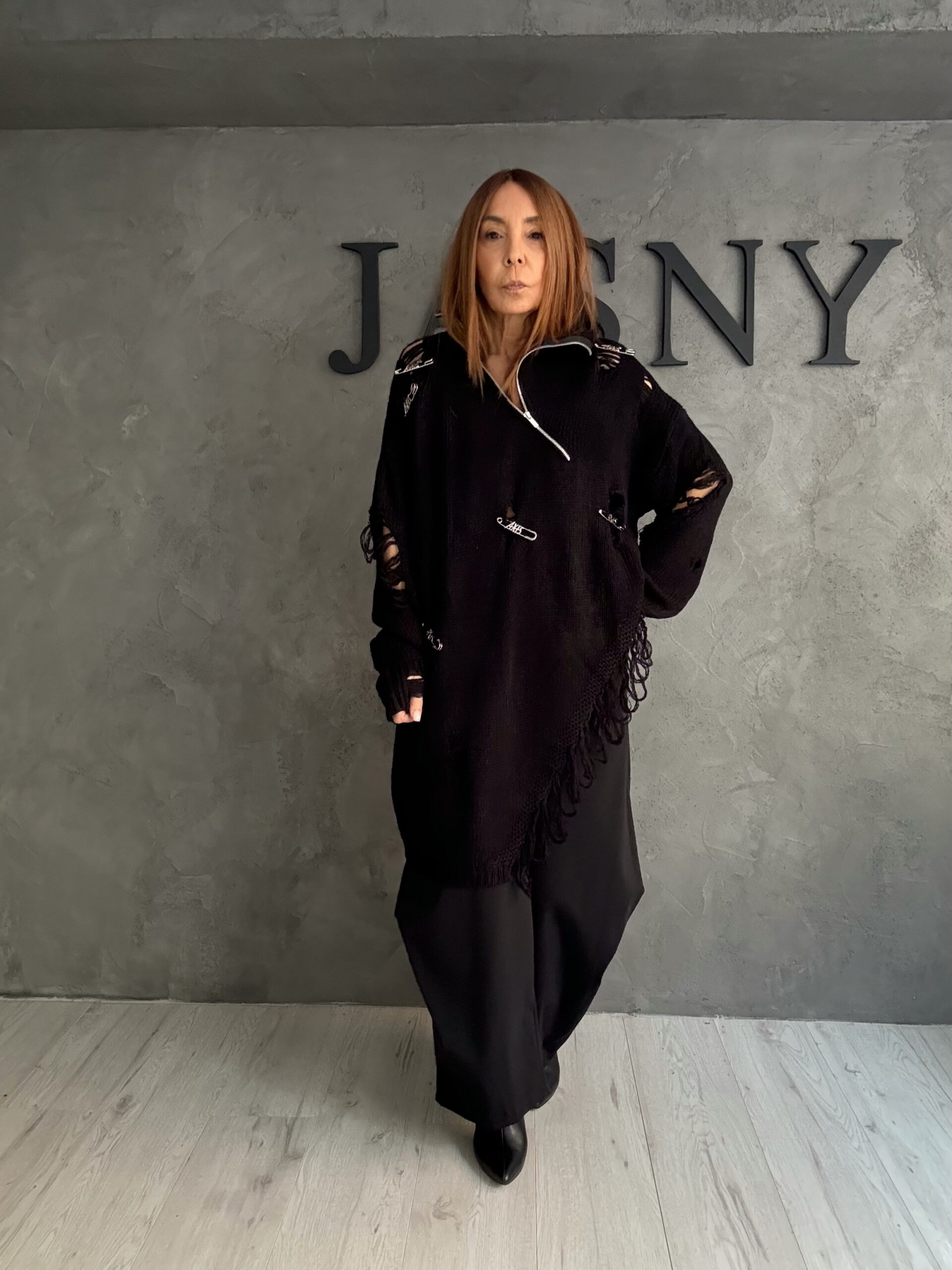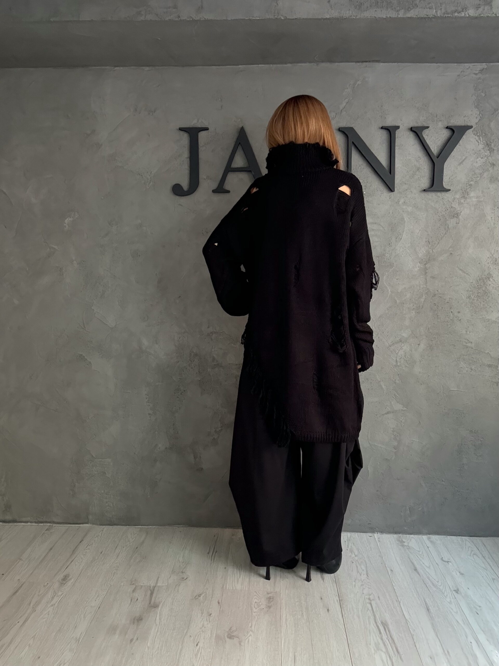 Ένα statement total black look με έντονη avant-garde αισθητική και ελεγχόμενη ένταση. Το πλεκτό κομμάτι με φθορές, παραμάνες και ασύμμετρες λεπτομέρειες δημιουργεί μια ωμή, σύγχρονη εικόνα που ισορροπεί ανάμεσα στο raw και το refined. Η χαλαρή γραμμή και οι καθαρές φόρμες στο κάτω μέρος «ηρεμούν» το σύνολο, αφήνοντας τις υφές και τις λεπτομέρειες να μιλήσουν. Ένα look που εκφράζει αυτοπεποίθηση και προσωπικότητα χωρίς περιττές εξηγήσεις.