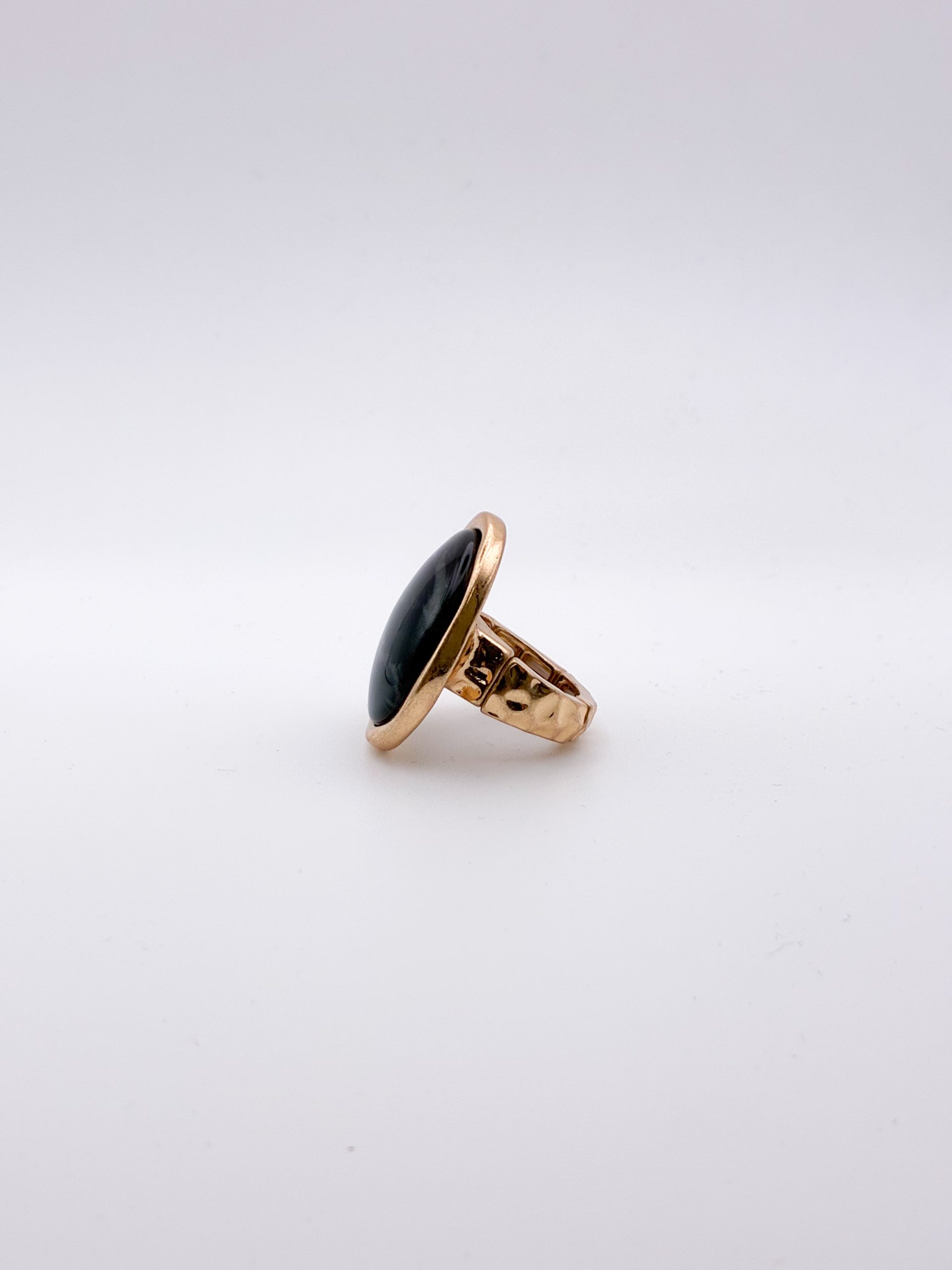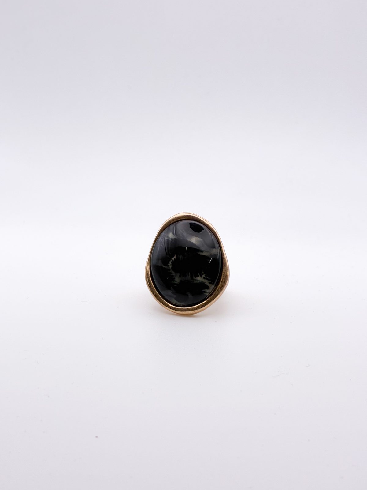Εντυπωσιακό δαχτυλίδι με μεγάλη οβάλ μαύρη πέτρα με γκρί νερά, αγκαλιασμένη από μεταλλικό χρυσό περίγραμμα. Ο συνδυασμός του βαθύ μαύρου με τη ζεστασιά του χρυσού δημιουργεί μια αίσθηση πολυτέλειας και μυστηρίου. Ένα κομμάτι που ξεχωρίζει για την απλότητά του αλλά και τη statement δυναμική του.