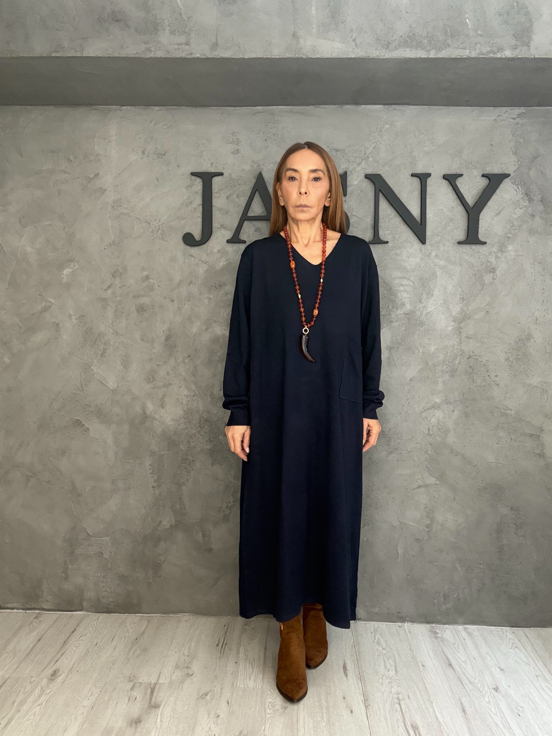 Μακρύ πλεκτό φόρεμα σε βαθύ navy τόνο, με ήρεμη αισθητική και άνετη εφαρμογή. Η V λαιμόκοψη ανοίγει διακριτικά τον κορμό, ενώ η καθαρή γραμμή και το μαλακό πλεκτό προσφέρουν άνεση καθ’ όλη τη διάρκεια της ημέρας. Ένα κομμάτι που ισορροπεί ανάμεσα στο casual και το refined.