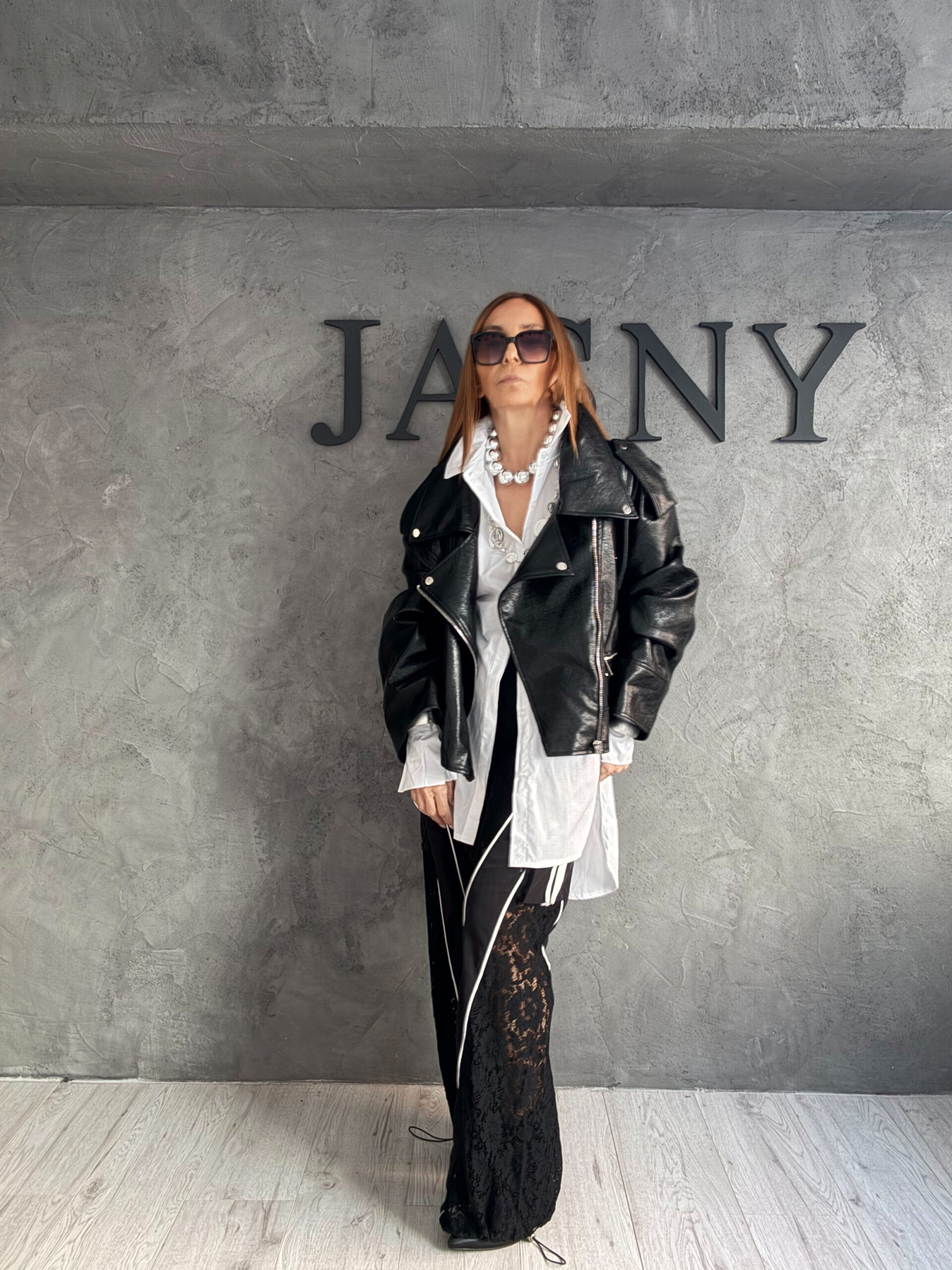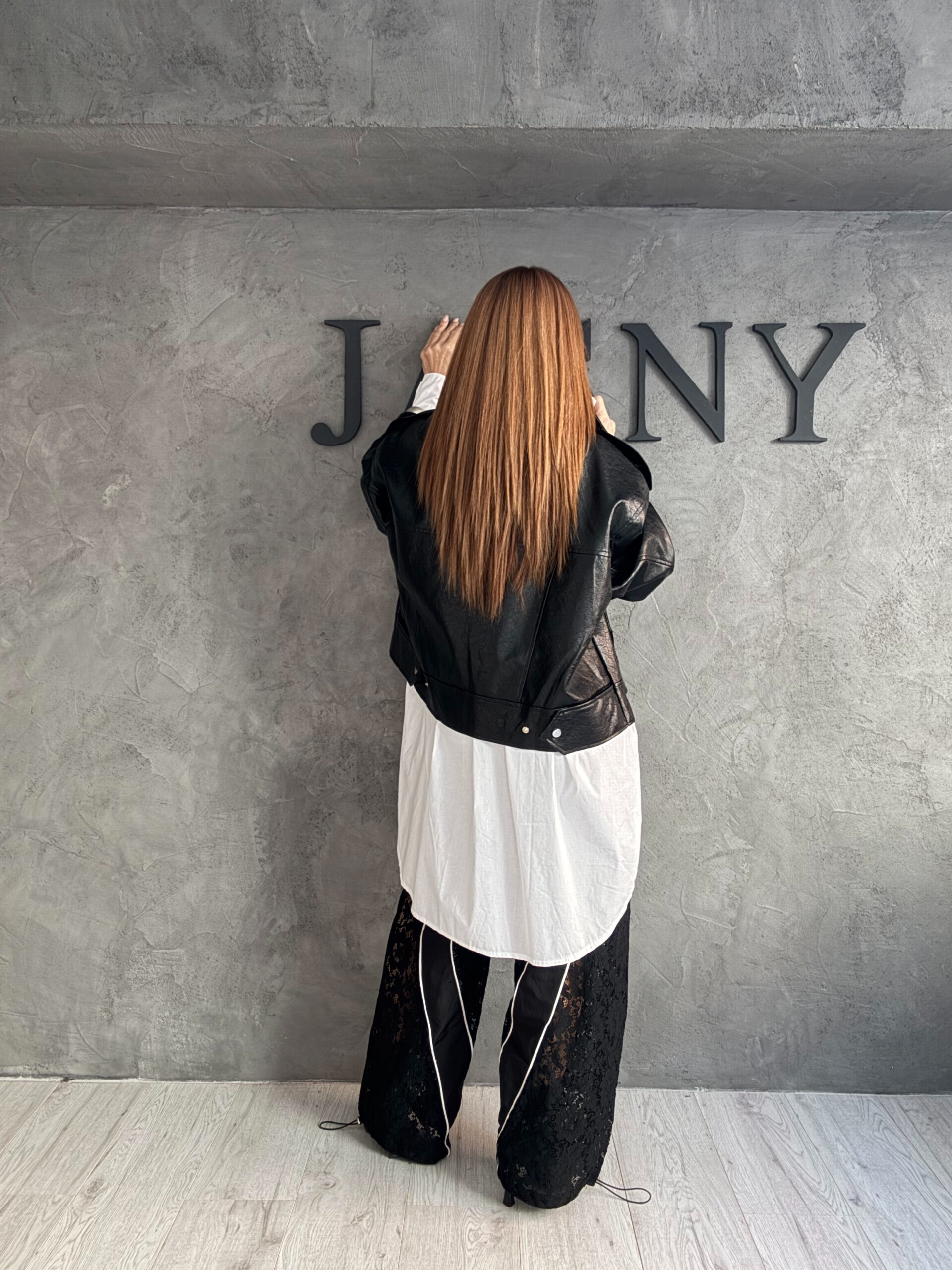 Ένα δυνατό layering look που συνδυάζει την αυστηρότητα του δερμάτινου jacket με τη ρευστότητα του λευκού πουκαμίσου και την ένταση της δαντέλας.