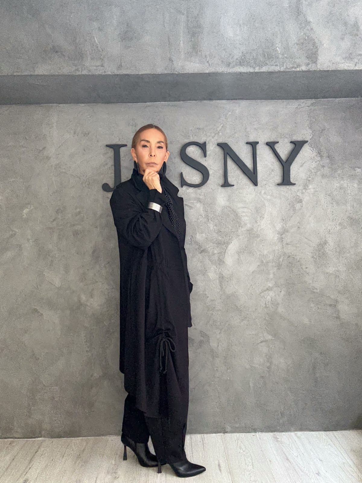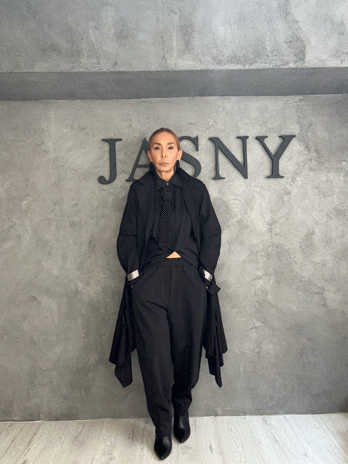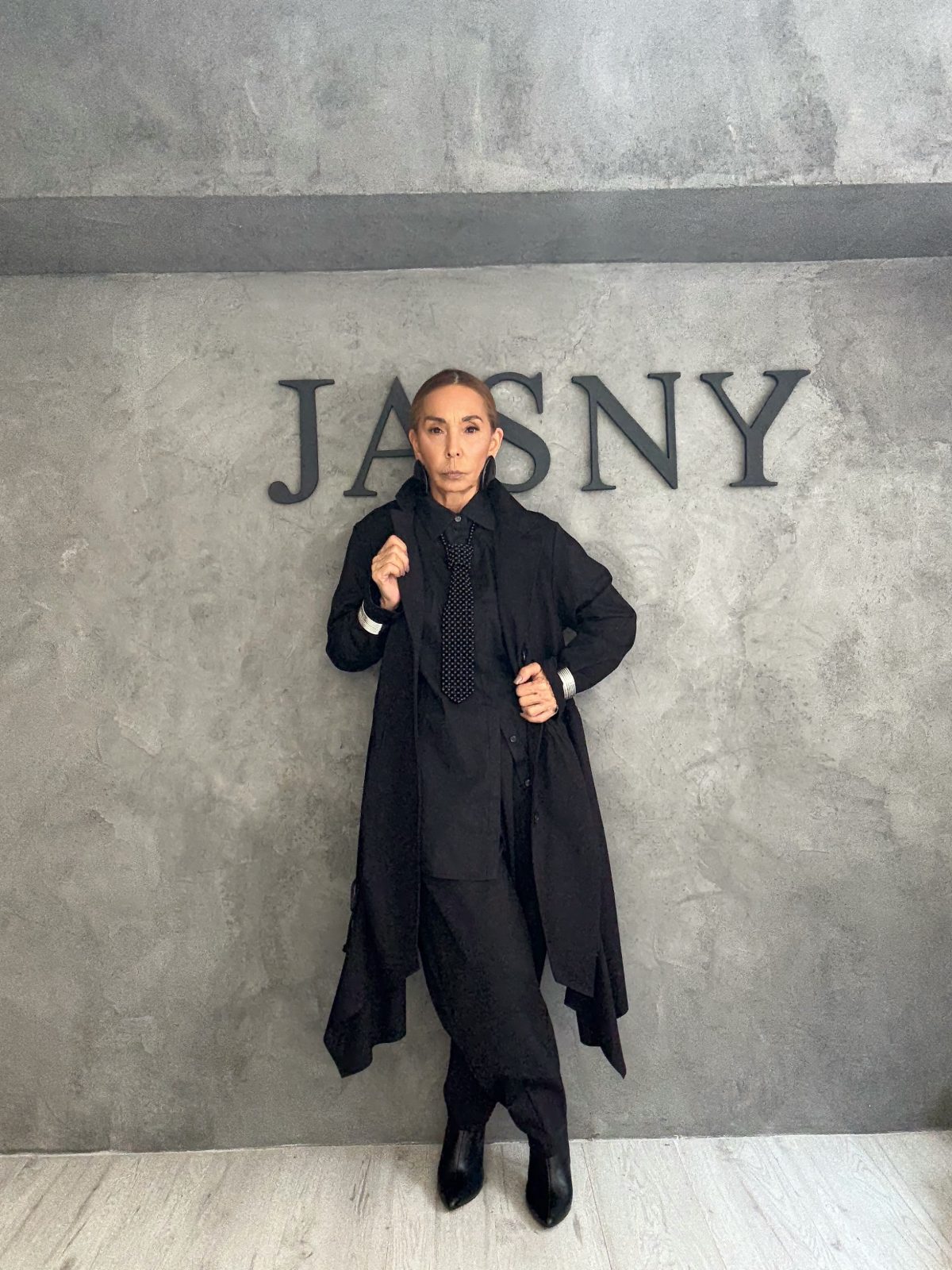 Ένα total black look που συνδυάζει το αυστηρό με το καλλιτεχνικό. Το μακρύ ασύμμετρο πανωφόρι με ρυθμιζόμενα κορδόνια και το πουκάμισο με πουά λεπτομέρειες, δίνουν δομή αλλά και κίνηση, δημιουργώντας ένα outfit που ακροβατεί ανάμεσα στο minimal και το avant-garde. Το look ολοκληρώνεται με tailored παντελόνι και μυτερά μαύρα παπούτσια, για απόλυτη αρμονία και statement χαρακτήρα.