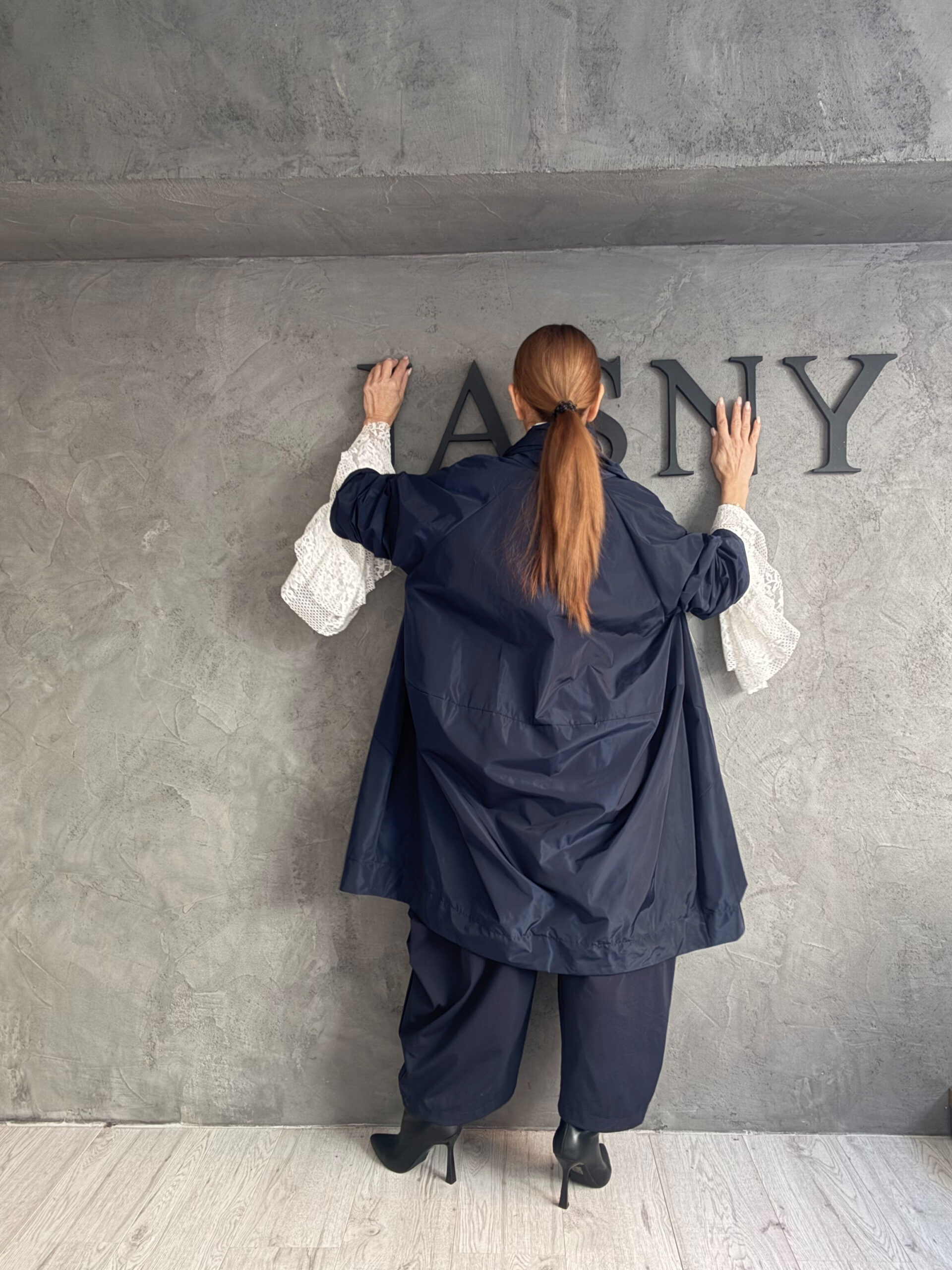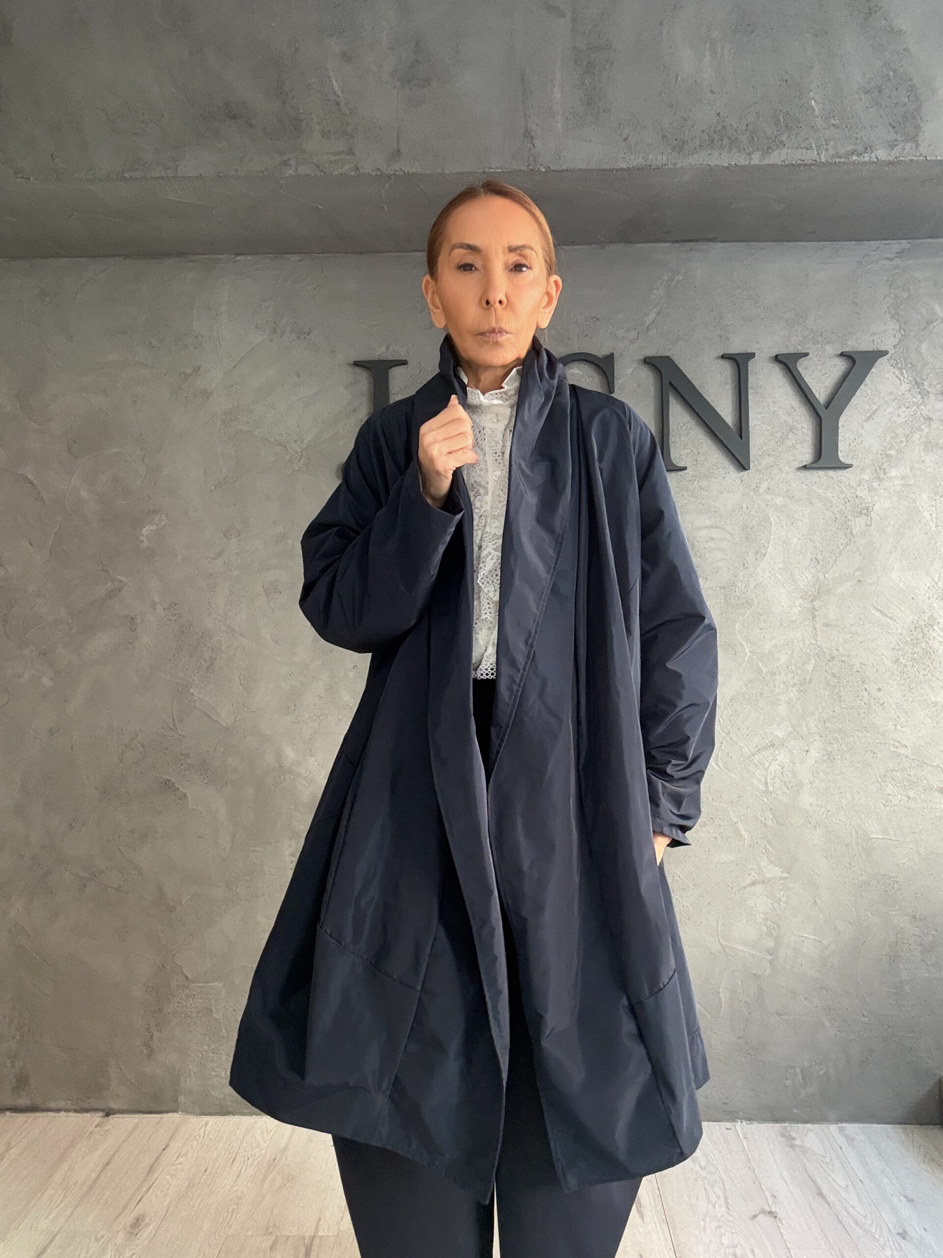 Αδιάβροχο πανωφόρι σε βαθιά μπλε απόχρωση, με καθαρή γραμμή και σύγχρονη, minimal αισθητική.