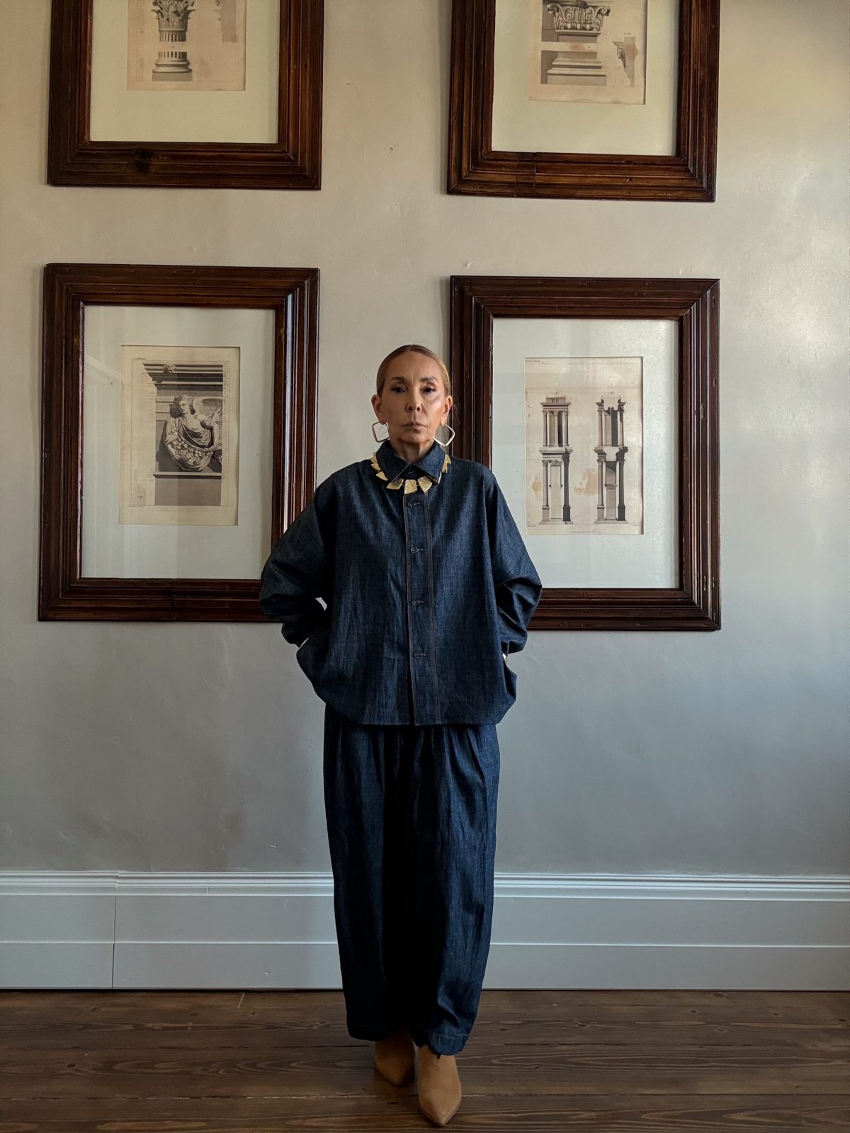 Ένα εντυπωσιακό total denim σύνολο σε σκούρα indigo απόχρωση που αποπνέει δυναμισμό και καλλιτεχνικό χαρακτήρα. Το oversize πουκάμισο συνδυάζεται με balloon παντελόνι με πιέτες, δημιουργώντας μια αρχιτεκτονική σιλουέτα που ισορροπεί ανάμεσα στην άνεση και την υψηλή αισθητική. Το statement κολιέ με γεωμετρικές χρυσές πλάκες και οι μεταλλικές λεπτομέρειες στα μανίκια προσθέτουν πολυτέλεια και λάμψη, ενώ τα καστόρινα μπεζ μποτάκια «σπάνε» κομψά το total denim δίνοντας μοντέρνο χαρακτήρα. Ένα look που αποπνέει αυτοπεποίθηση, urban διάθεση και καλλιτεχνική φινέτσα.