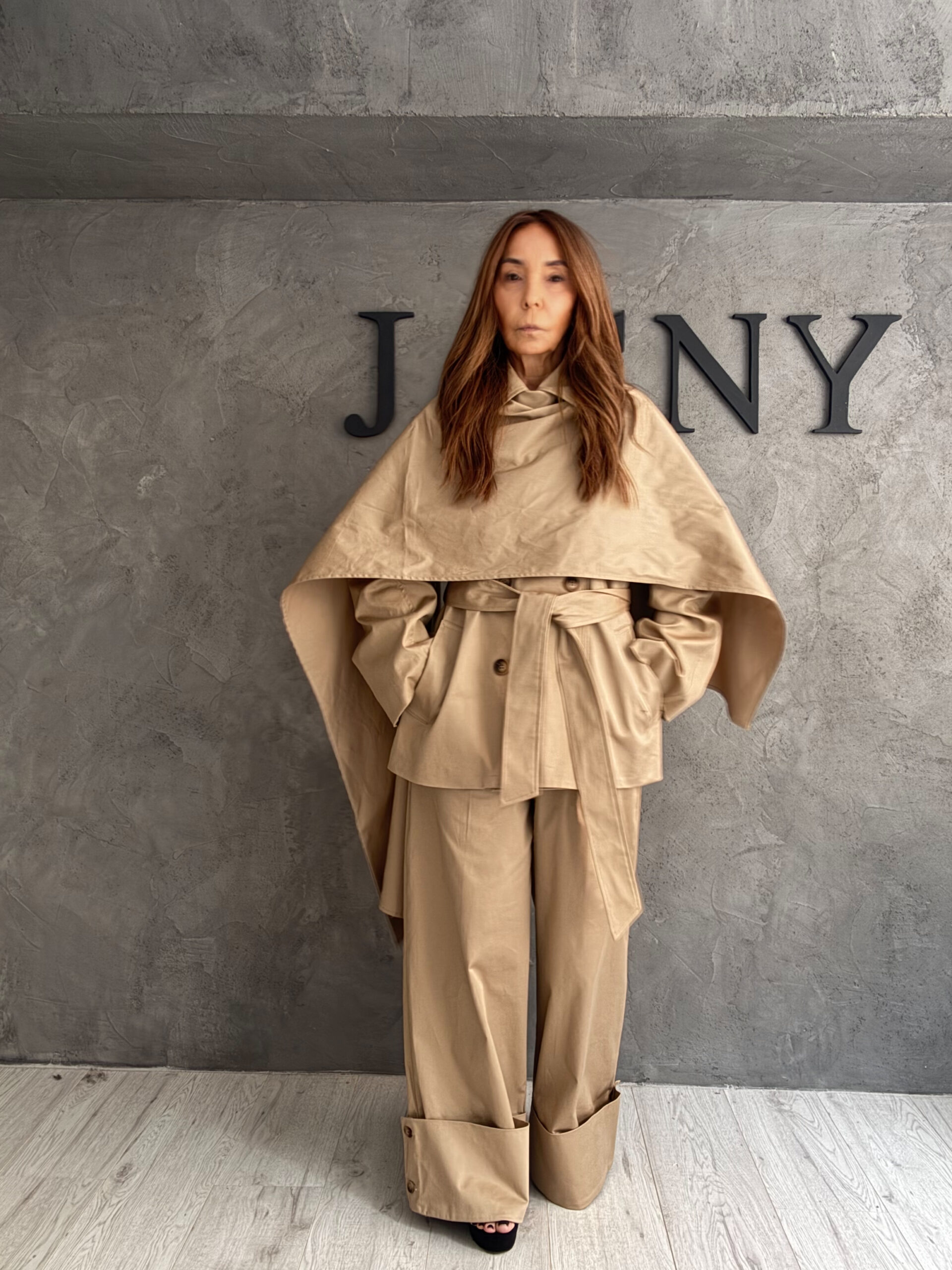 Ένα εντυπωσιακό total sand look που ισορροπεί ανάμεσα στη μίνιμαλ αρχιτεκτονική και τη σύγχρονη glam αισθητική. Το επάνω μέρος με cape-effect layering δημιουργεί έντονο όγκο και κίνηση, χαρίζοντας δυναμισμό και θεατρικότητα σε κάθε βήμα. Η δομημένη ζώνη στη μέση ορίζει τη σιλουέτα και προσθέτει ισορροπία, ενώ το wide παντελόνι με την βαριά πτώση δίνει ύψος, κομψότητα και fashion χαρακτήρα.
