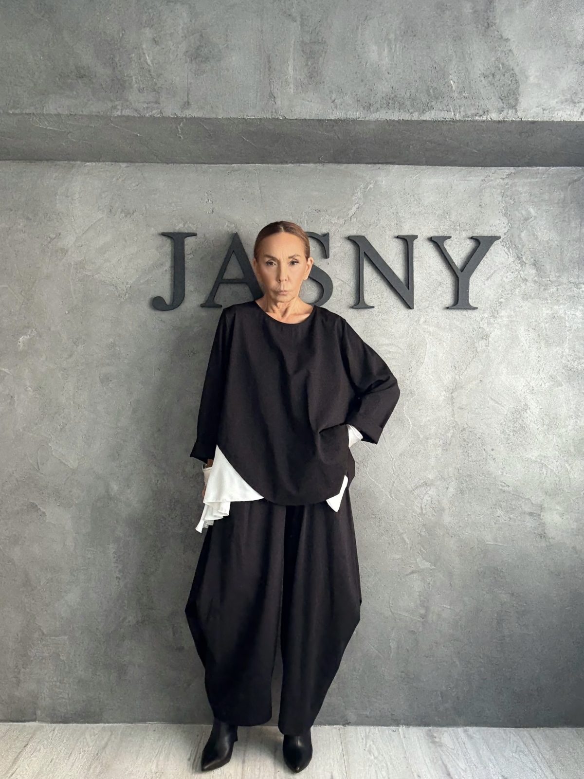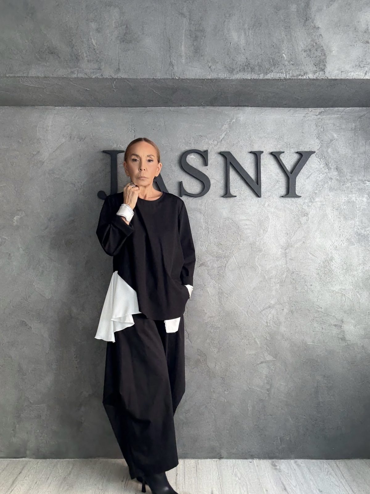 Ένα look που παίζει με την αντίθεση μαύρου και λευκού μέσα από minimal, αρχιτεκτονικές γραμμές. Η ασύμμετρη μπλούζα με το λευκό layer ξεχωρίζει ως το καλλιτεχνικό στοιχείο του outfit, ενώ το φαρδύ μαύρο παντελόνι συνεχίζει την oversized σιλουέτα με ροή και άνεση. Το αποτέλεσμα είναι σύγχρονο, avant-garde και διαχρονικά κομψό, ιδανικό για εμφανίσεις που συνδυάζουν στυλ και άνεση.