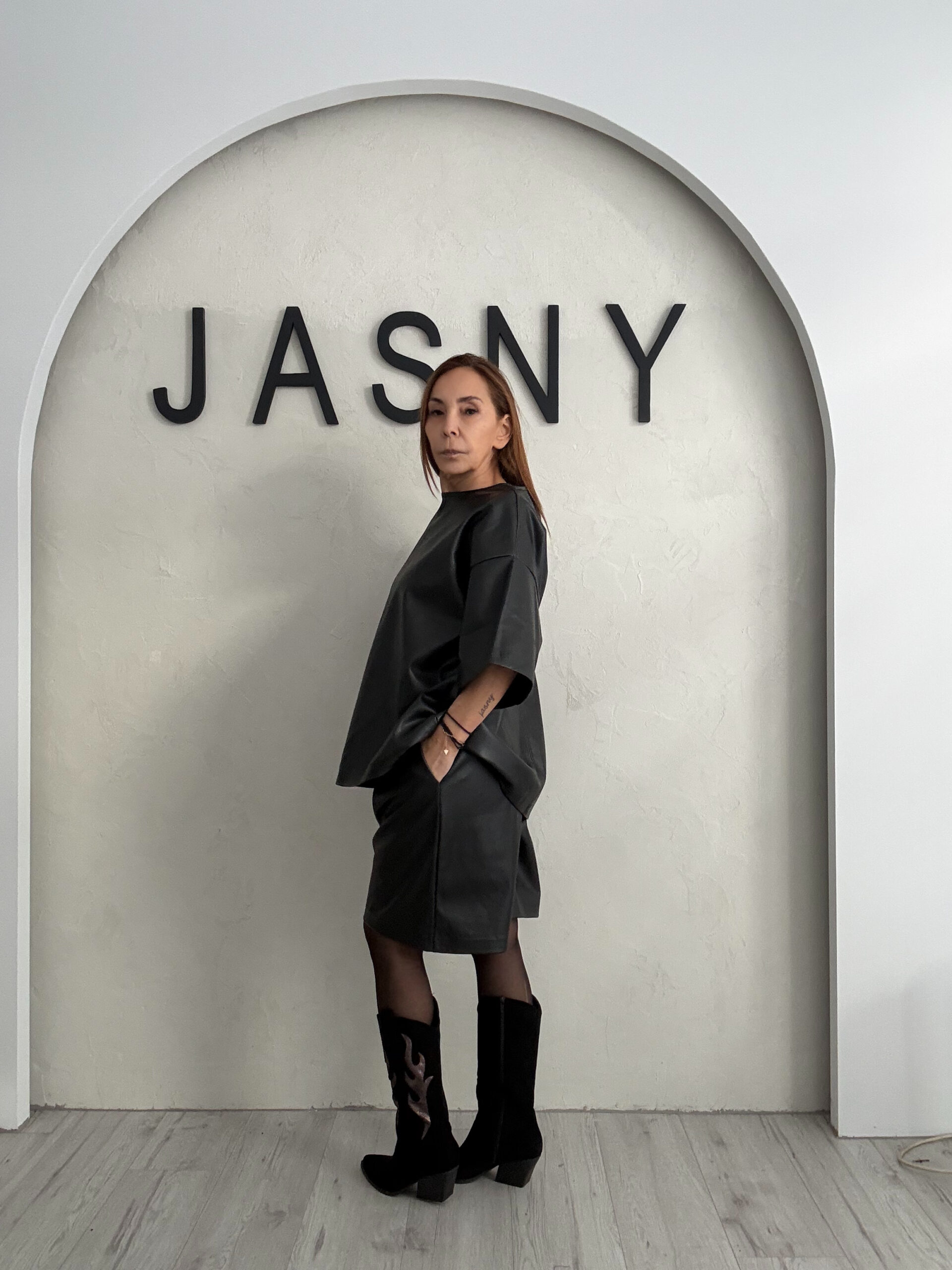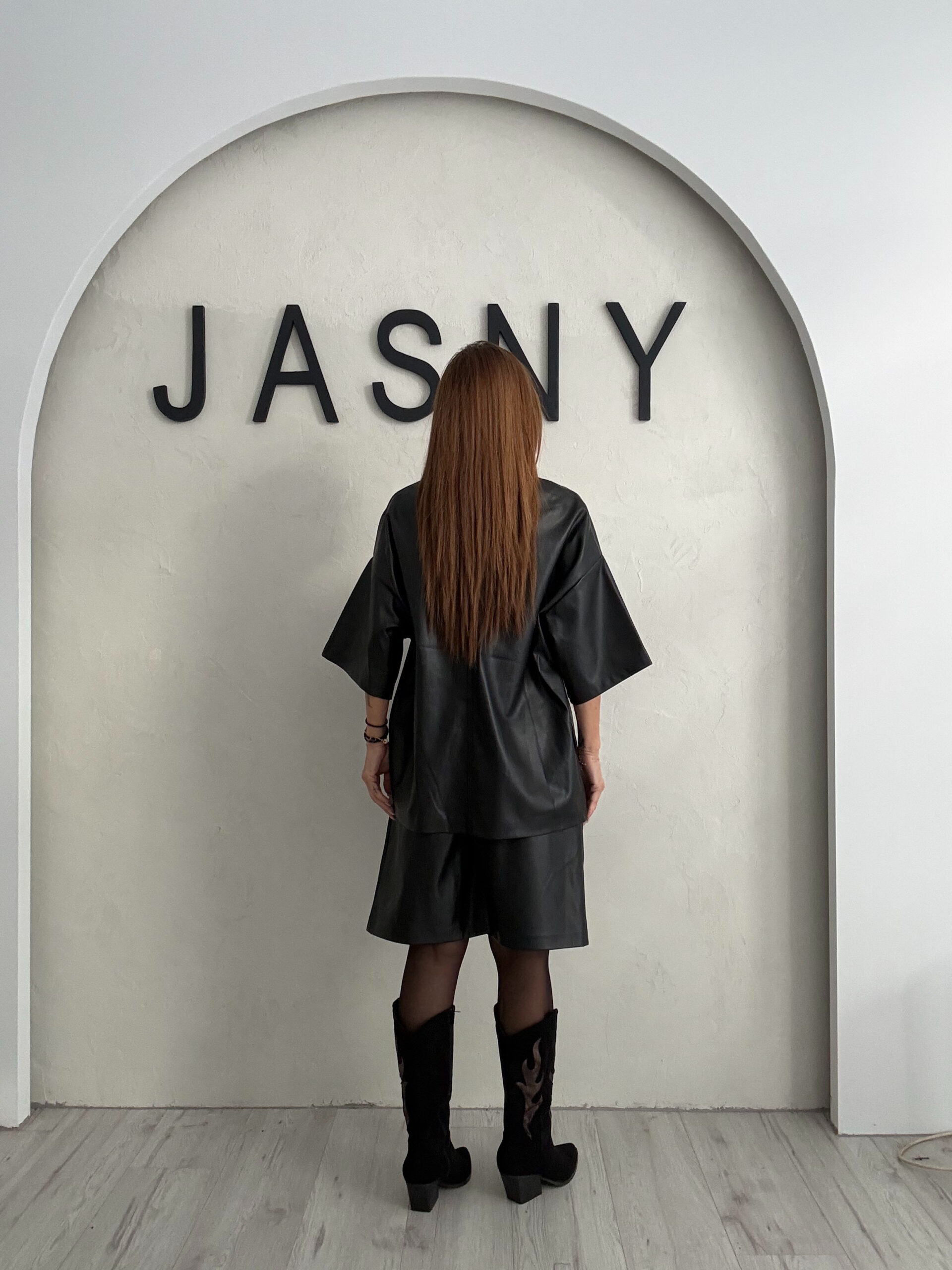 Η ματ δερμάτινη όψη προσθέτει ένταση χωρίς υπερβολή, καθιστώντας το σετ ιδανικό για γυναίκες που επιλέγουν καθαρές γραμμές και statement αισθητική.
