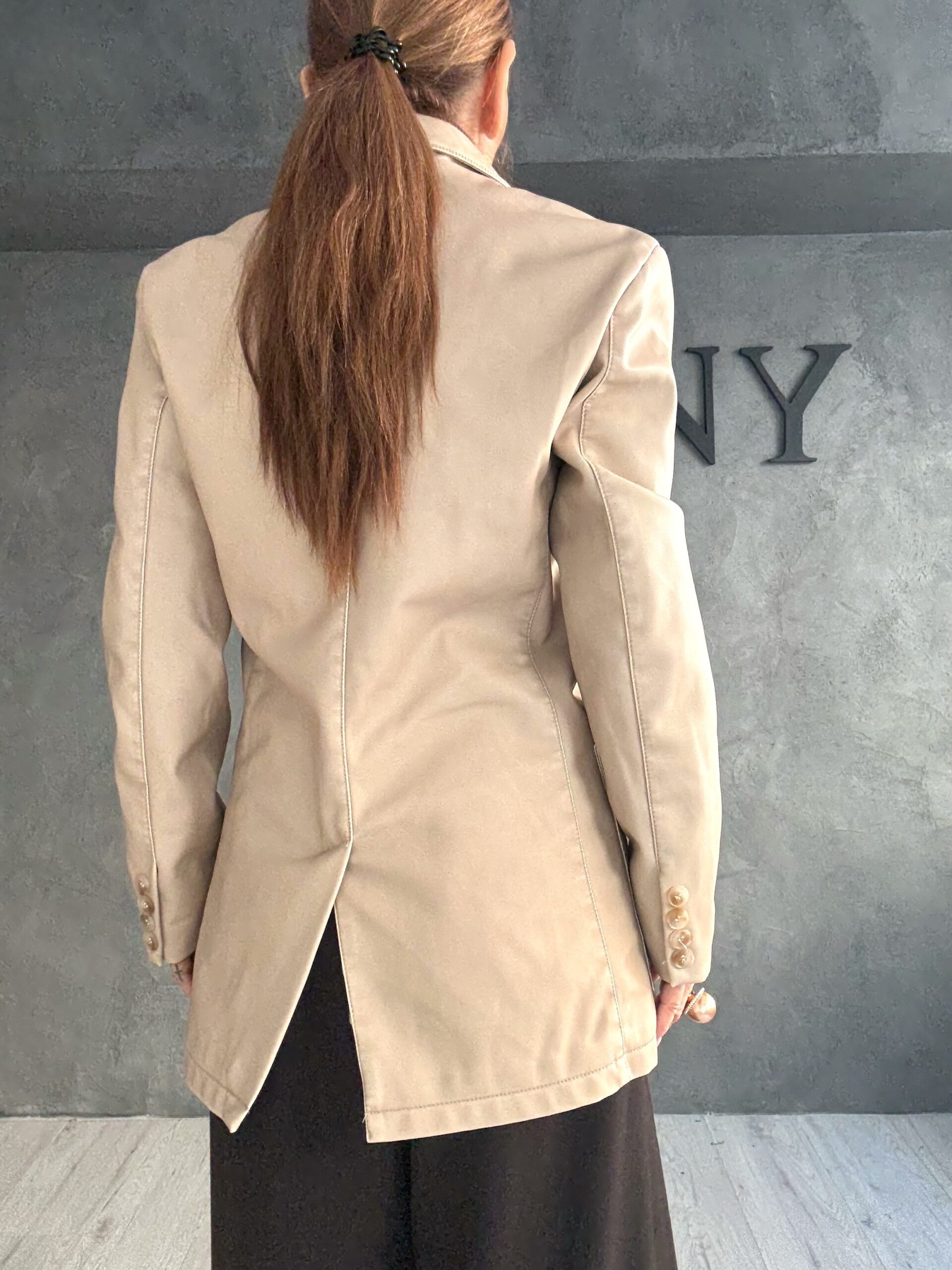 Σακάκι σε απαλή Εκρού απόχρωση με διαχρονικό κόψιμο. Αγκαλιάζει το σώμα χωρίς να το πιέζει, δίνοντας κομψότητα και ισορροπία στη σιλουέτα. Ένα κομμάτι που λειτουργεί τόσο καθημερινά όσο και σε πιο προσεγμένες εμφανίσεις, αναδεικνύοντας τη δύναμη της απλότητας.