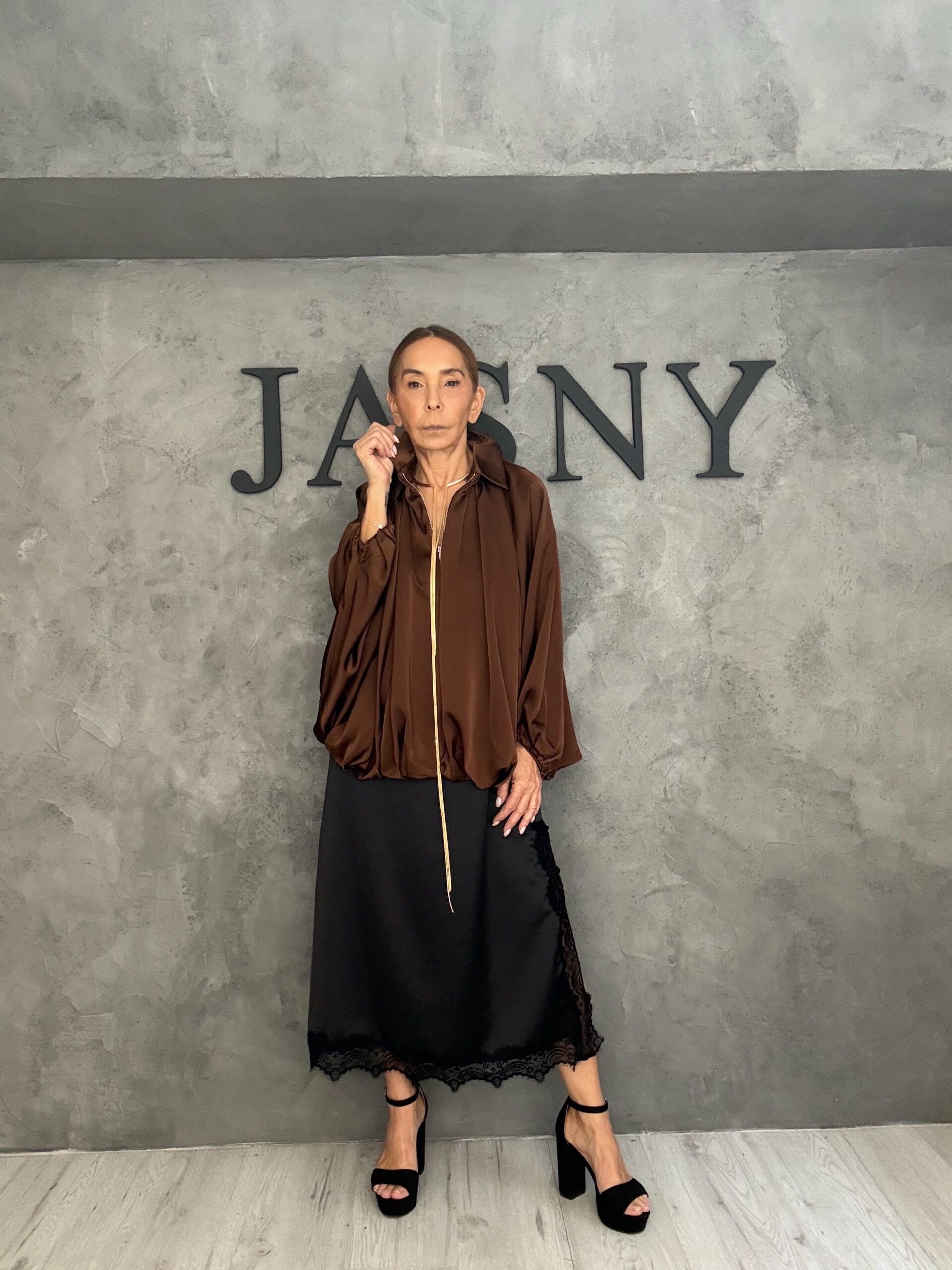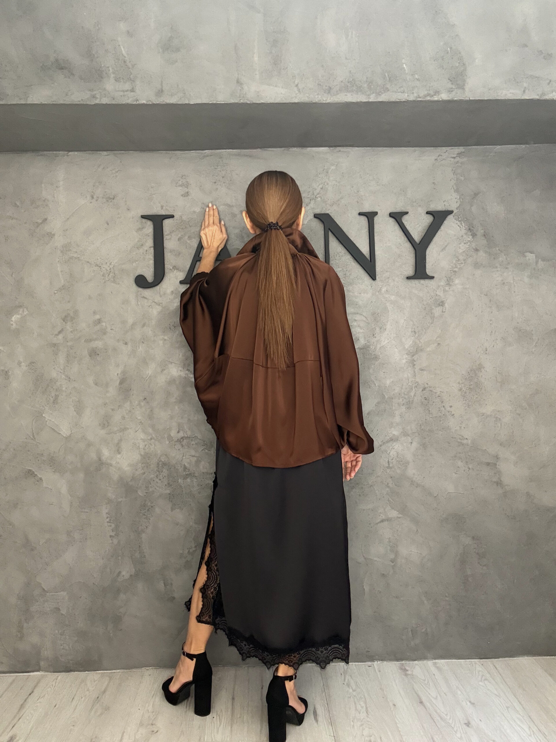 Η σοκολατί μπλούζα, με τη χαλαρή αλλά ελεγχόμενη φόρμα της, δημιουργεί έναν ήρεμο όγκο που αγκαλιάζει το σώμα χωρίς να το περιορίζει. Η κίνηση του υφάσματος δίνει βάθος στο πάνω μέρος, ενώ το μαύρο midi φόρεμα με τη διακριτική δαντέλα λειτουργεί ως αντίβαρο: σταθερή, αυστηρή, με λεπτομέρεια που αποκαλύπτεται μόνο από κοντά.