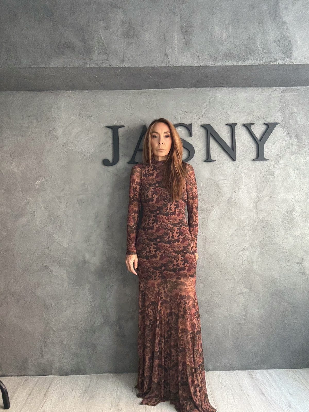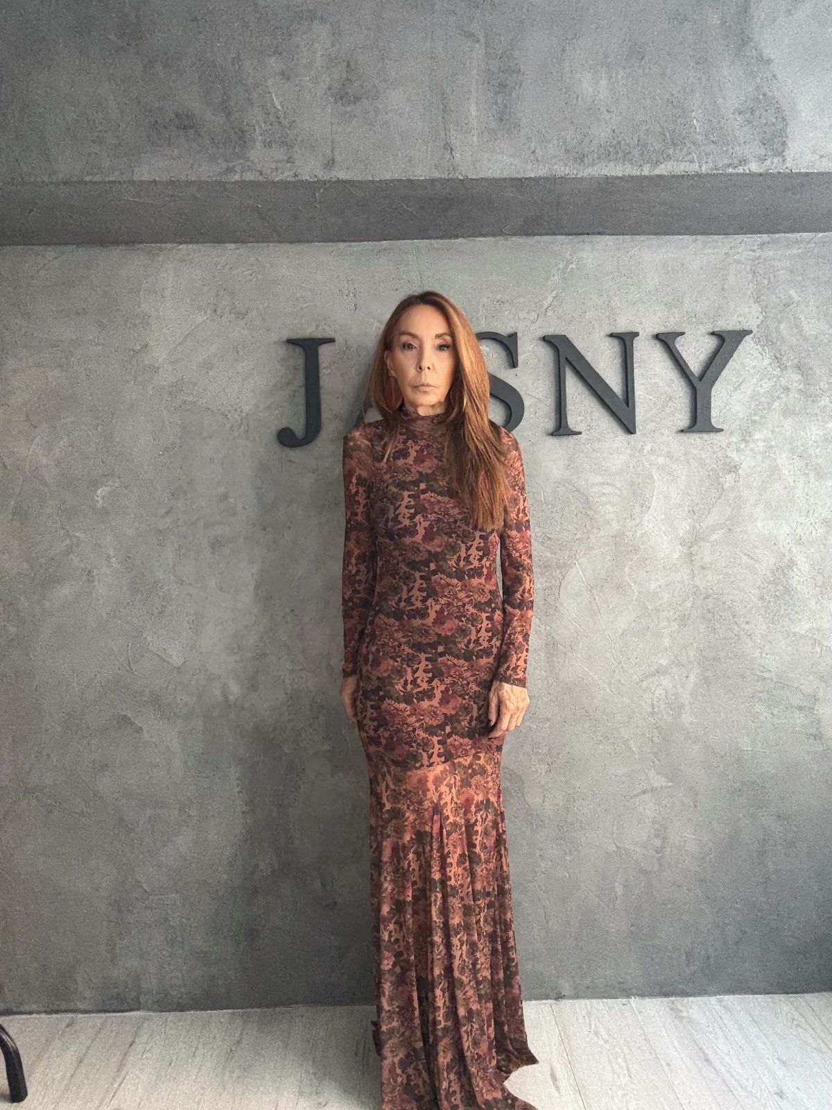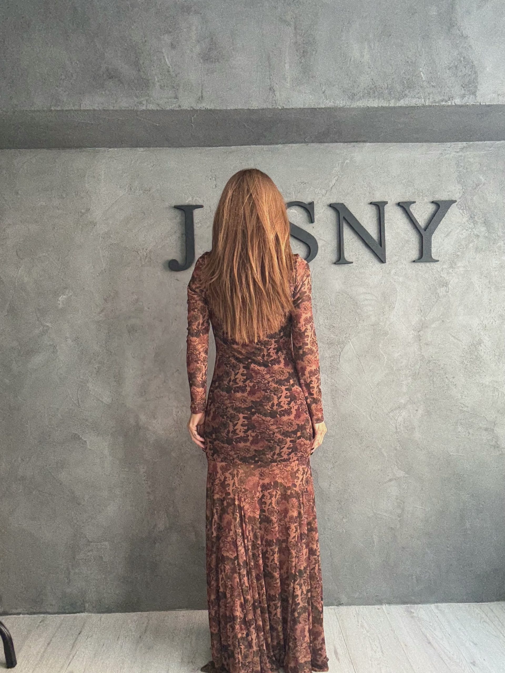 Μακρύ φόρεμα με στενή γραμμή, μακριά μανίκια και ψηλό λαιμό, σε γήινες αποχρώσεις τερακότας, καφέ και βυσσινί. Το ανάγλυφο φλοράλ μοτίβο χαρίζει βάθος και δραματικότητα, ενώ η ρευστή φούστα προσδίδει κίνηση και αέρινη κομψότητα. Ιδανικό για εμφανίσεις που θέλουν να συνδυάσουν μυστήριο με ρομαντική διάθεση.