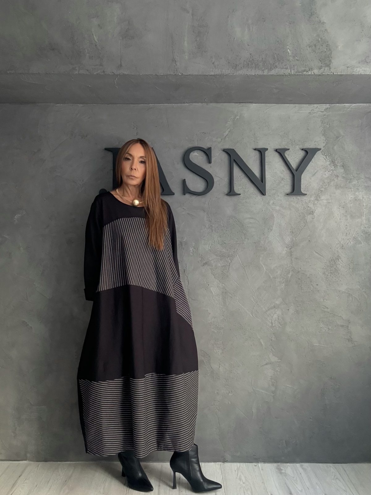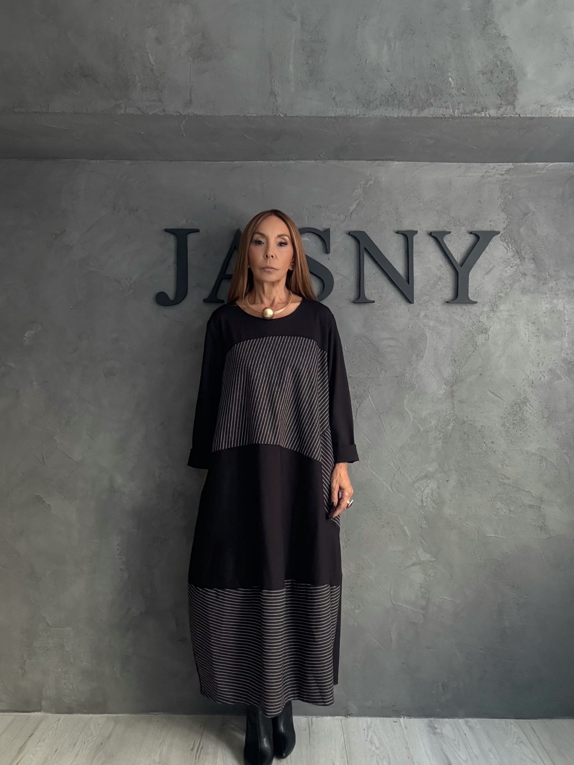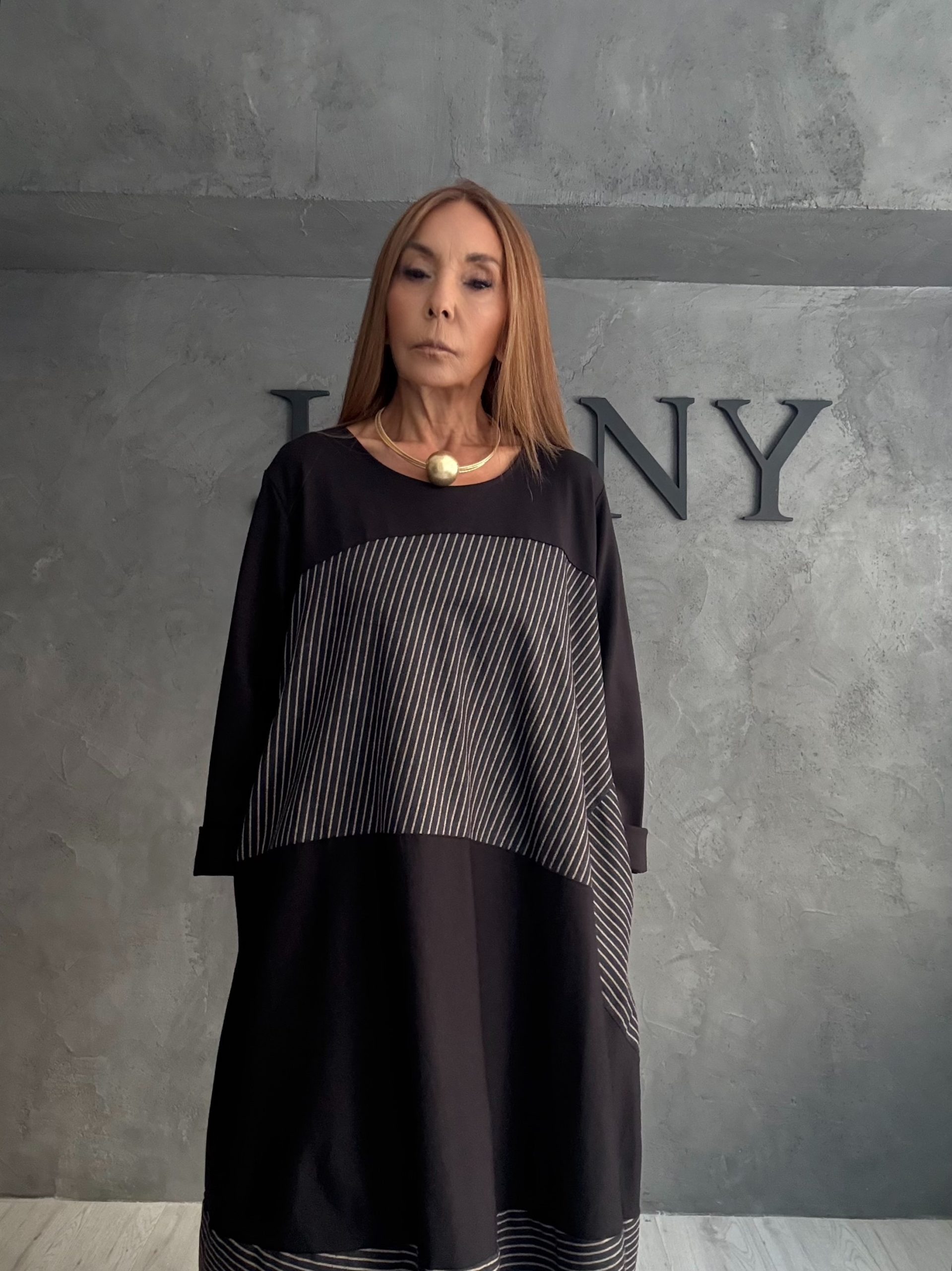 Μακρύ oversized φόρεμα σε μαύρη βάση με γεωμετρικά κοψίματα και ριγέ λεπτομέρειες σε γκρι αποχρώσεις. Η loose γραμμή του χαρίζει άνεση και minimal κομψότητα, ενώ οι διακριτικές ρίγες δημιουργούν ενδιαφέρον και κάθετη κίνηση. Ιδανικό για εμφανίσεις που συνδυάζουν άνεση με σοφιστικέ χαρακτήρα.
