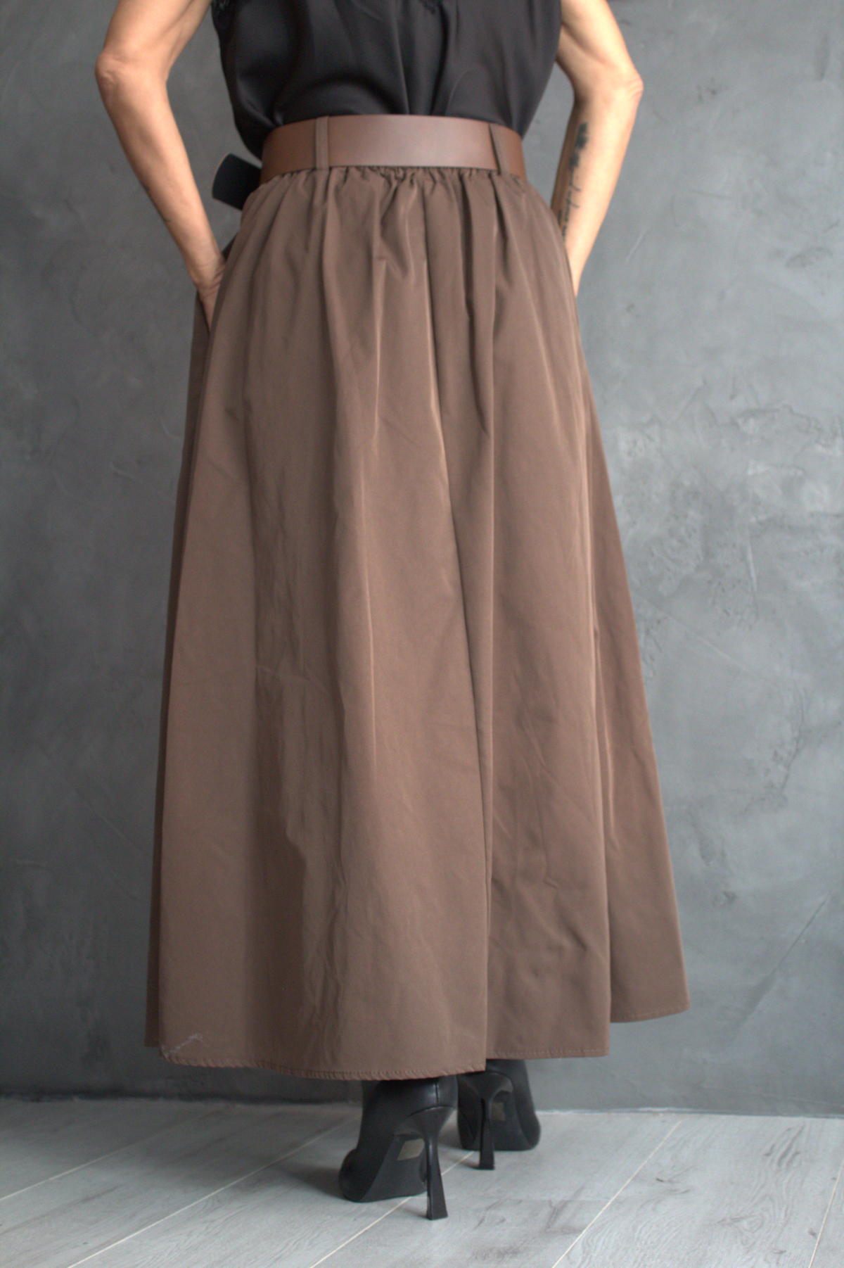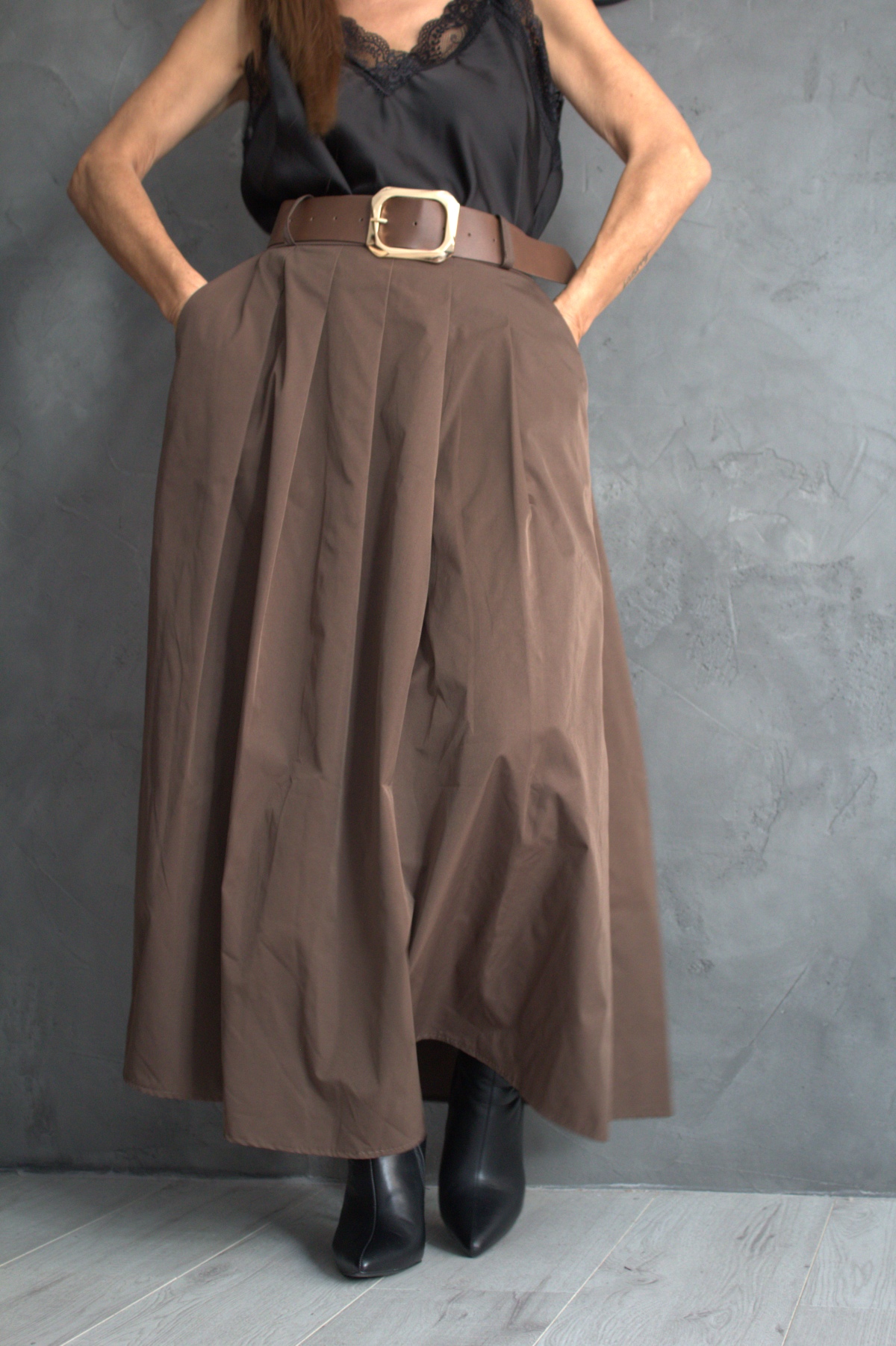 Μακριά φούστα σε γραμμή Α, σε βαθύ καφέ τόνο, με φαρδύ όγκο και ρευστή κίνηση. Η μέση τονίζεται με statement ζώνη με χρυσή αγκράφα, που σπάει τη μονοχρωμία και προσδίδει πολυτέλεια. Το ύφασμα έχει δομημένη αλλά ανάλαφρη υφή, ιδανική για minimal και chic εμφανίσεις.