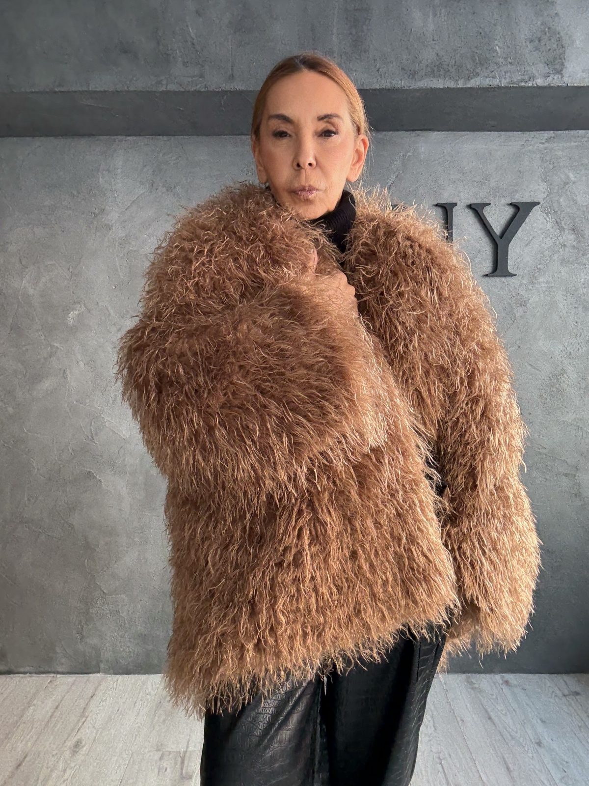 Statement γούνινο τζάκετ σε απόχρωση κανέλας, με πλούσια αφράτη υφή που θυμίζει σύννεφο. Η κοντή γραμμή του αγκαλιάζει τους ώμους προσφέροντας όγκο και στιλ, ενώ το απαλό του ύφασμα χαρίζει αίσθηση πολυτέλειας και ζεστασιάς. Ιδανικό για layering πάνω από πλεκτά, σατέν πουκάμισα ή total black outfits.