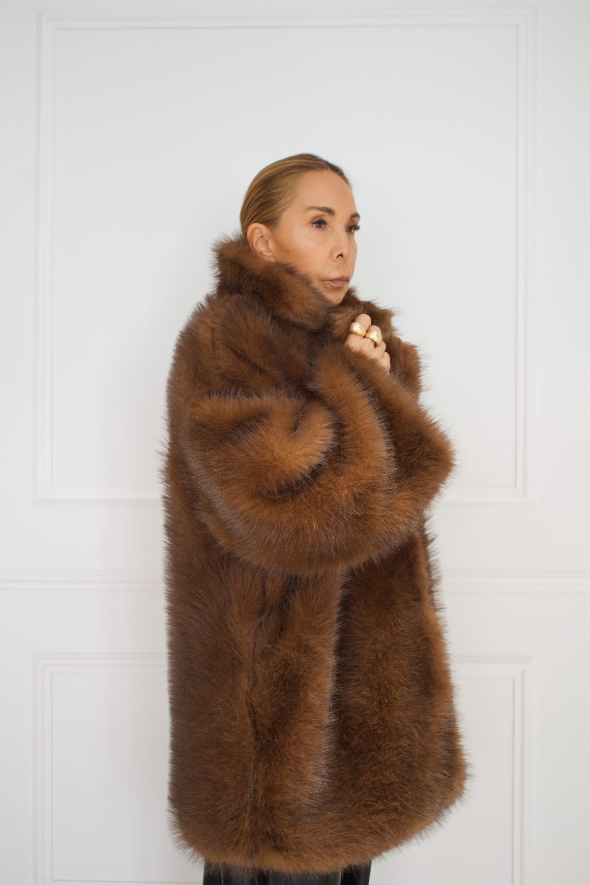 Εντυπωσιακή faux γούνα σε πλούσια απόχρωση κονιάκ, με extra-volume σιλουέτα και απαλή, γυαλιστερή υφή που χαρίζει αίσθηση πολυτέλειας. Η δομή της θυμίζει vintage couture αισθητική, ενώ το μήκος και το φαρδύ πέτο δημιουργούν ένα statement outerwear κομμάτι που απογειώνει κάθε εμφάνιση. Η άνετη γραμμή προσφέρει ευκολία στις κινήσεις και ζεστασιά, ιδανική για βραδινές ή street-chic εμφανίσεις.