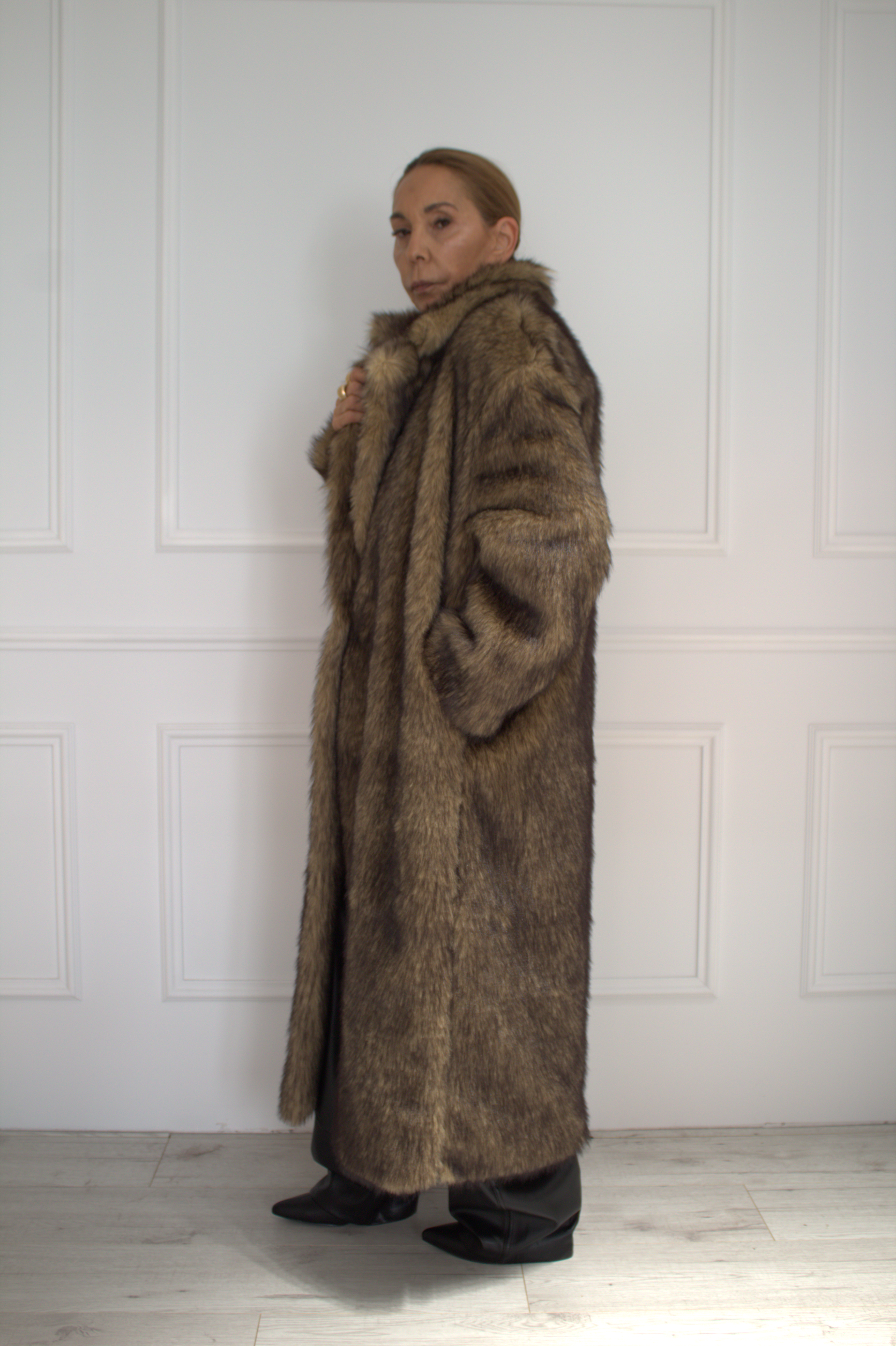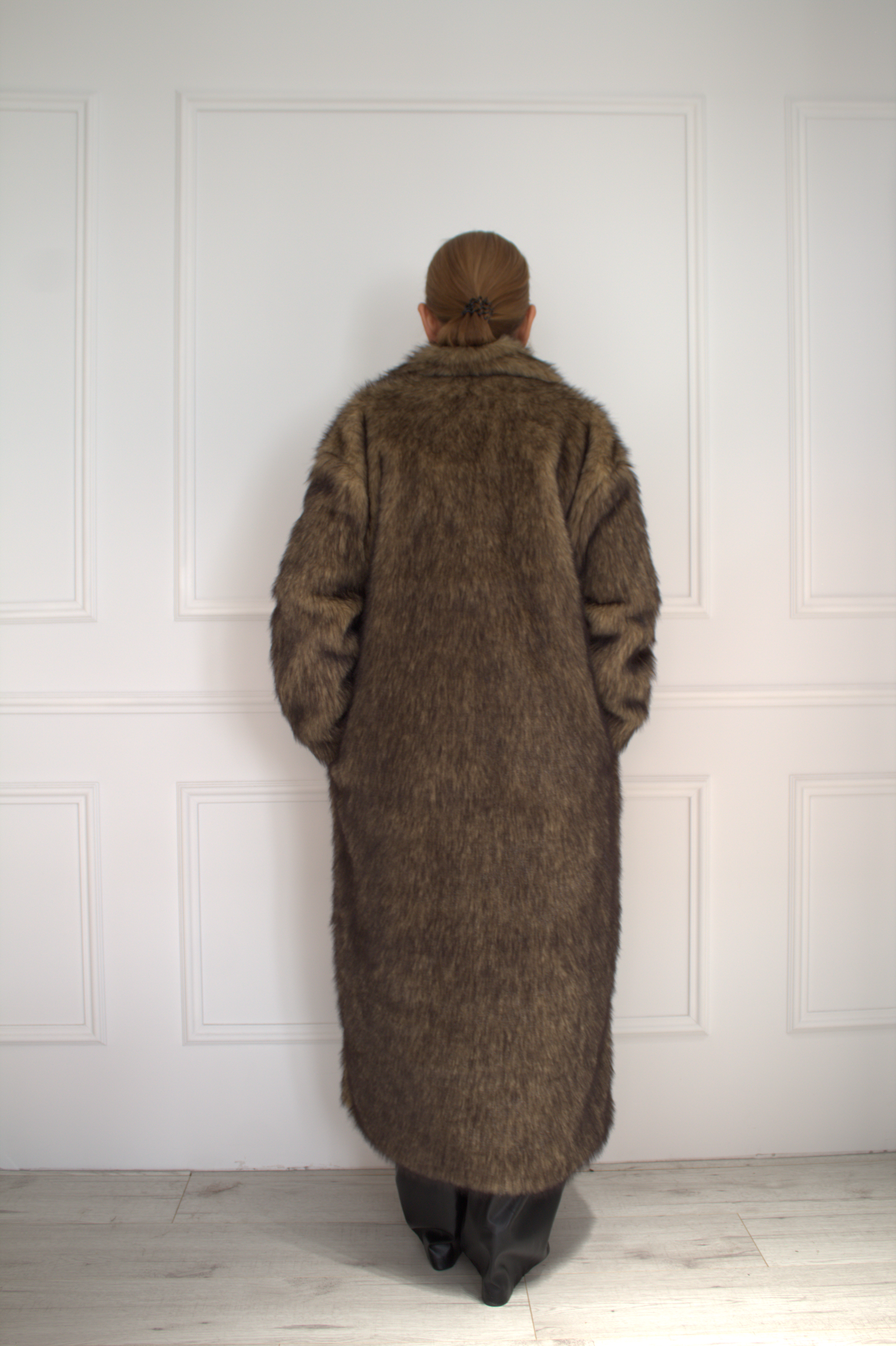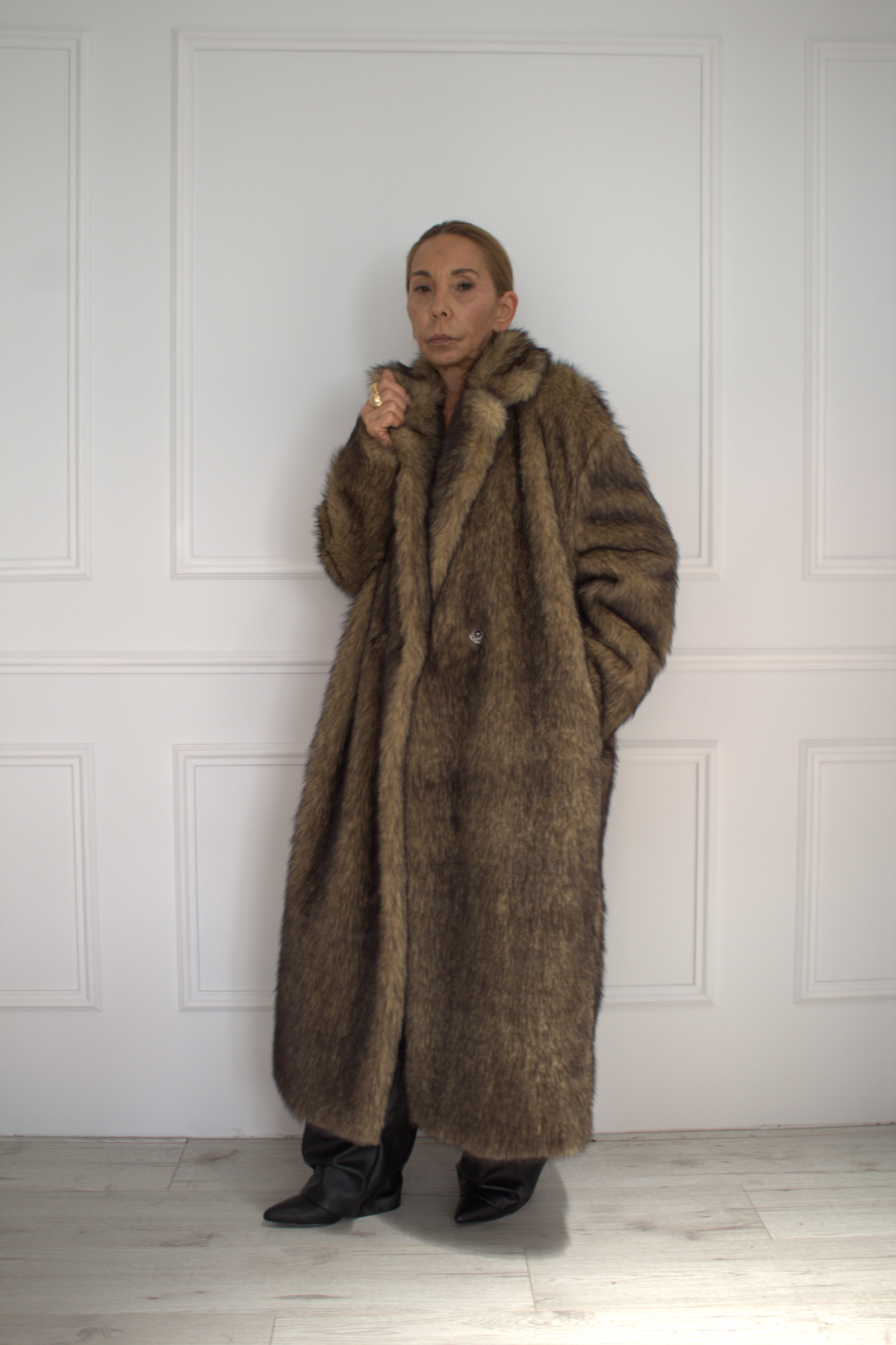 Πολυτελές μακρύ παλτό από συνθετική γούνα σε φυσικές αποχρώσεις καφέ και γκρι, με statement γιακά και oversized εφαρμογή. Η υφή του θυμίζει vintage glamour, ενώ η ρευστή γραμμή του προσδίδει αβίαστη κομψότητα και αίσθηση πολυτέλειας. Θερμό, άνετο και απόλυτα εντυπωσιακό, το συγκεκριμένο κομμάτι είναι ιδανικό για εκείνες που θέλουν να ξεχωρίζουν.