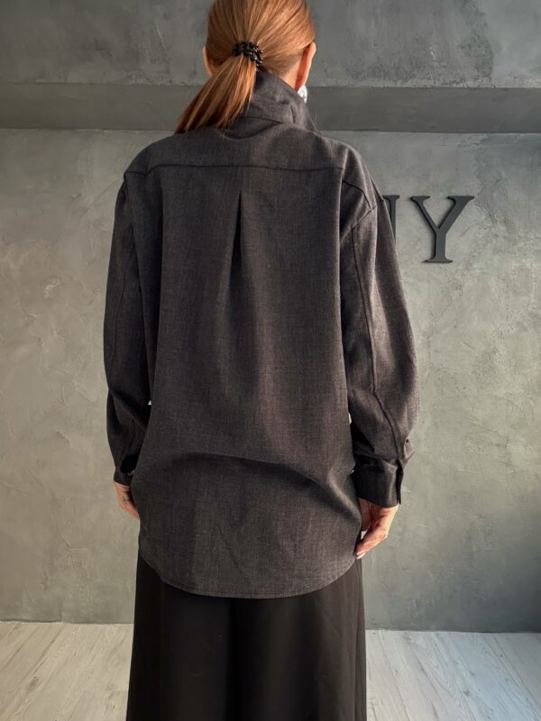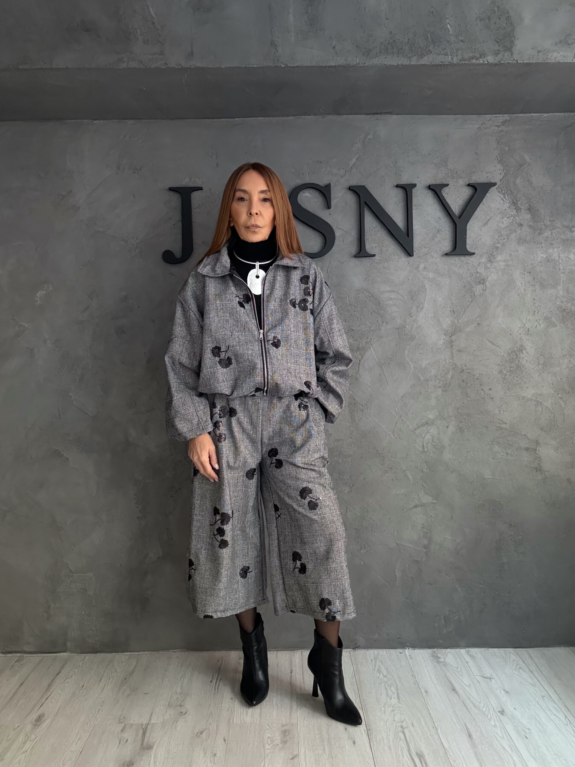Η γκρι υφή λειτουργεί ως ουδέτερη βάση, πάνω στην οποία τα μαύρα ανάγλυφα μοτίβα προσθέτουν βάθος και εικαστική λεπτομέρεια. Το αποτέλεσμα είναι ένα σετ με διακριτική ένταση, σχεδιασμένο για εμφανίσεις που δεν χρειάζονται υπερβολή για να ξεχωρίσουν. Φοριέται άνετα από το πρωί έως το απόγευμα, προσαρμοζόμενο στο styling και τη διάθεση.