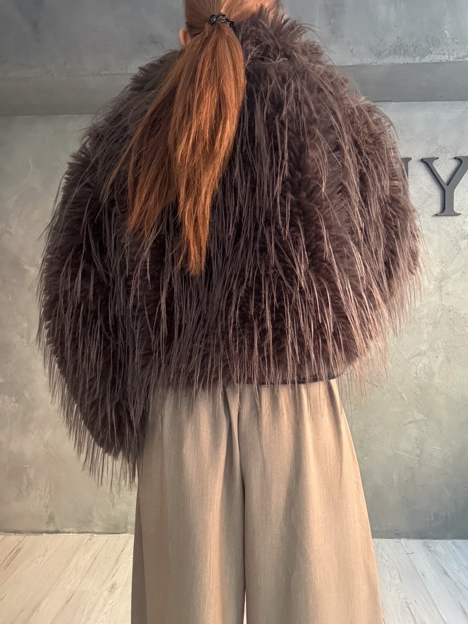 Πανωφόρι με έντονη ανάγλυφη υφή και πλούσιο όγκο, που αγκαλιάζει το σώμα δημιουργώντας ένα επιβλητικό αλλά refined αποτέλεσμα. Η faux fur επιφάνεια χαρίζει βάθος και κίνηση, ενώ η κοντή, structured γραμμή κρατά το look σύγχρονο και ισορροπημένο.