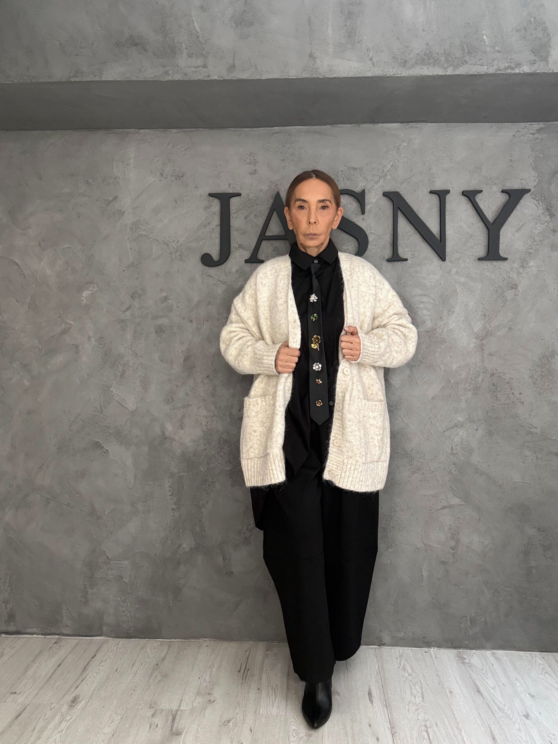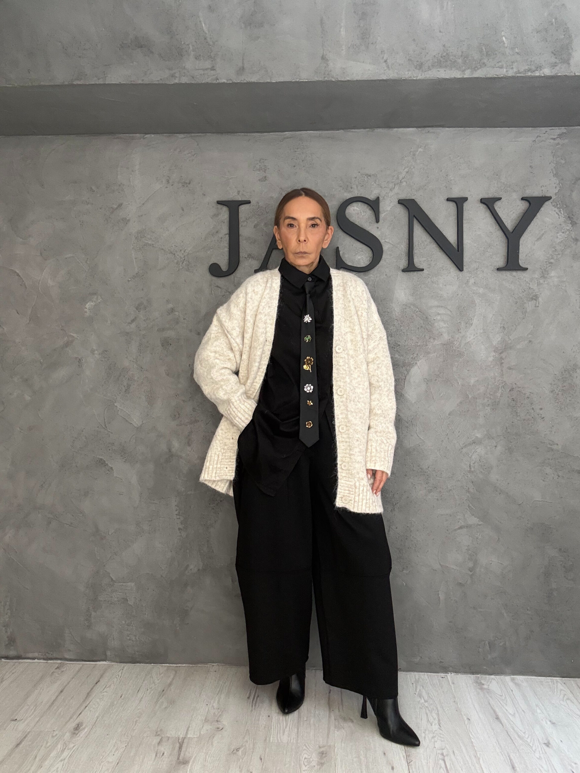 Ένα σύνολο που βασίζεται στην ισορροπία ανάμεσα στο απαλό και το αυστηρό. Η πλεκτή ζακέτα σε ivory απόχρωση προσθέτει ζεστασιά και υφή, ενώ λειτουργεί ως αντίβαρο στα μαύρα, δομημένα κομμάτια που βρίσκονται από κάτω. Το μαύρο πουκάμισο και η statement γραβάτα δημιουργούν κάθετη γραμμή και καθαρότητα, δίνοντας χαρακτήρα στο look χωρίς υπερβολή.