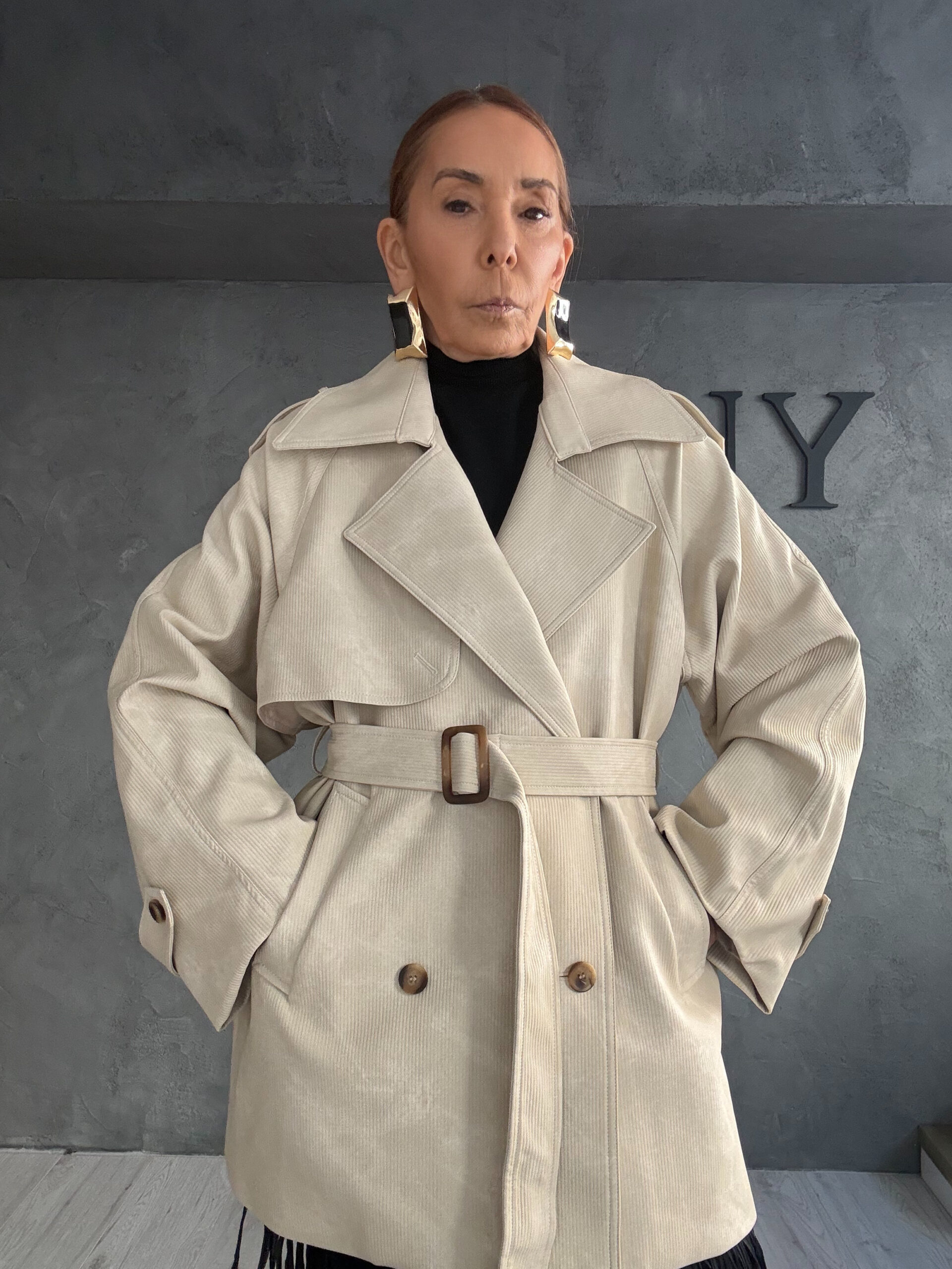 Πανωφόρι σε ουδέτερο μπεζ τόνο, σχεδιασμένο με μαλακή υφή και χαλαρή δομή που προσφέρει άνεση και διαχρονικό στυλ. Η ζώνη τονίζει τη μέση και επιτρέπει να προσαρμόσεις το fit, ενώ ο μεγάλος γιακάς και η διπλή σειρά κουμπιών χαρίζουν κλασικό χαρακτήρα. Οι καθαρές γραμμές και το κομψό μήκος το κάνουν ιδανικό για layering πάνω από πλεκτά ή λεπτές μπλούζες, δημιουργώντας ένα στιλάτο αλλά πρακτικό look για κάθε ημέρα.