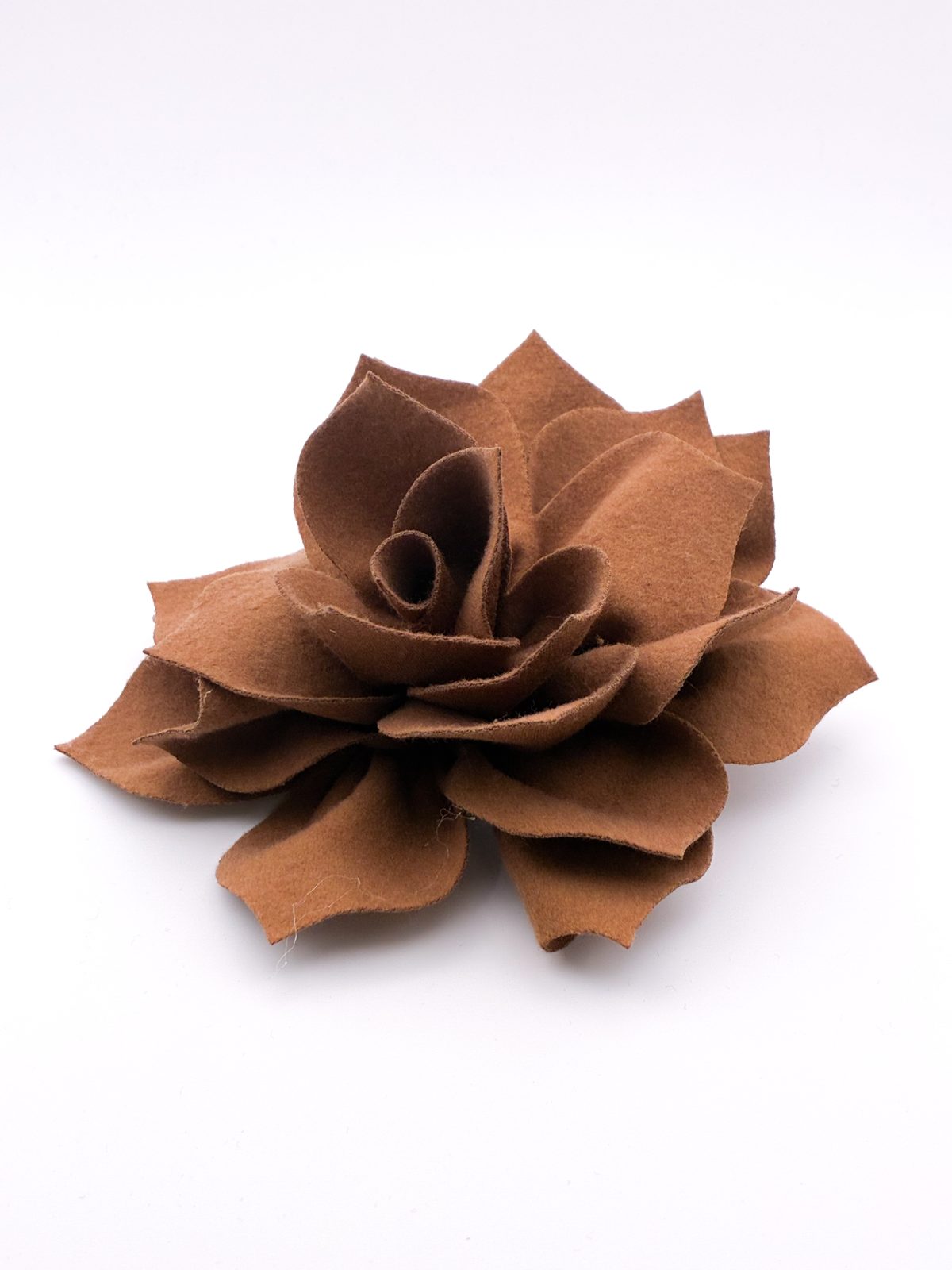 Μια κομψή καφέ καρφίτσα σε σχήμα λουλουδιού, φτιαγμένη από ύφασμα με μαλακή υφή. Τα προσεγμένα πέταλα δημιουργούν τρισδιάστατο εφέ, δίνοντας στο αξεσουάρ φυσικότητα αλλά και διαχρονική φινέτσα. Ένα statement κομμάτι που μπορεί να δώσει χαρακτήρα ακόμα και στο πιο απλό ντύσιμο.