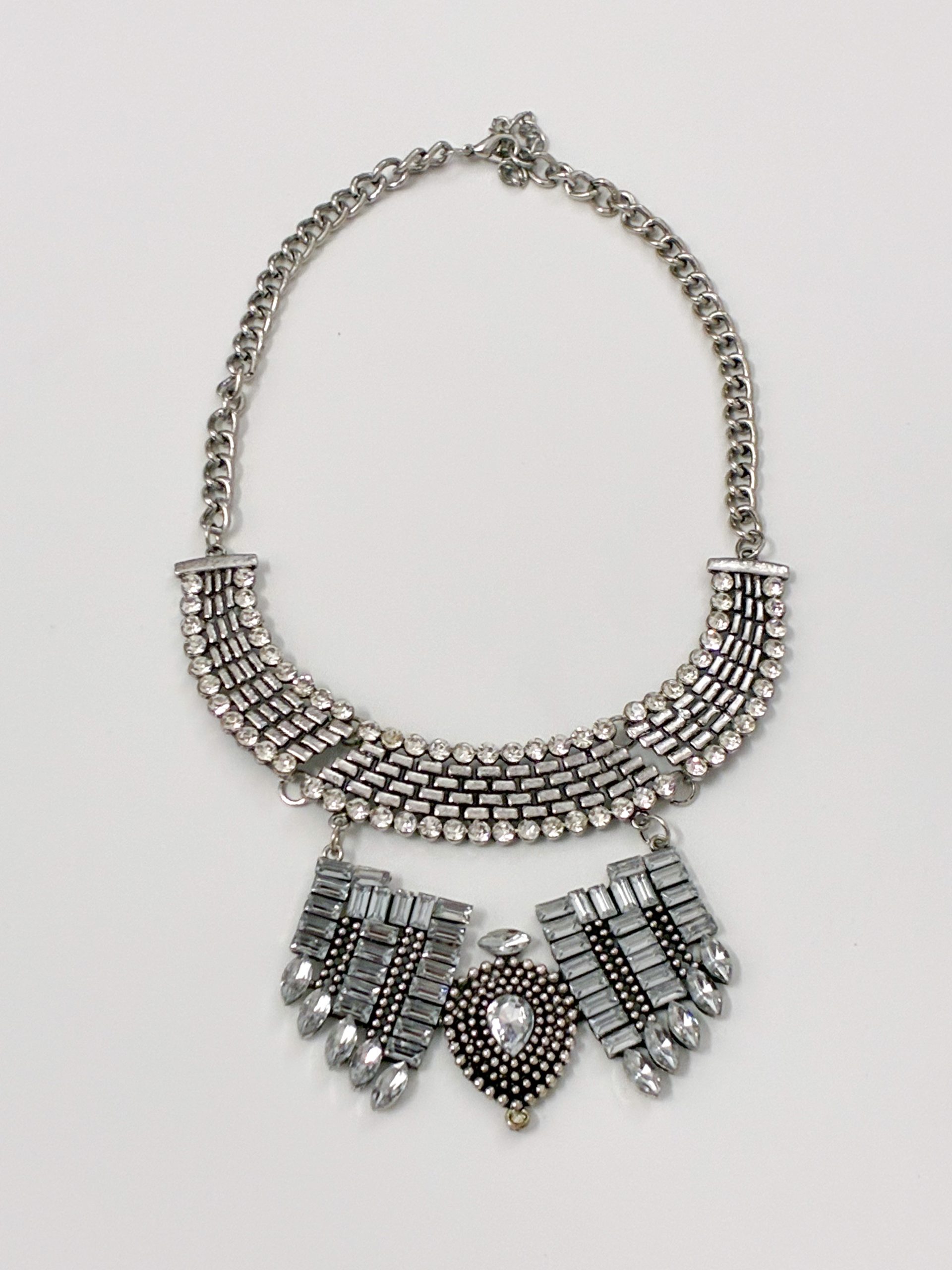 Statement κολιέ με πολυεπίπεδη, συμμετρική διακόσμηση από πέτρες και μεταλλικά στοιχεία. Αντλεί έμπνευση από tribal και art deco αισθητική, συνδυάζοντας τη λάμψη με αρχιτεκτονική δομή.